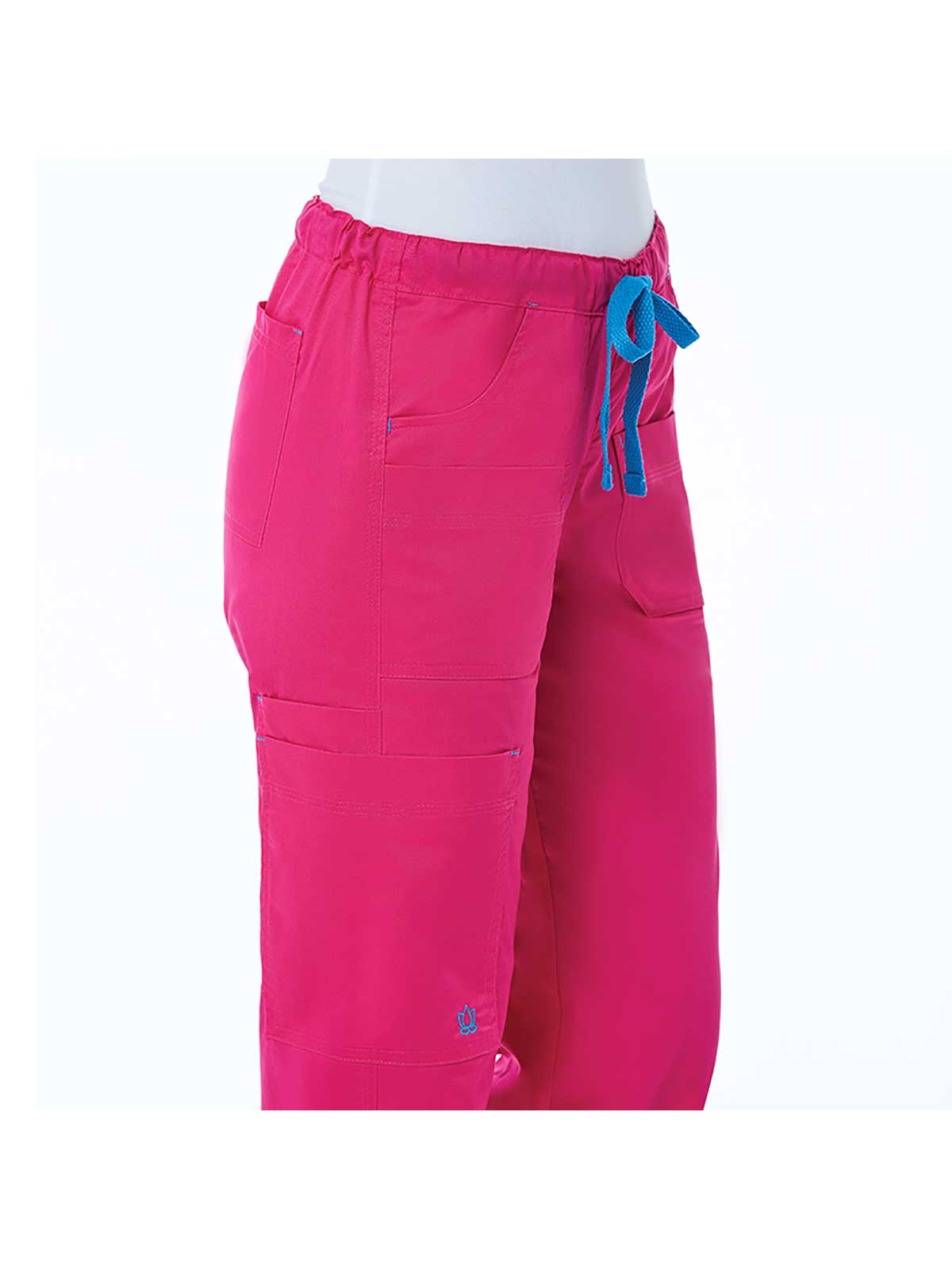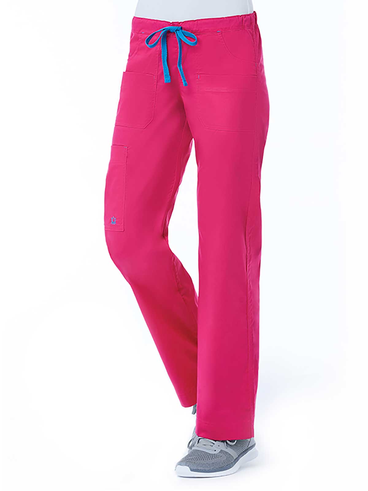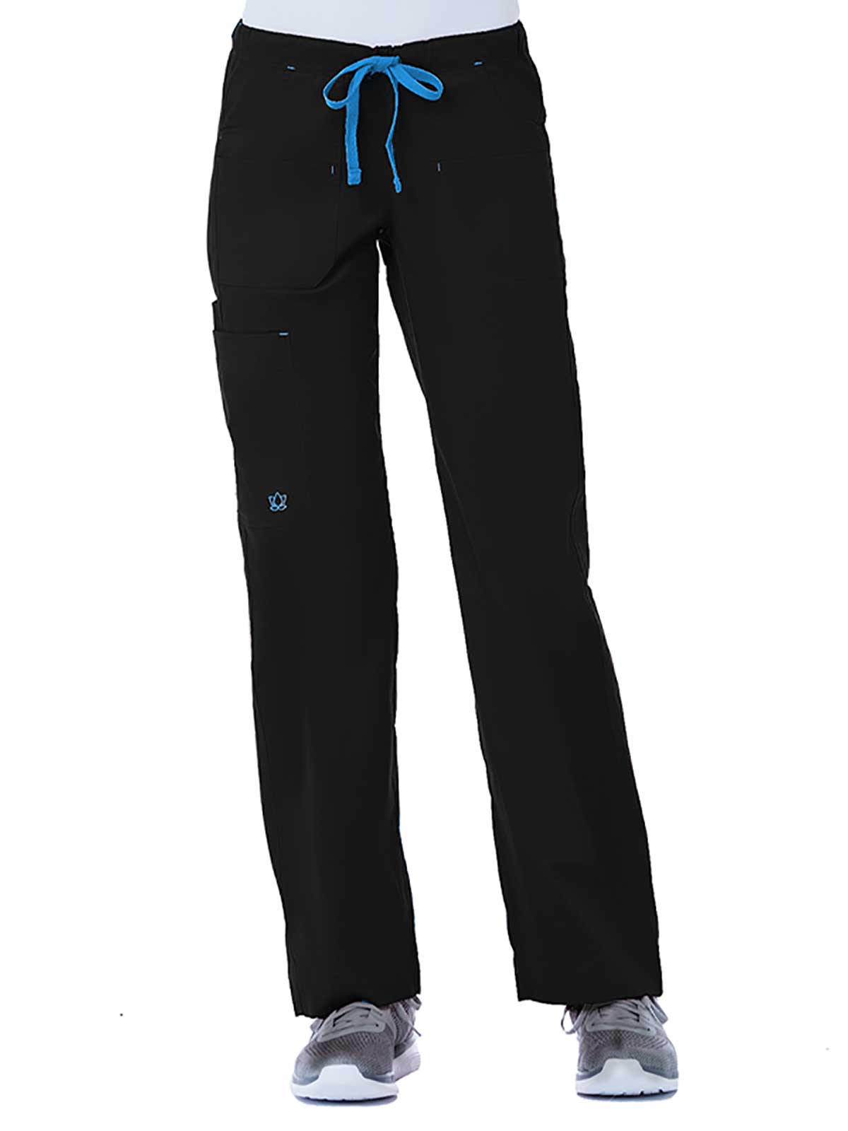 A Contemporary fit, low rise, straight leg pant features an elastic knit waistband and adjustable drawstring. Also featured are rib knit front and back yokes, angled front pockets, front leg seams with a zip closure cargo pocket, one back patch...