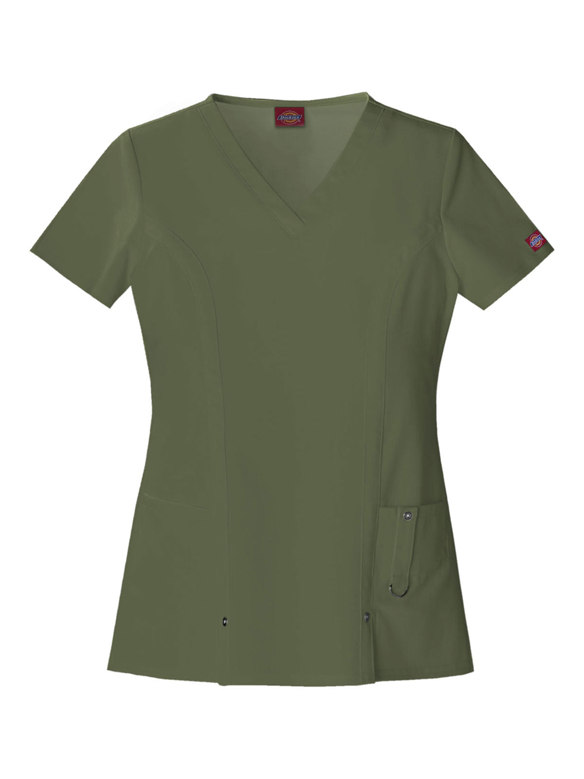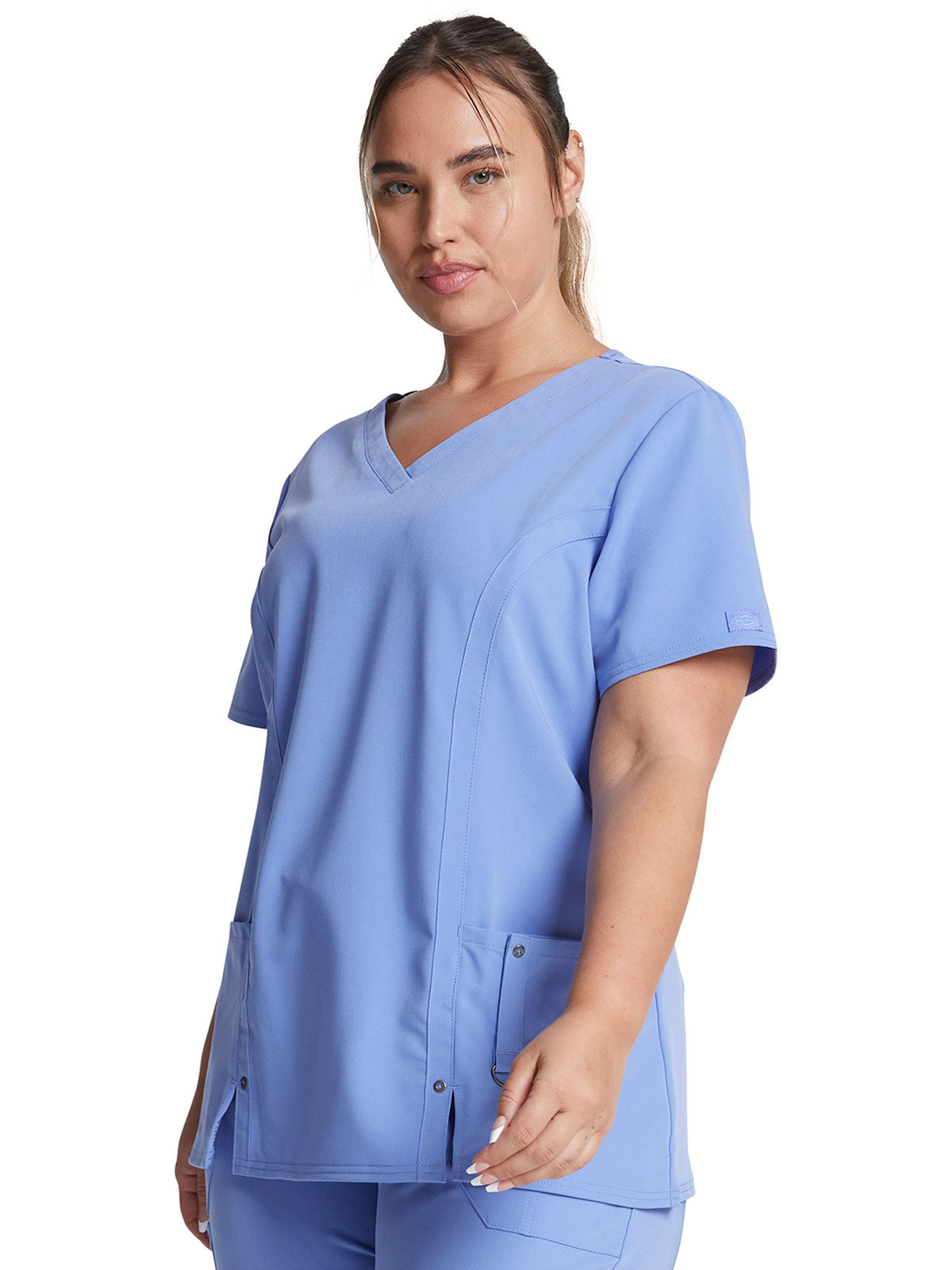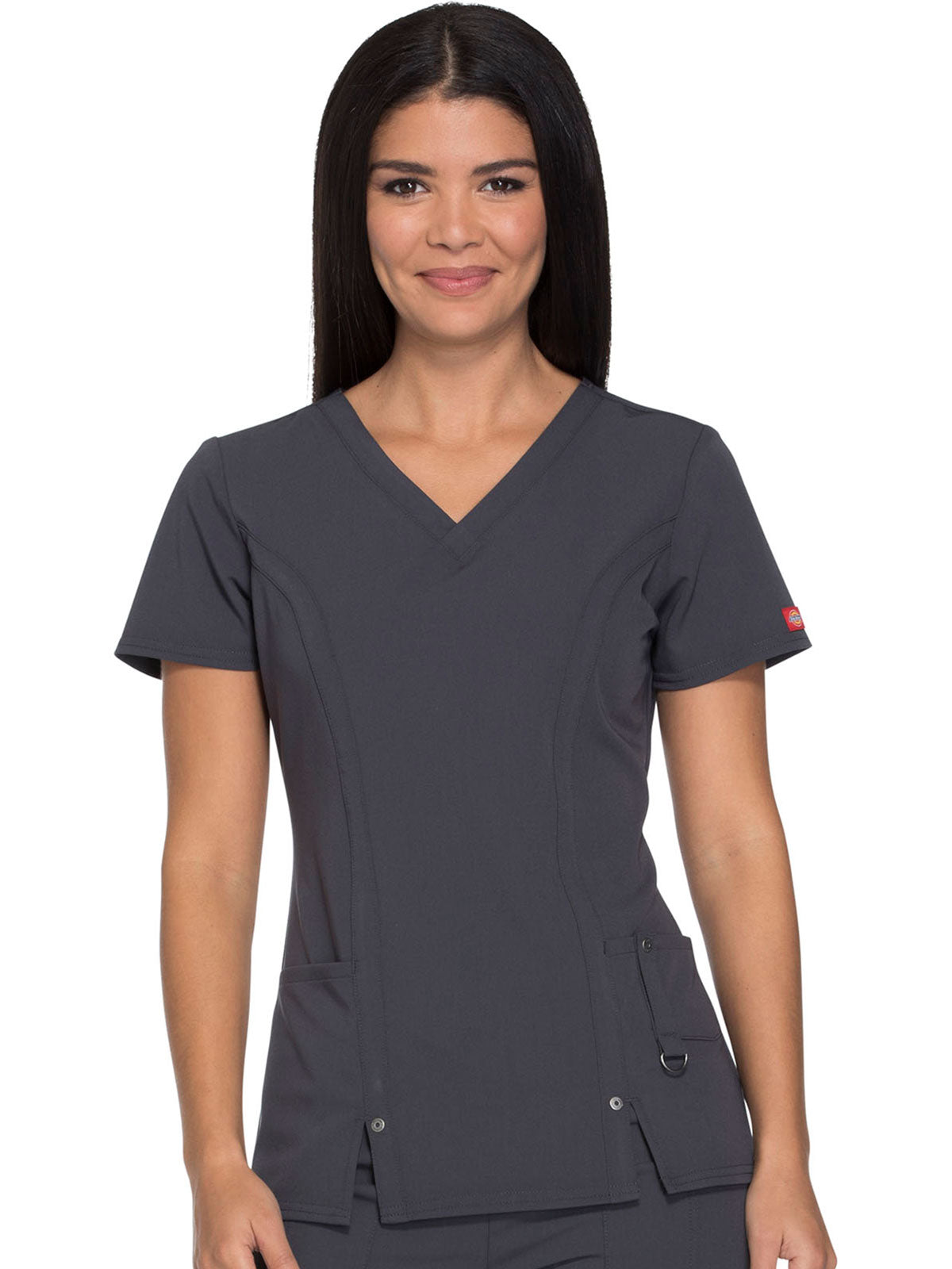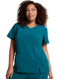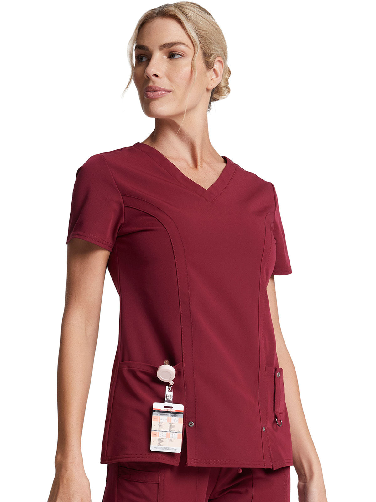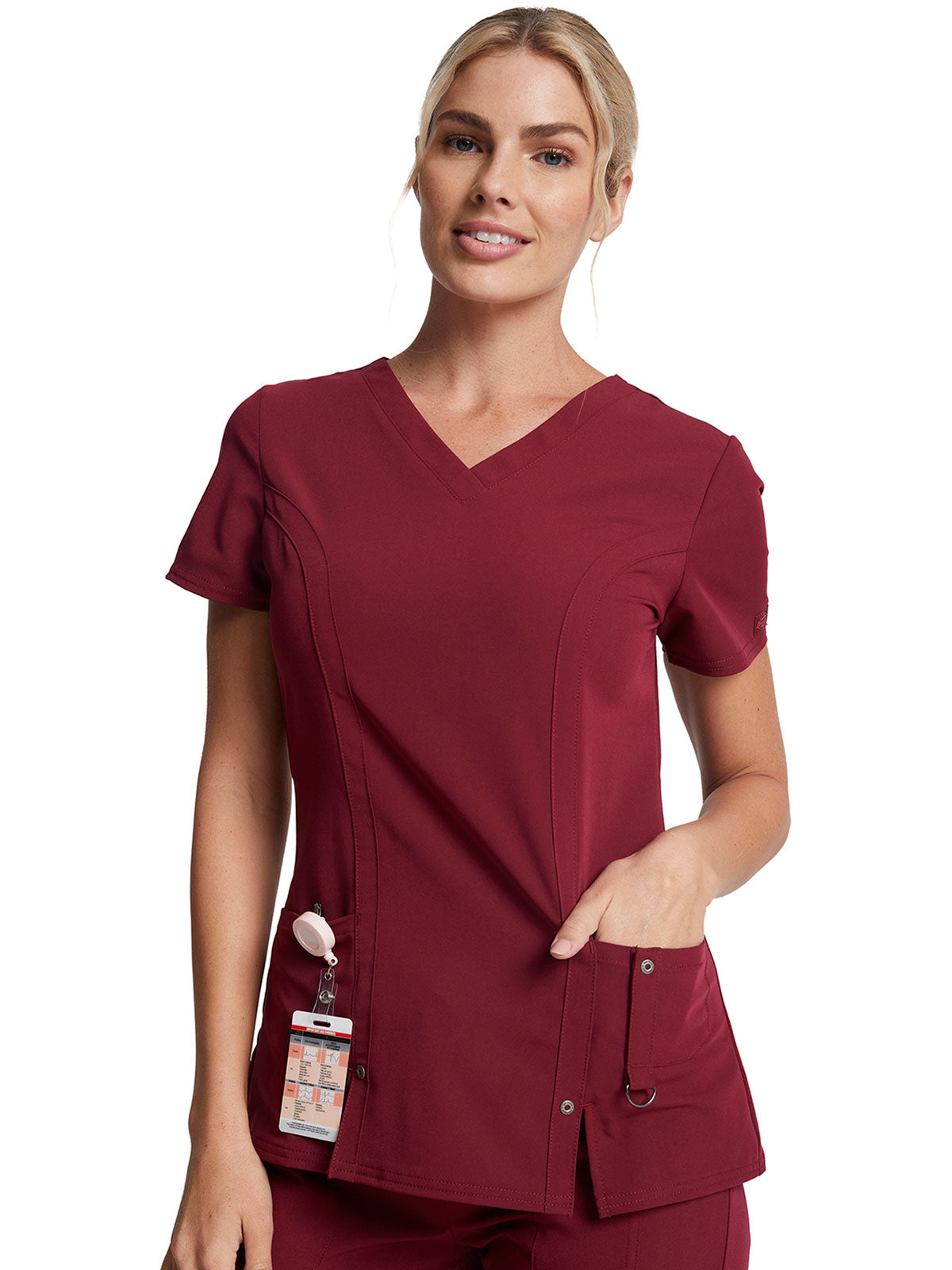 A Contemporary fit V-neck top features decorative logo eyelets at front princess strapping just above the vents, front patch pockets and a cell phone pocket that includes a self tab with a utility D-ring completed with a logo eyelet. Back princess seams add shape. Center back length: 26"