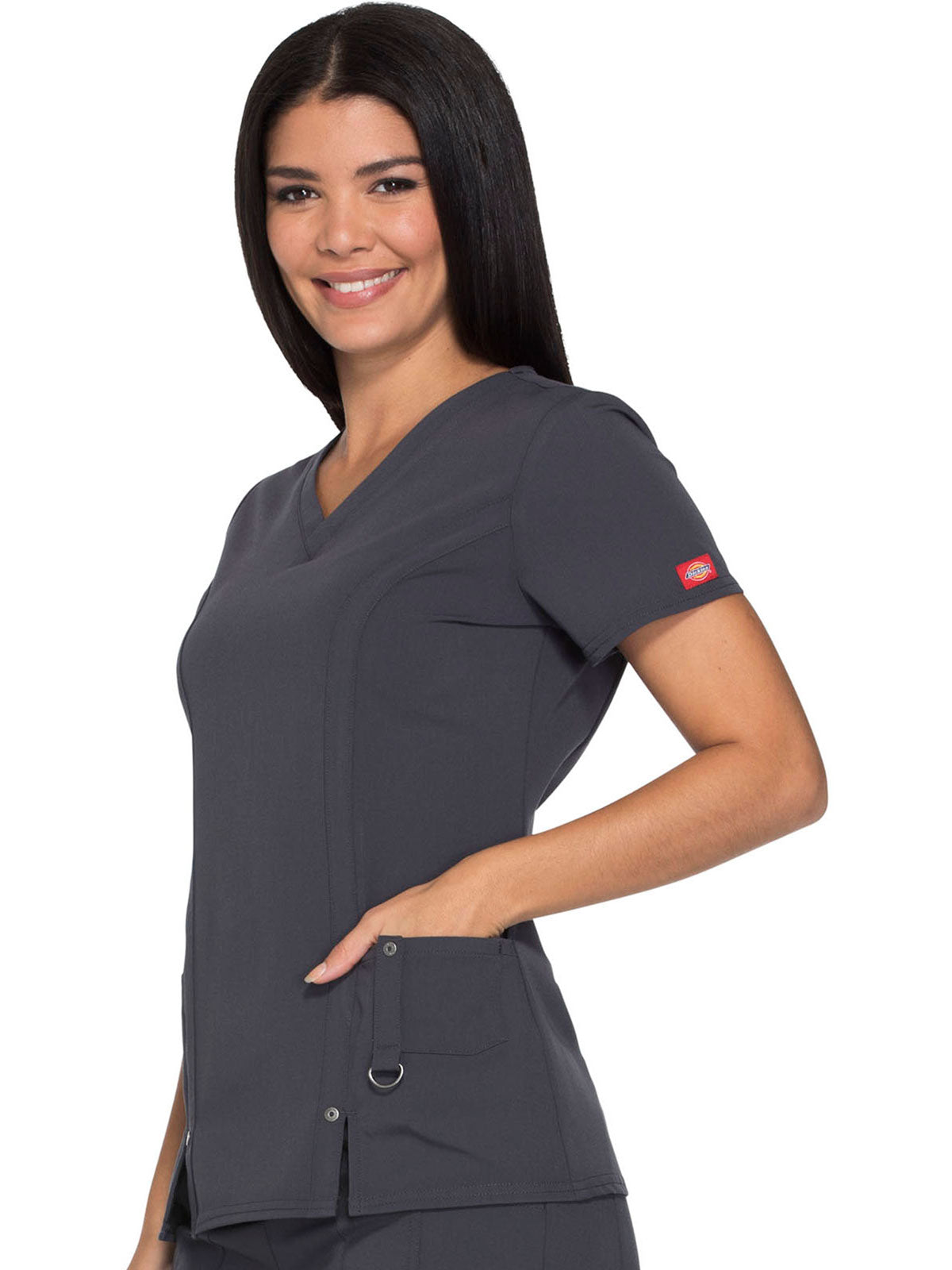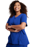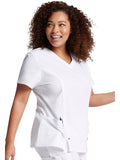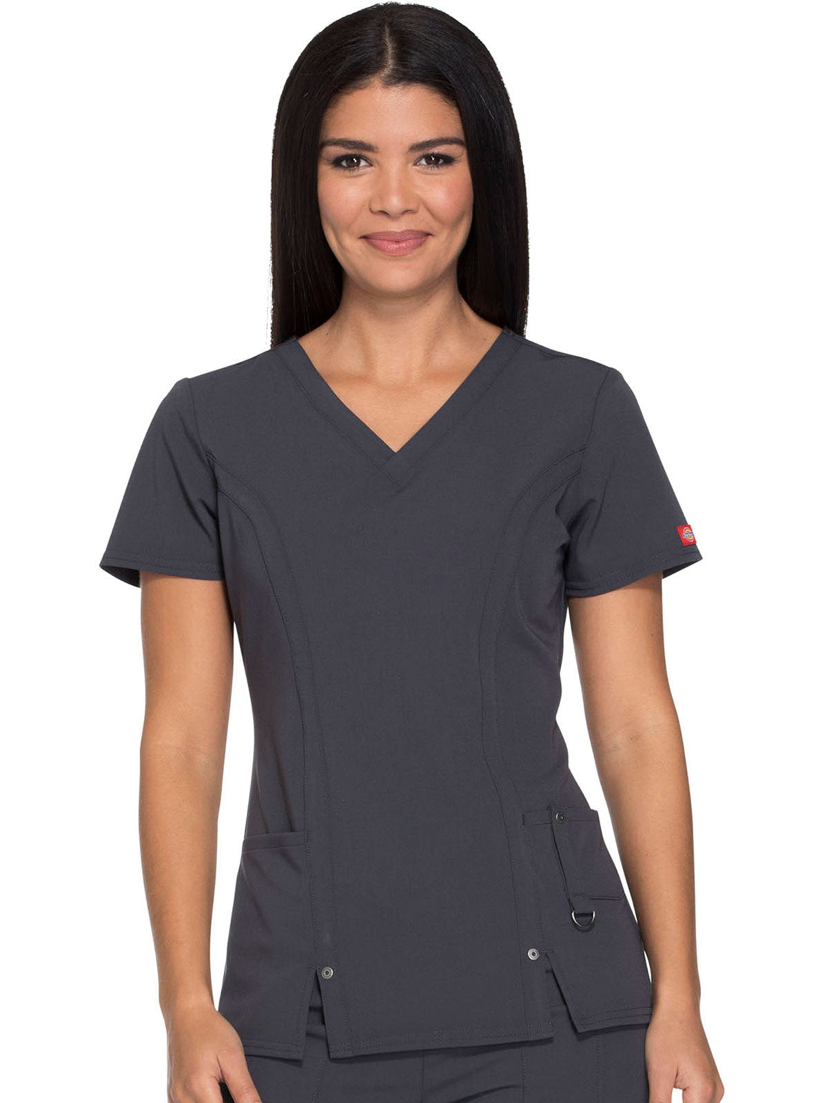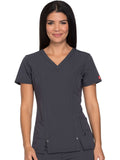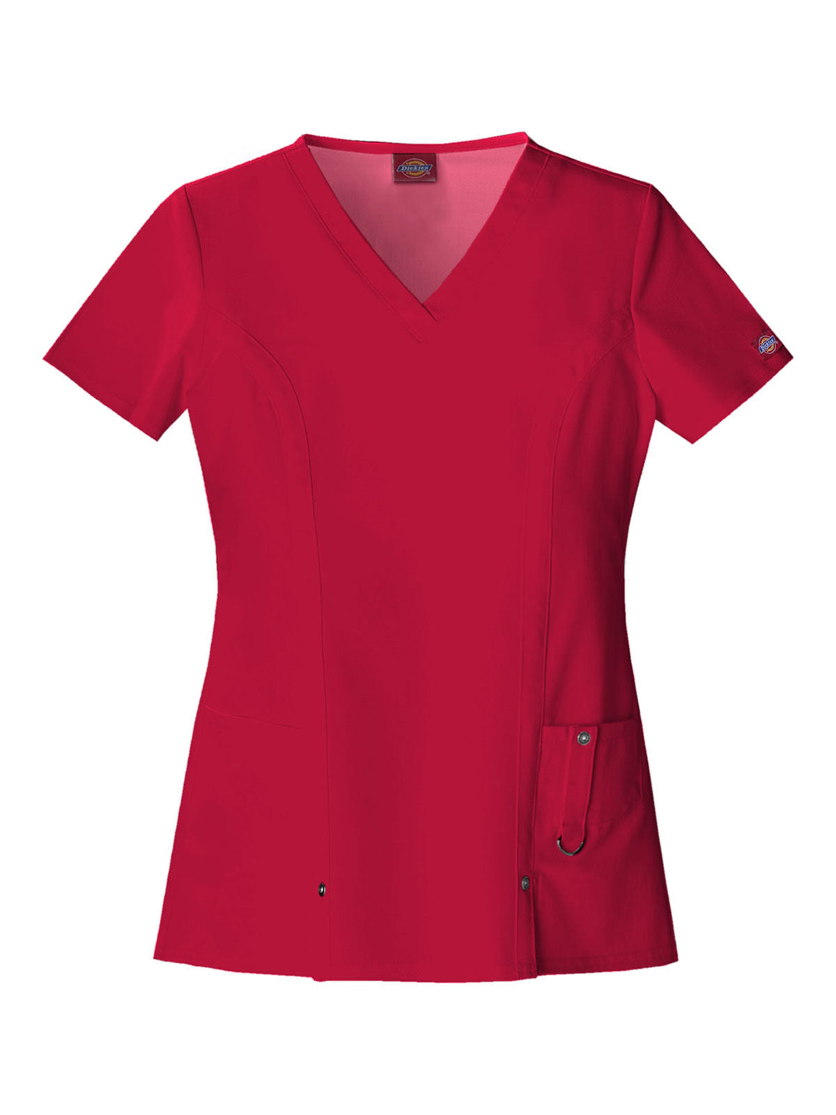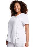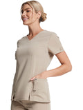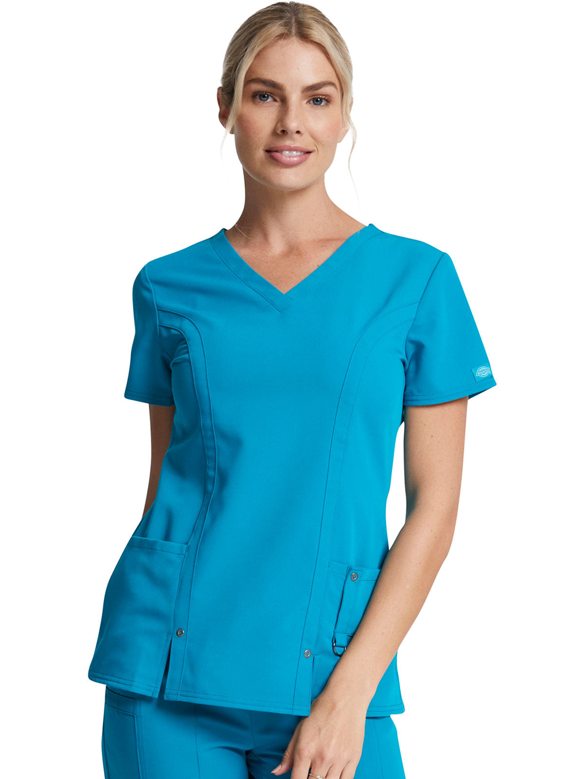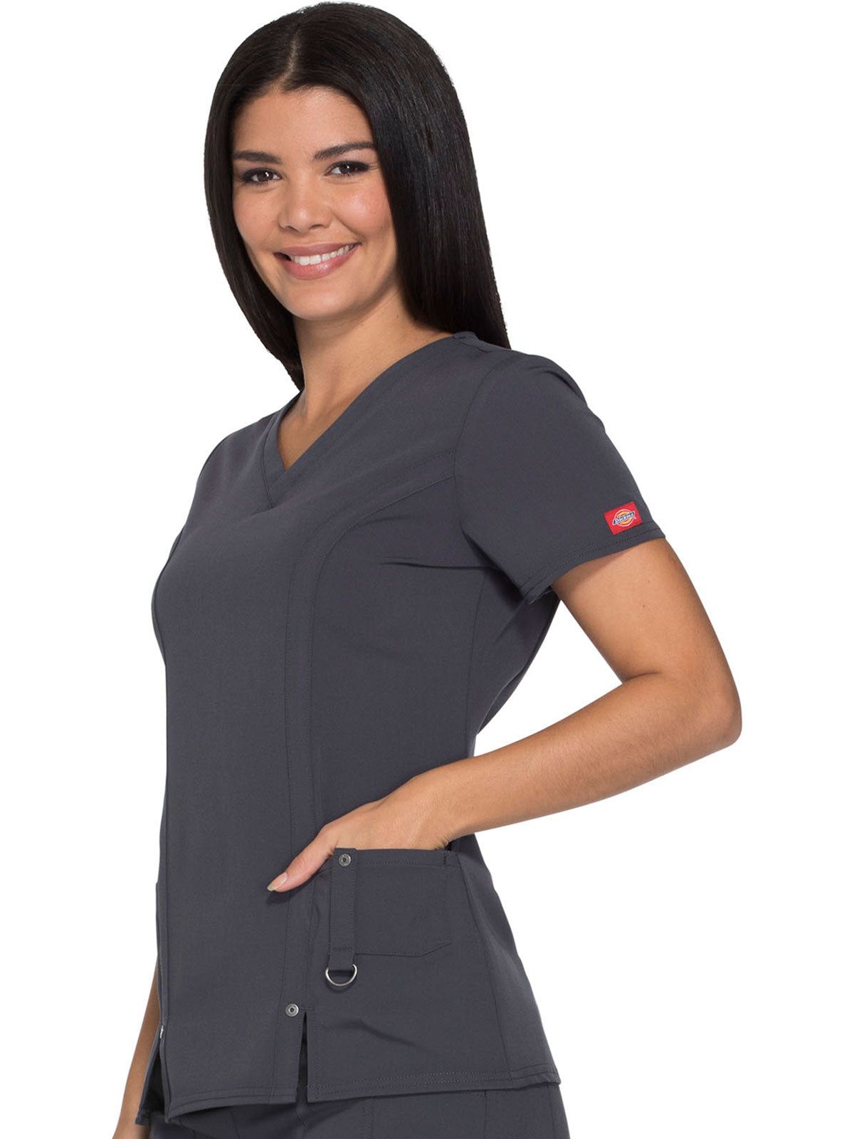 A Contemporary fit V-neck top features decorative logo eyelets at front princess strapping just above the vents, front patch pockets and a cell phone pocket that includes a self tab with a utility D-ring completed with a logo eyelet. Back princess seams add shape. Center back length: 26"