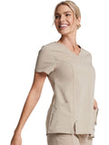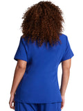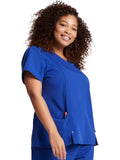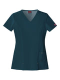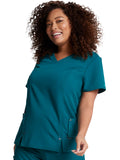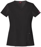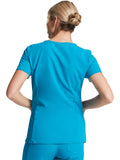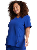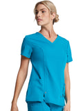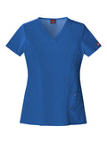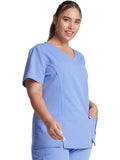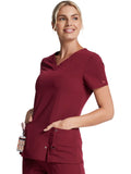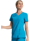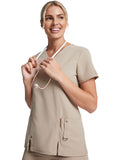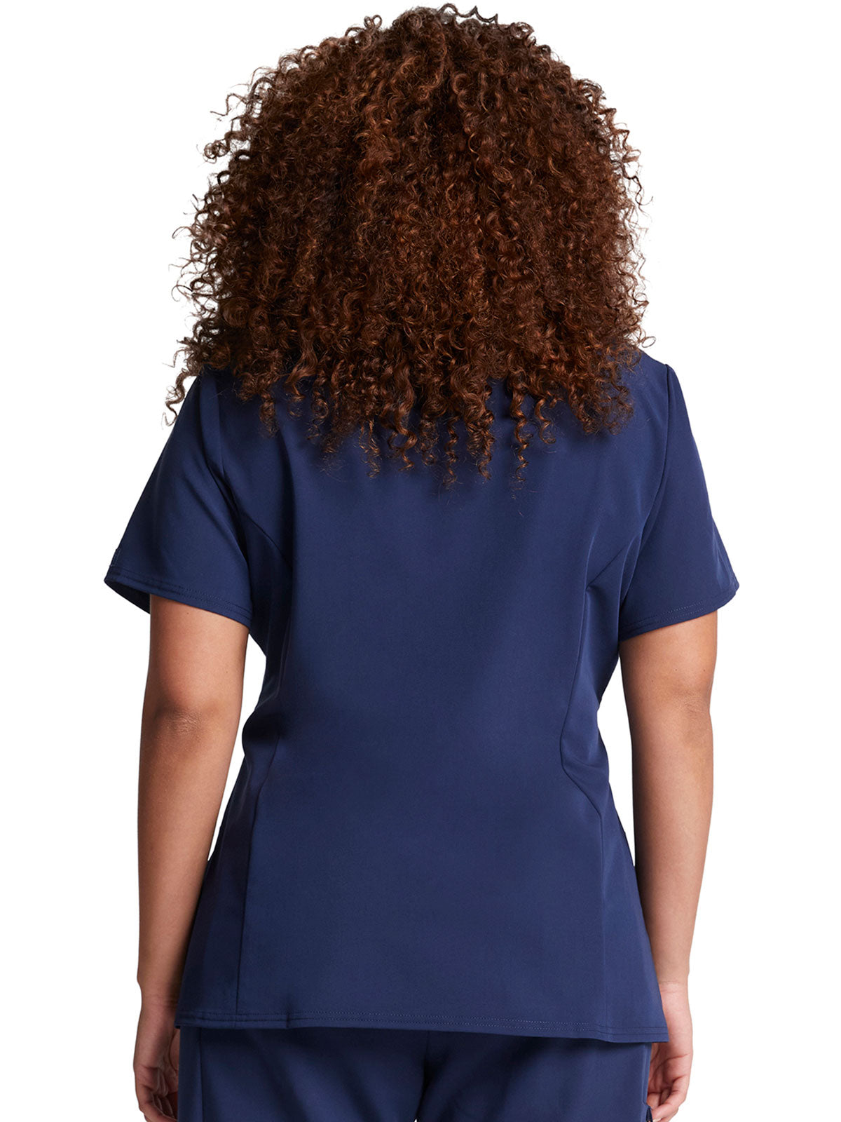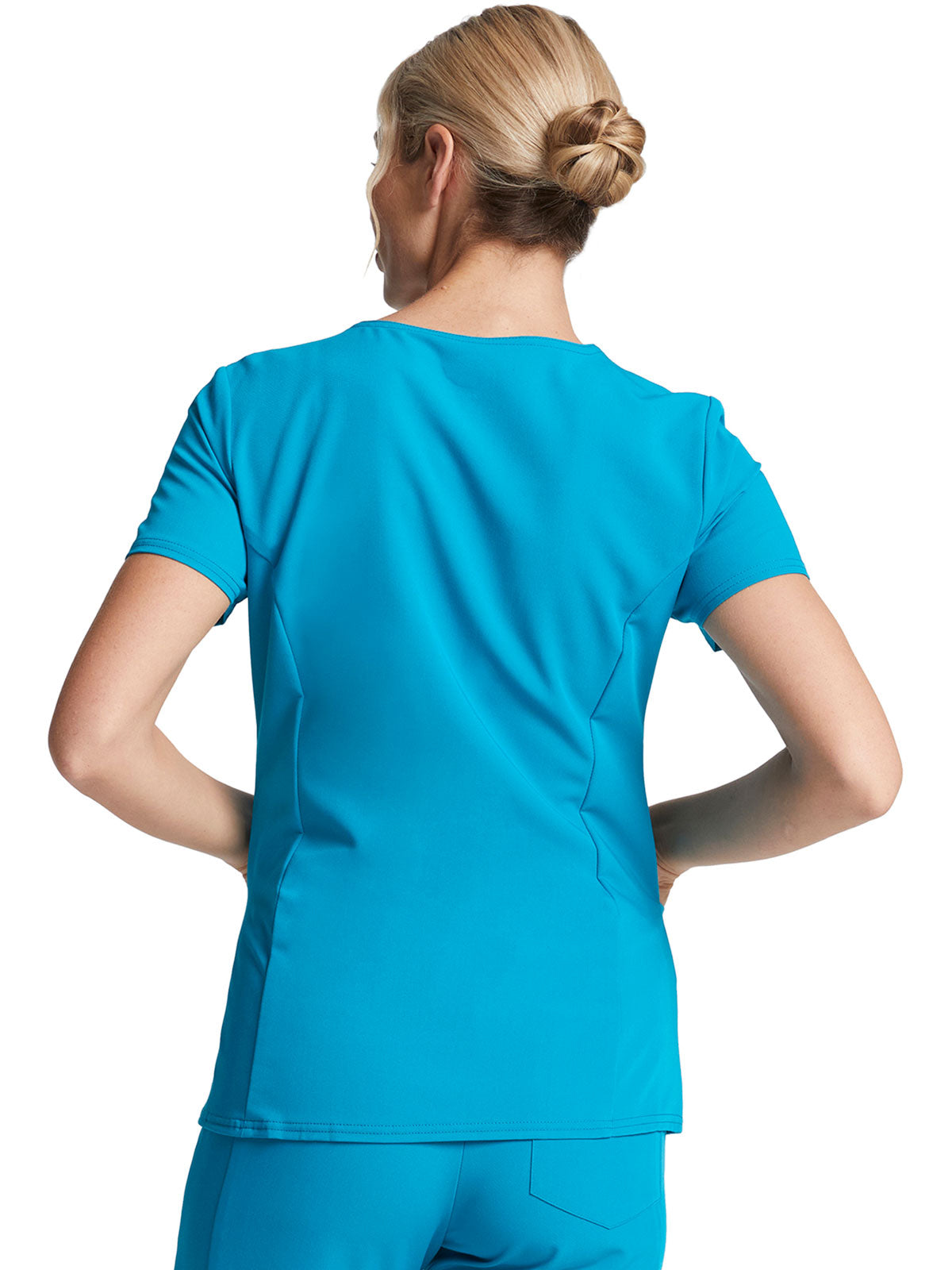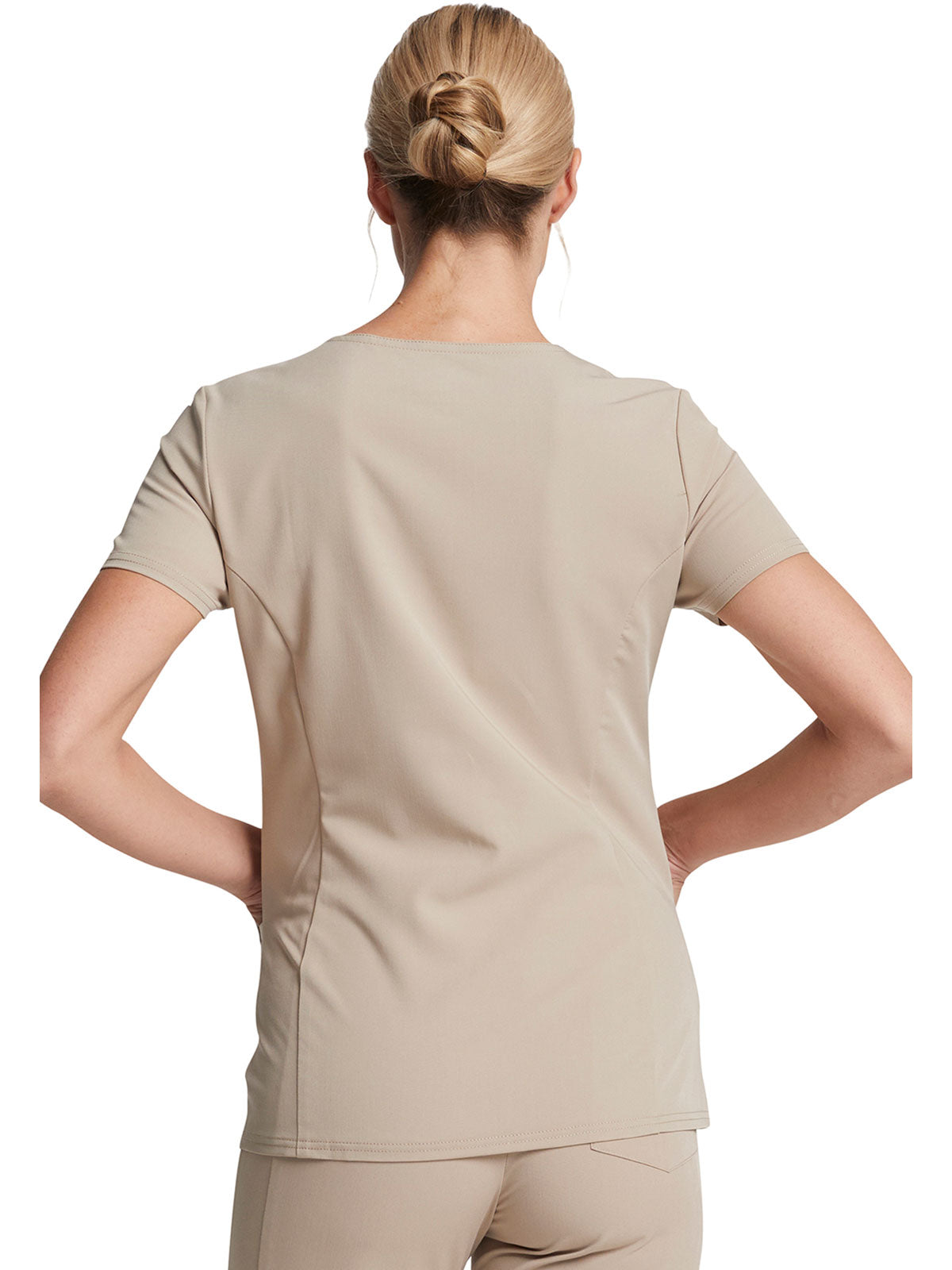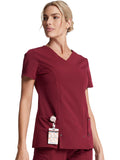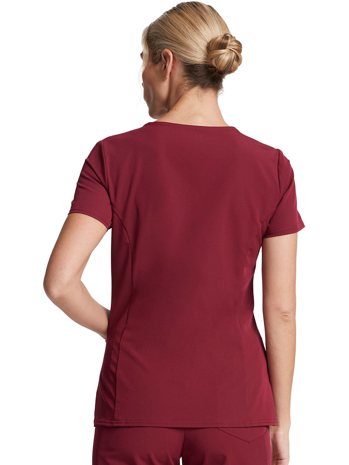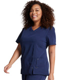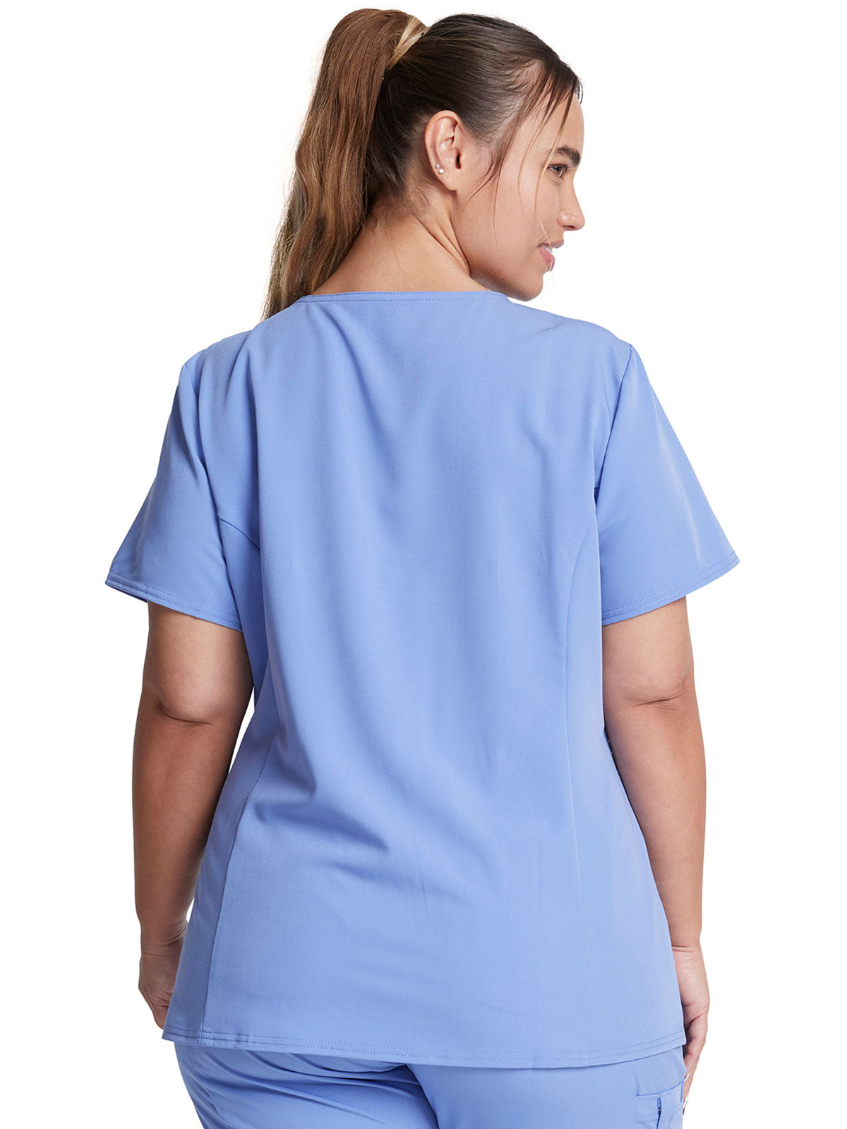 A Contemporary fit V-neck top features decorative logo eyelets at front princess strapping just above the vents, front patch pockets and a cell phone pocket that includes a self tab with a utility D-ring completed with a logo eyelet. Back princess seams add shape. Center back length: 26"