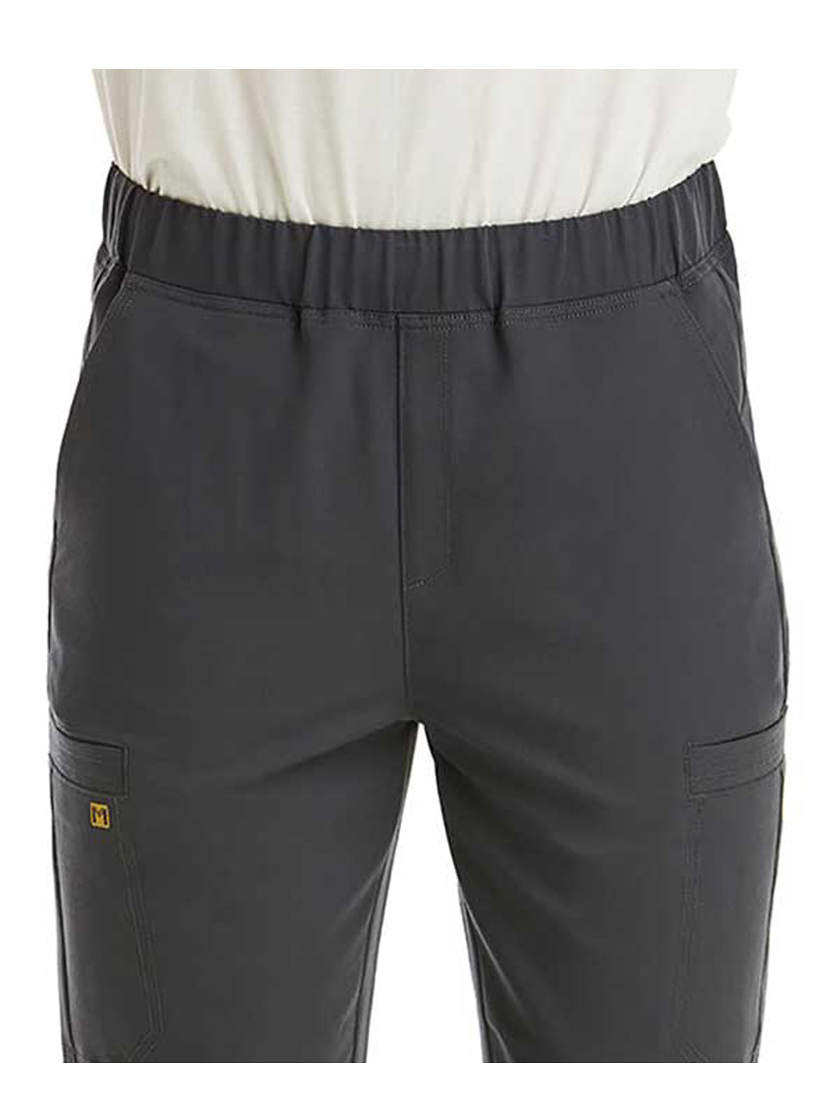 "*Men's half elastic waistband pant with tapered leg *Dyed-to-match inner drawstring *Functional front y with button *Two front angled patch pockets *One angled patch cargo pocket with additional scissor pocket *Two back angled patch pockets *Decorative contrast piping at cargo...