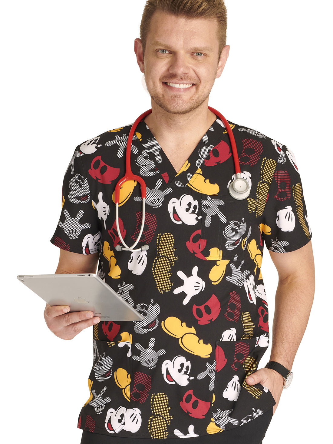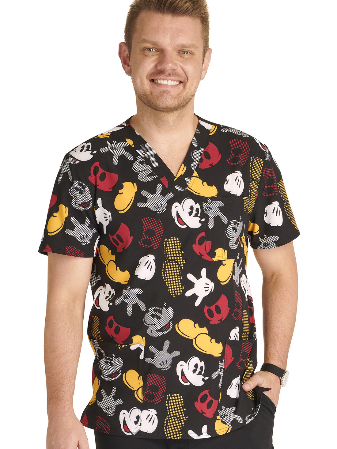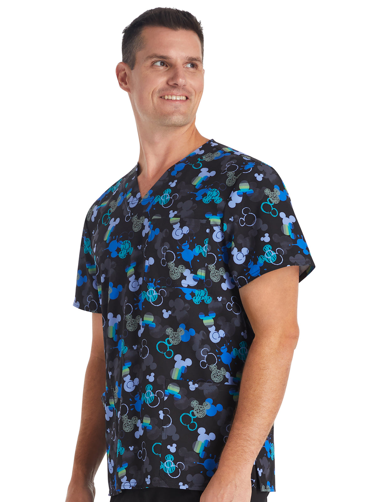 This modern classic unisex fit v-neck print top features front and back yoke seams, a chest pocket with a pen slot, and side vents. It has a center back length of 29". Short sleeves Chest pocket with pen slot Front...
