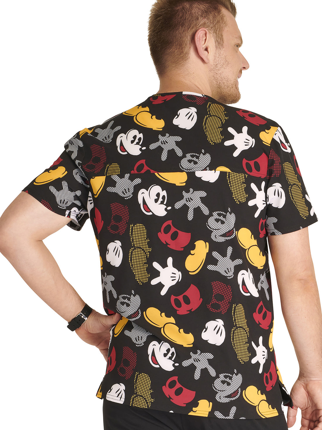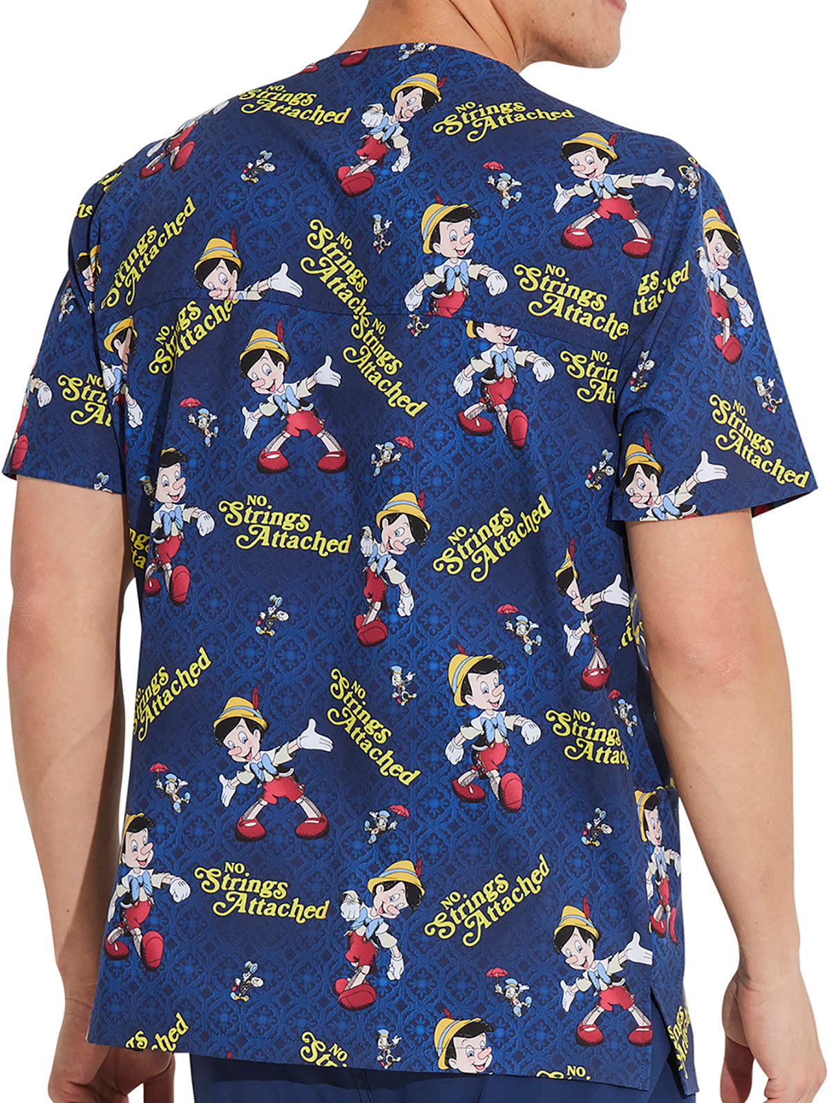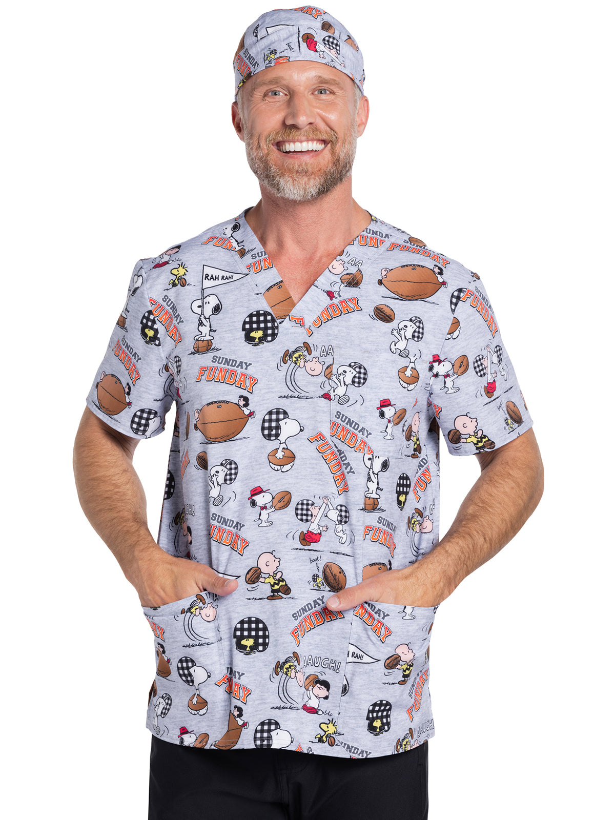 This modern classic unisex fit v-neck print top features front and back yoke seams, a chest pocket with a pen slot, and side vents. It has a center back length of 29". Short sleeves Chest pocket with pen slot Front...