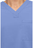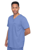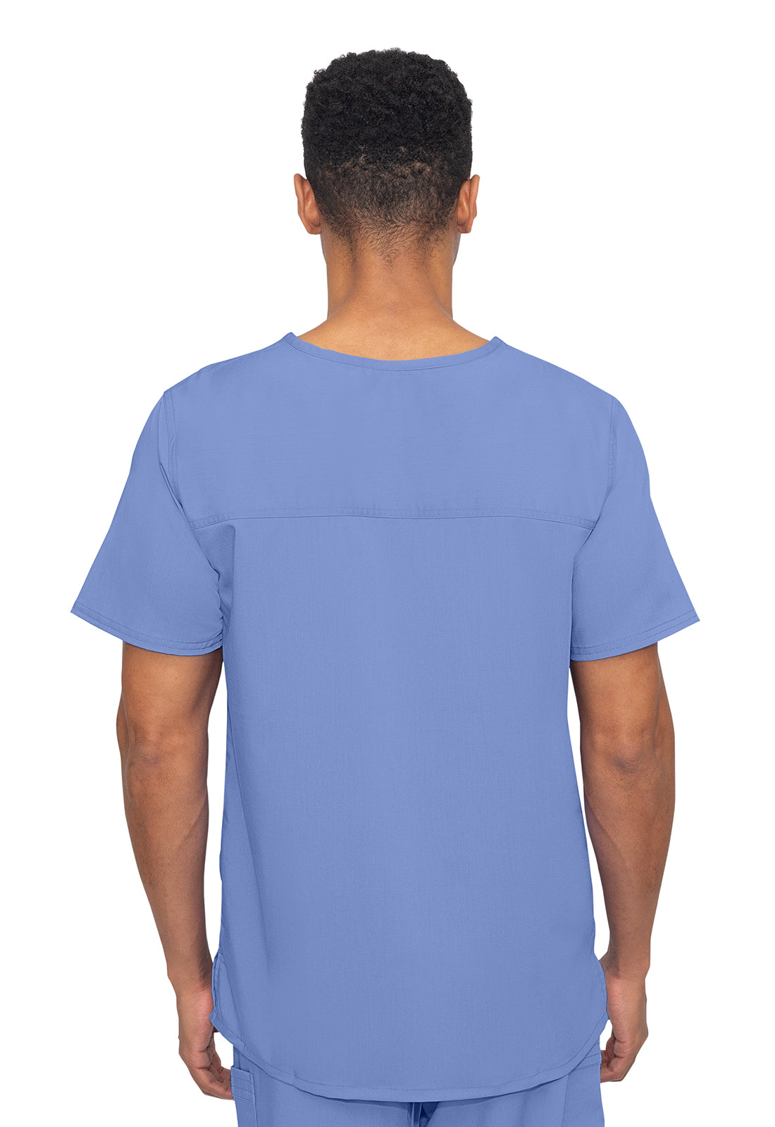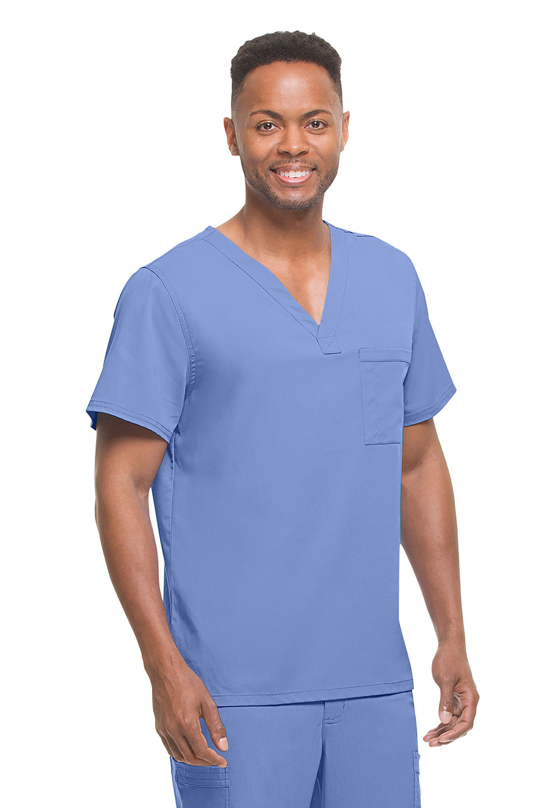 A Men's Traditional fit V-neck top features a chest pocket, two patch pockets, a cell phone pocket, hidden instrument loop, back yoke and side vents. Center back length: 32"_x000D_ Men's Traditional Fit 4 Pockets: Patch Pockets, Chest Pocket, Interior Pocket...