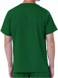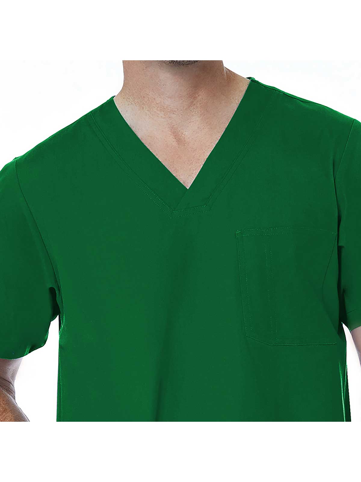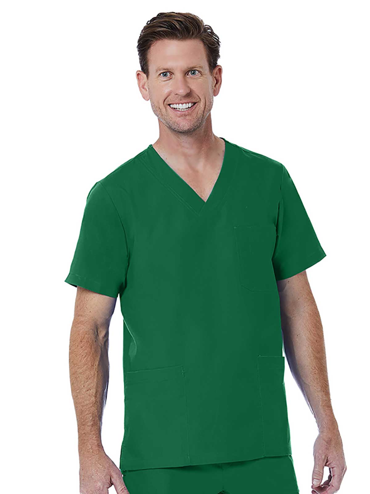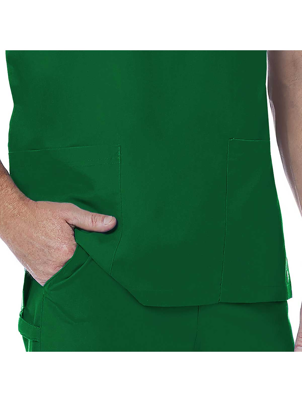 A Men's Traditional fit V-neck top features a chest pocket, two patch pockets, a cell phone pocket, hidden instrument loop, back yoke and side vents. Center back length: 32"_x000D_ Men's Traditional Fit 4 Pockets: Patch Pockets, Chest Pocket, Interior Pocket...