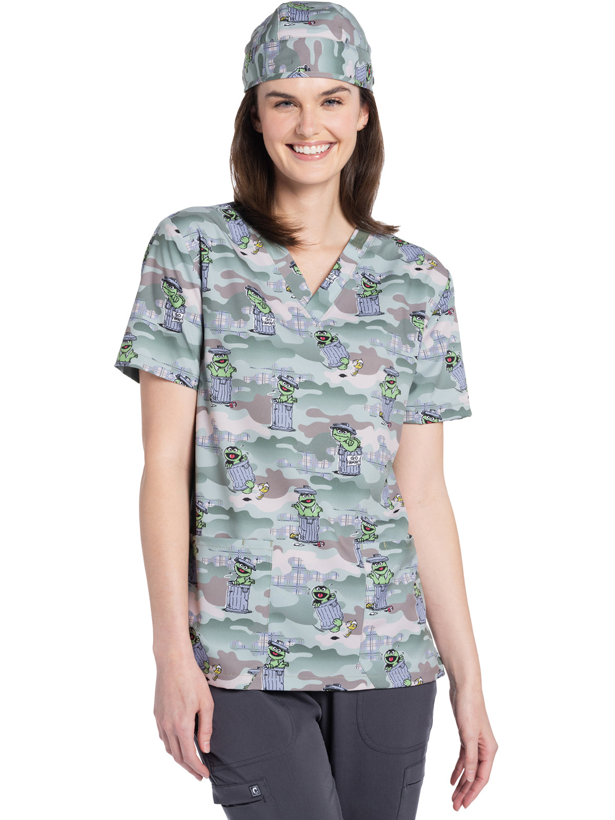 This Unisex fit v-neck print top features twill tape at the neckline, two front patch pockets, a back yoke seam, and side vents. Center back length: 28"