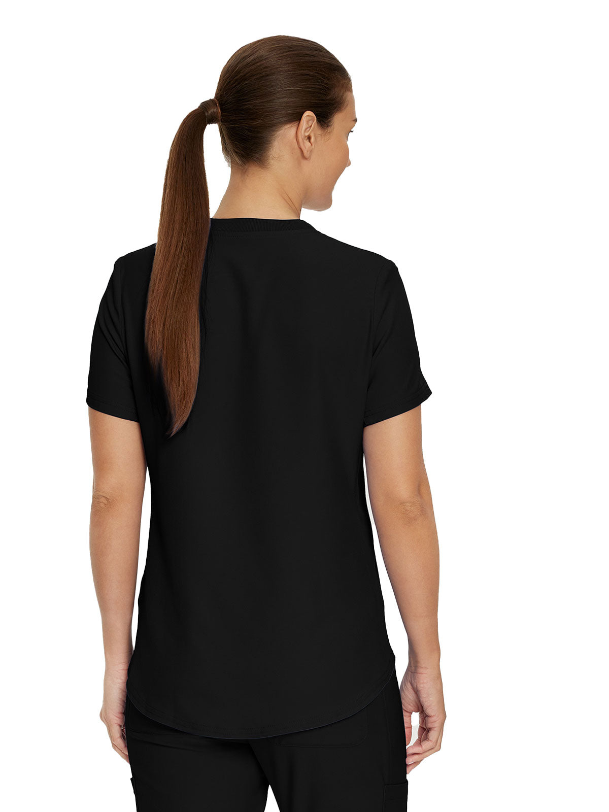 This modern fit scrub top features a soft rib-knit back neckband and rib-knit side panels for a comfortable and sleek fit. With a front welt chest pocket and right front zip security pocket, this top is the definition of a high-functioning style. Our modern tailored fit flatters your shape, while our moisture-wicking super stretch fabric provides the comfort and flexibility your work requires throughout the day.