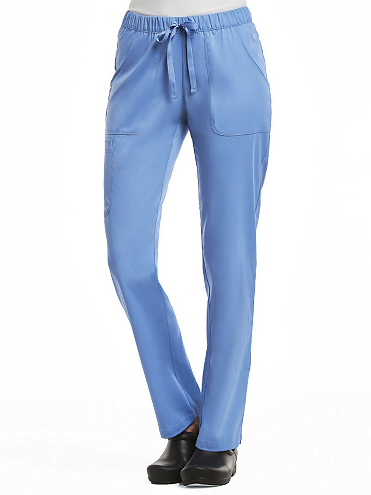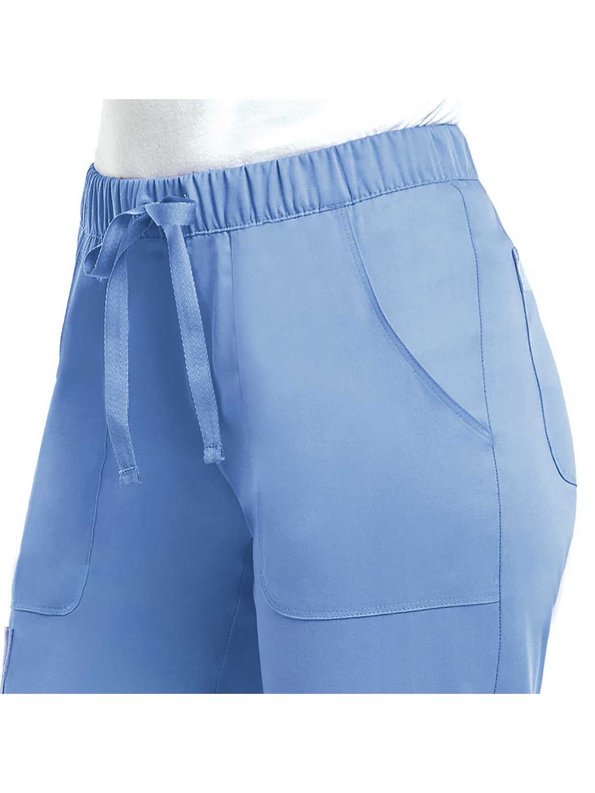 A Contemporary fit, low rise, straight leg pant features an elastic knit waistband and adjustable drawstring. Also featured are rib knit front and back yokes, angled front pockets, front leg seams with a zip closure cargo pocket, one back patch...