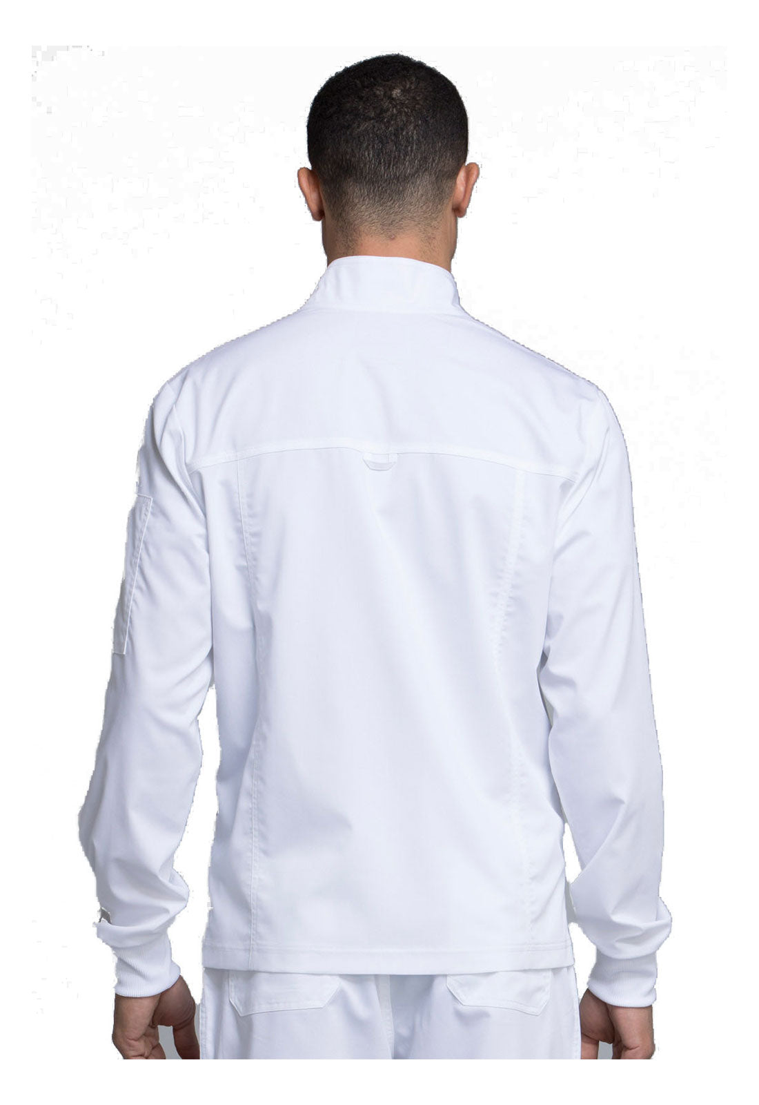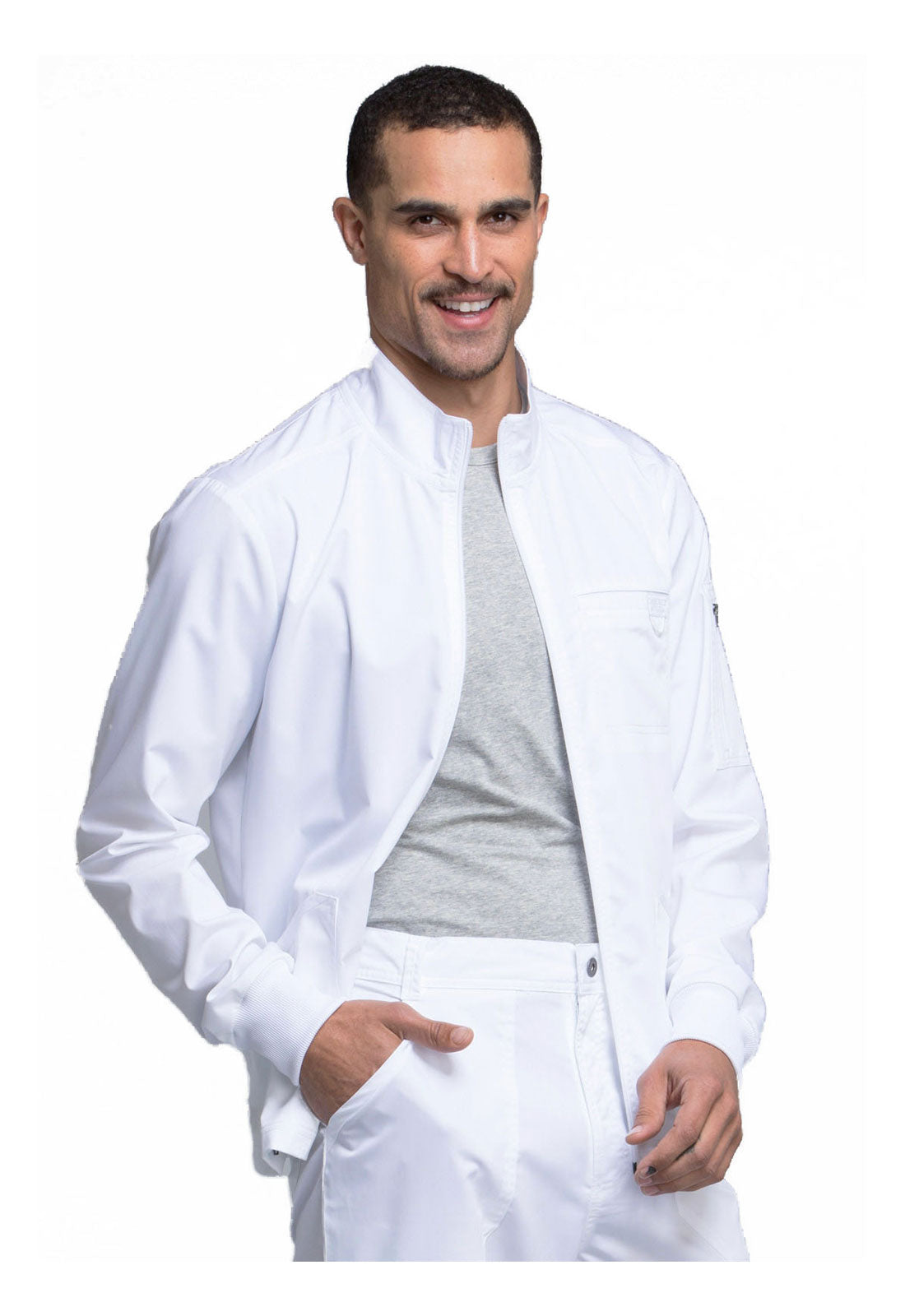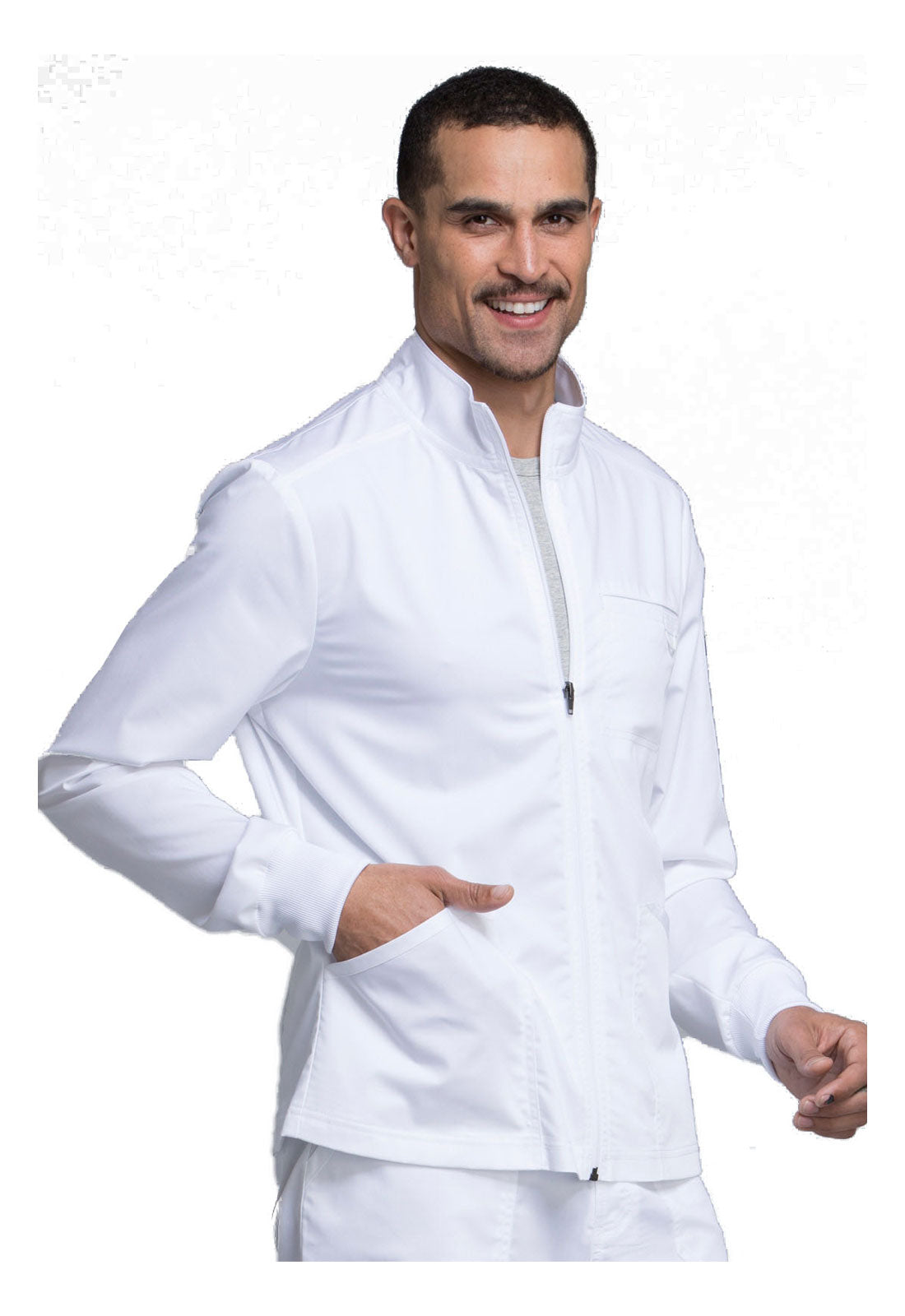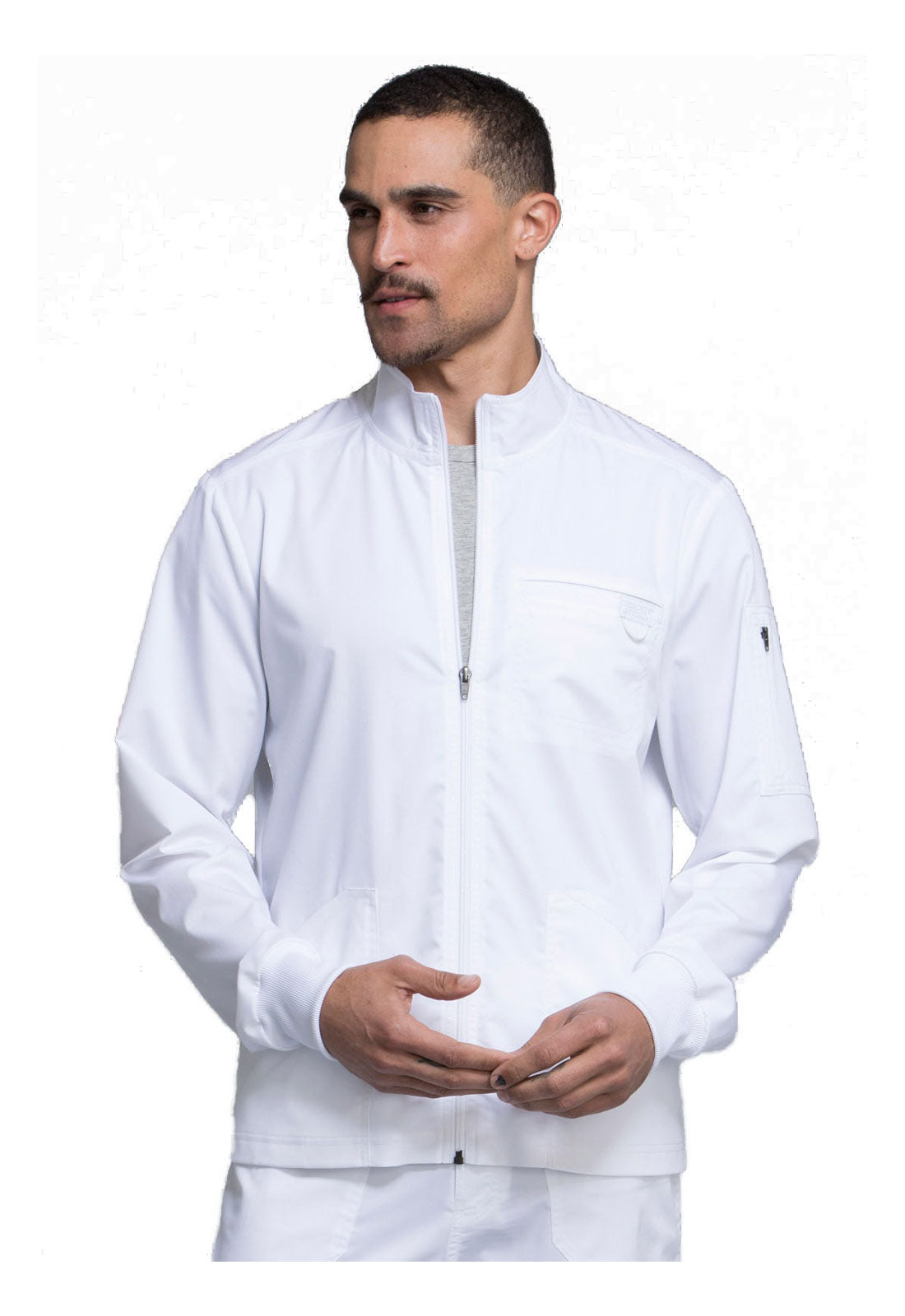 A Men's Modern fit zip front warm-up jacket features a chest pocket with logo label and bungee loop, two patch pockets, a cell pocket, and rib-knit cuffs. Also features a sleeve pocket with security zip closure, and back locker loop. Center back length: 27"