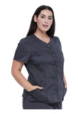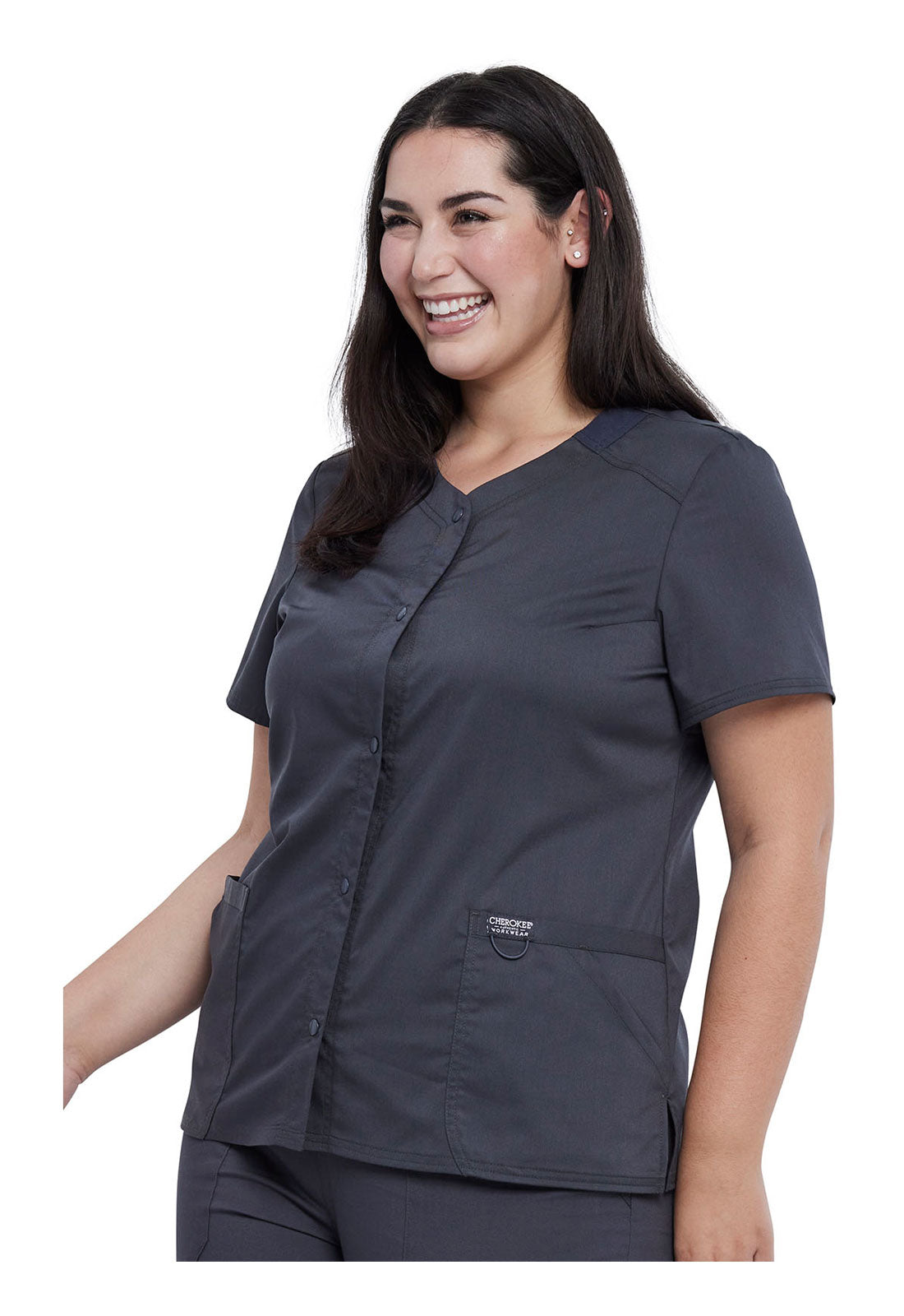 This Modern Classic fit V-neck top features a snap front closure, knit insets at neckline, front yoke seams, back princess seams and a logo label with bungee loop. There are four pockets in total: two front top entry patch pockets and two side angle entry pockets. Side vents complete the look. Center back length: 26"