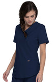 This V-neck top features a curved hemline and a subtle touch of power mesh at the neck band and sleeve hem. It also has generous two front welt pockets, angled front yoke panels, and back princess seams for a form flattering shape. Contemporary Fit. Center Back: 26"