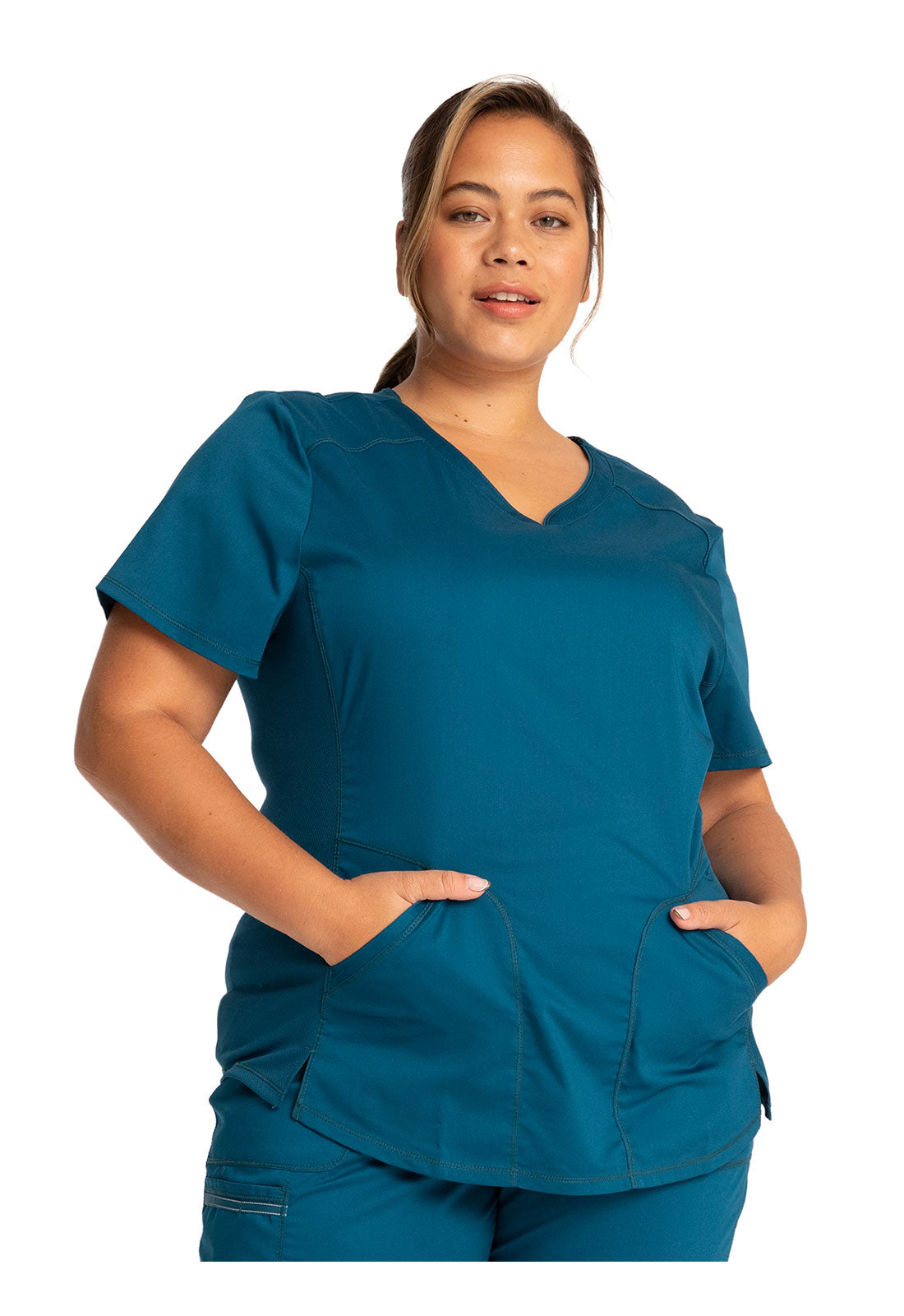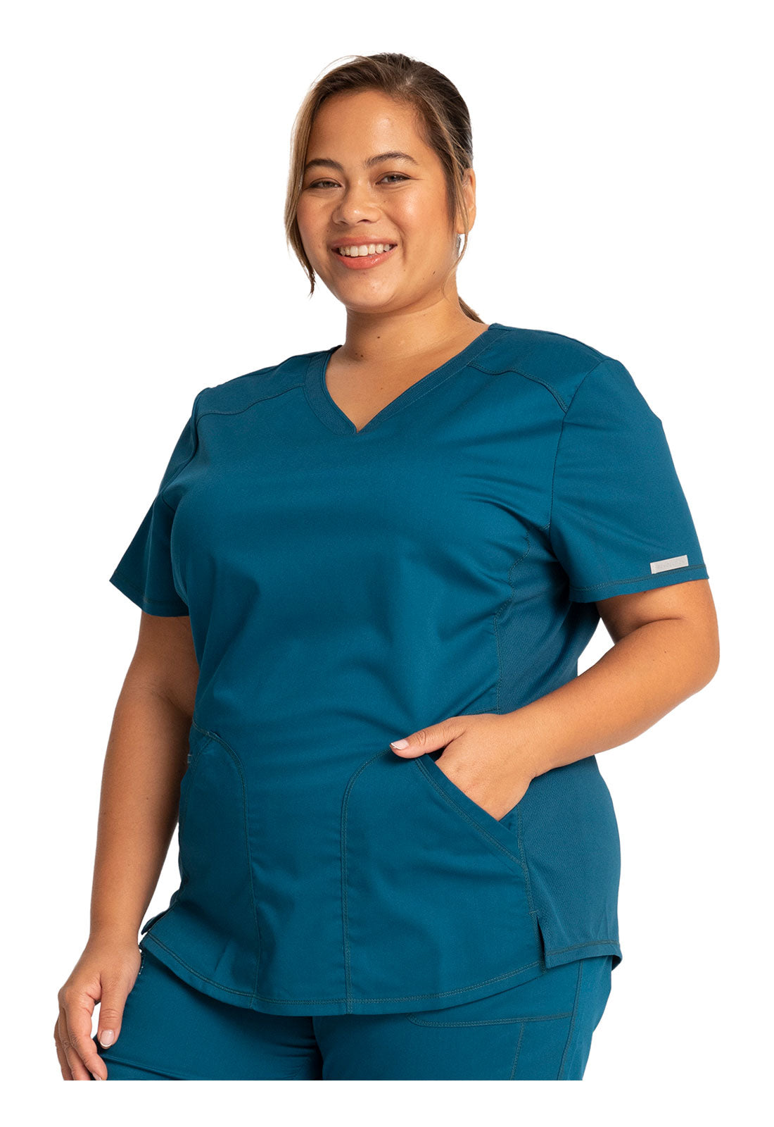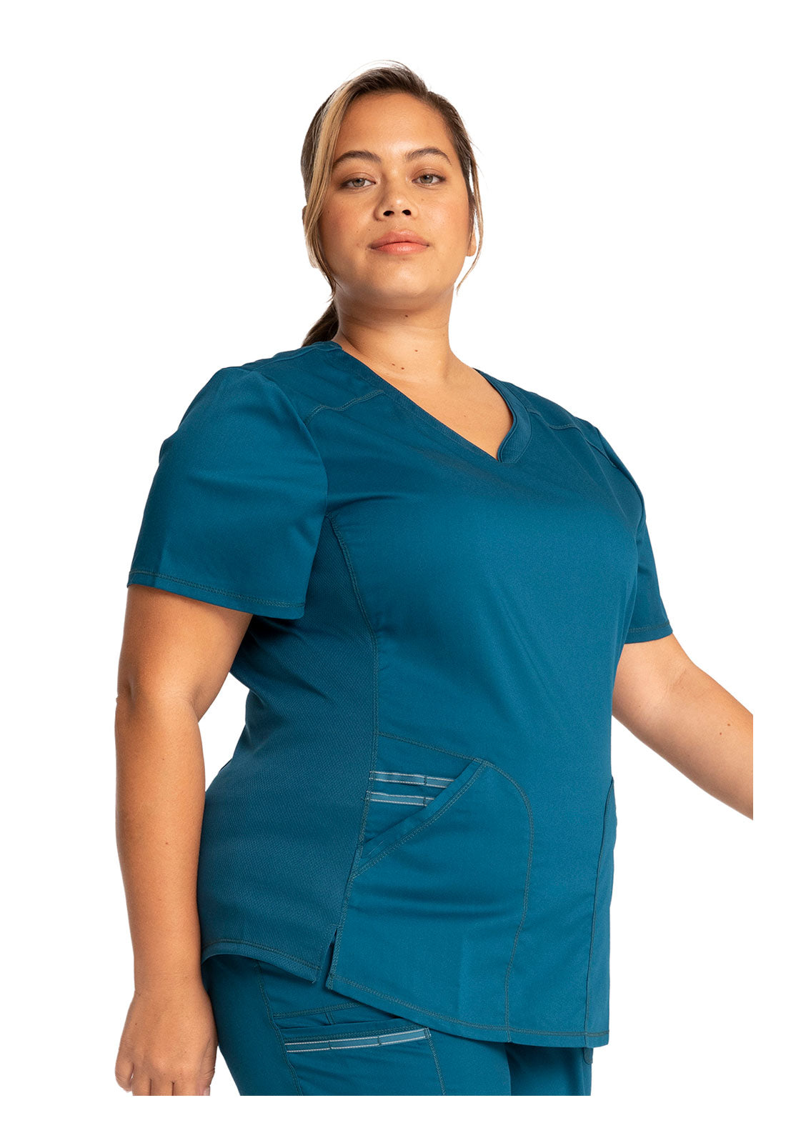 Add a sporty twist to your medical wardrobe with this soft shaped V-neck top with two patch pockets and instrument loops. A breathable mesh is featured on the neckband and side panels for extra comfort and mobility. Modern Classic fit. Center back length: 26"