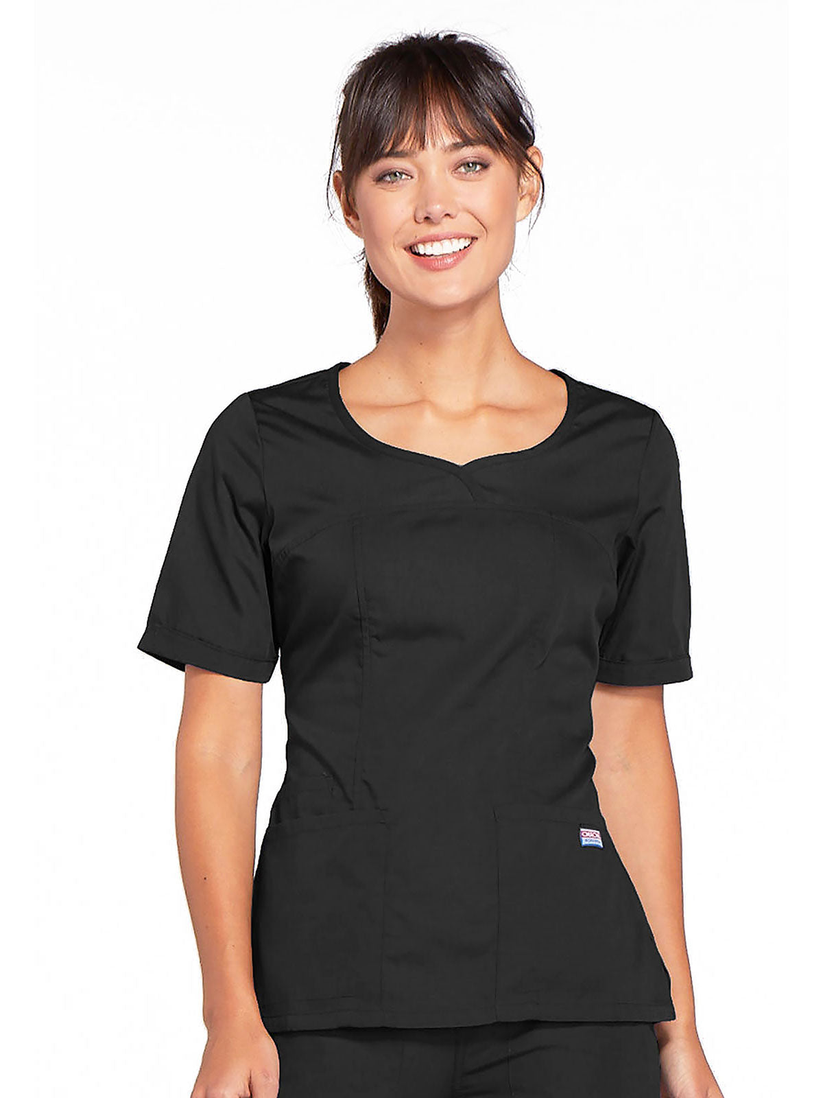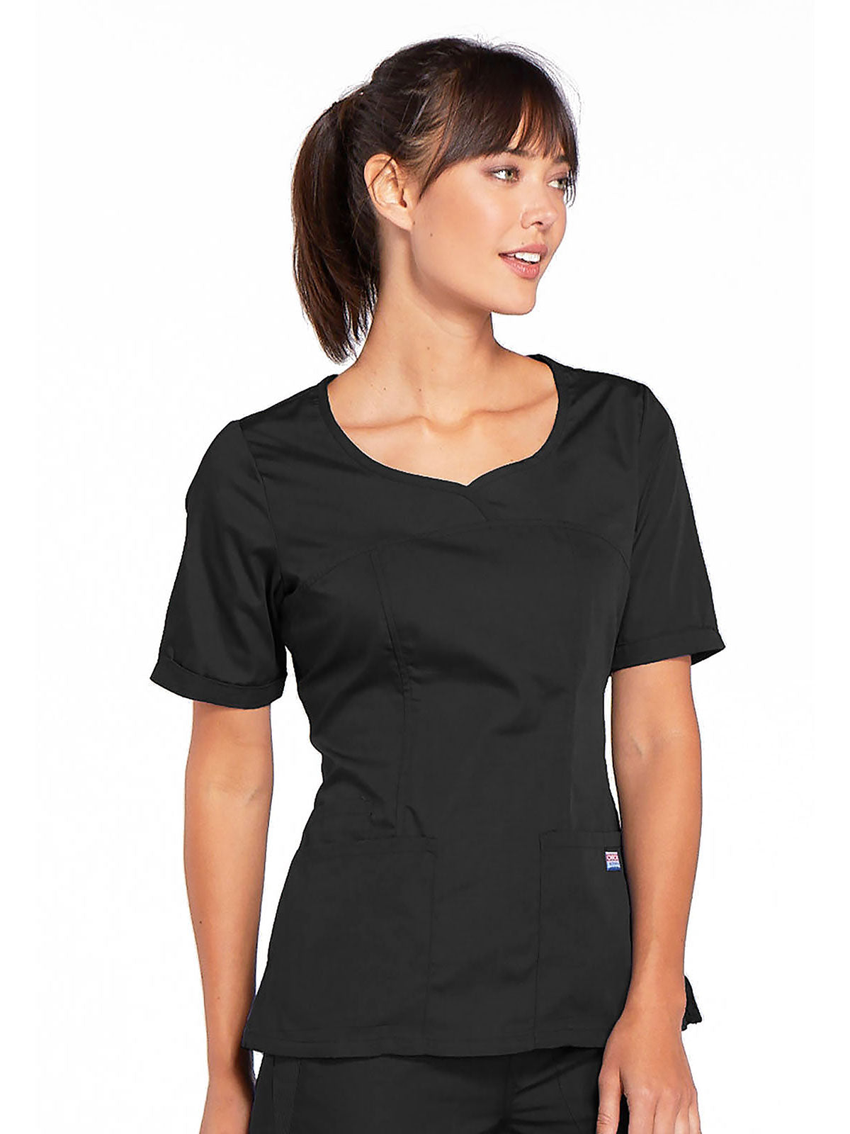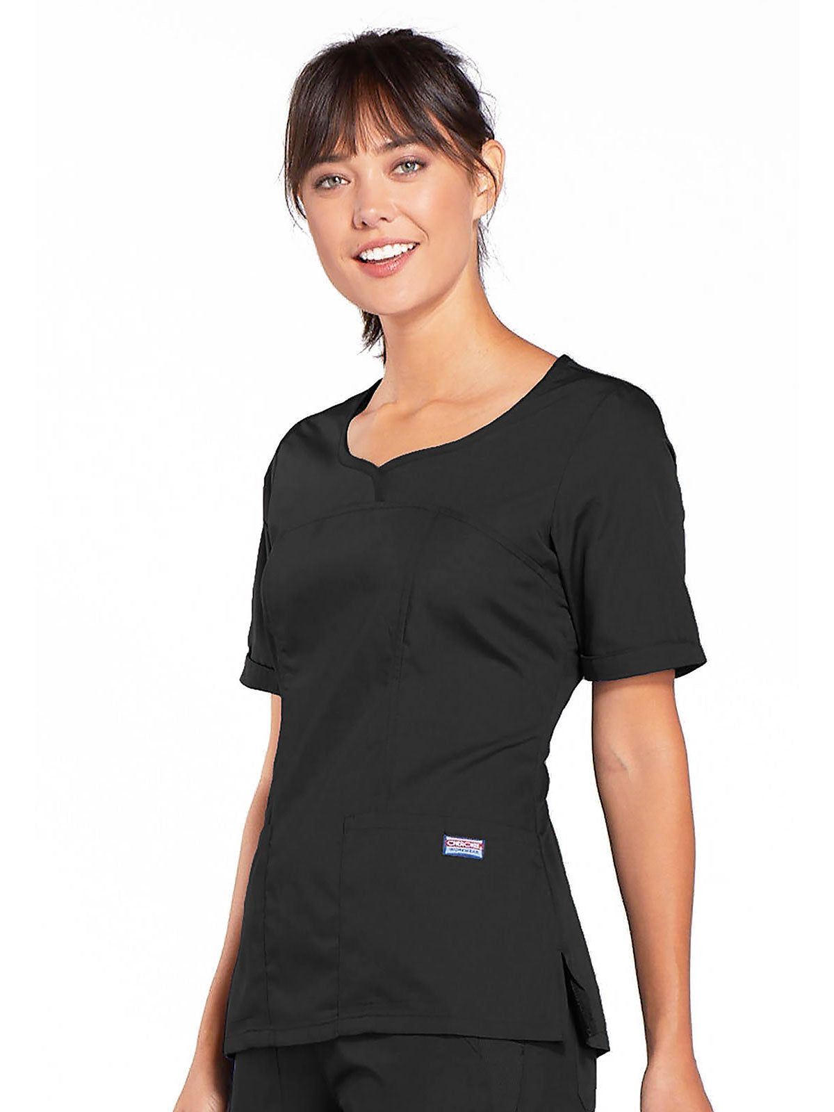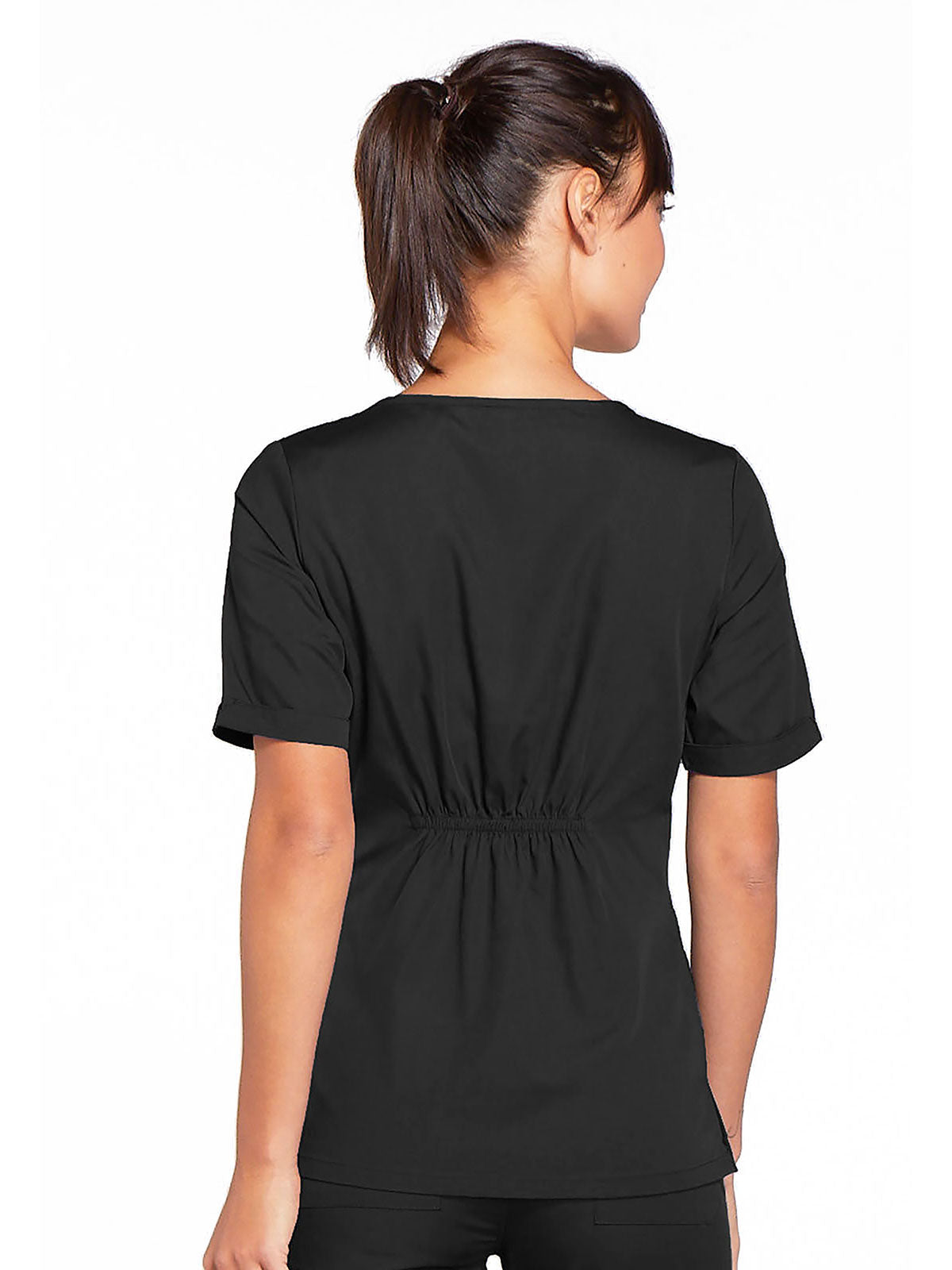 A Modern Classic fit V-neck top features a slightly curved front yoke, front princess seams, front patch pockets, cell phone pocket, above elbow length sleeves with notched turn back cuff, and half back elastic and side vents. Center back length 26"