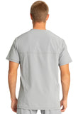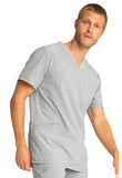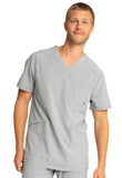 A Men's Modern fit V-neck top features a chest pocket with grommet detail, front welt pockets with triple-needle topstitching, front and back yokes, and stretch rib knit back panels for extra comfort. Center back length: 29 1/2" . The comfortable stretch poplin fabric and super stretchy rib knit is the perfect combo for healthcare professionals.