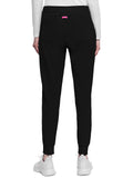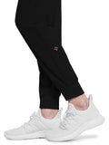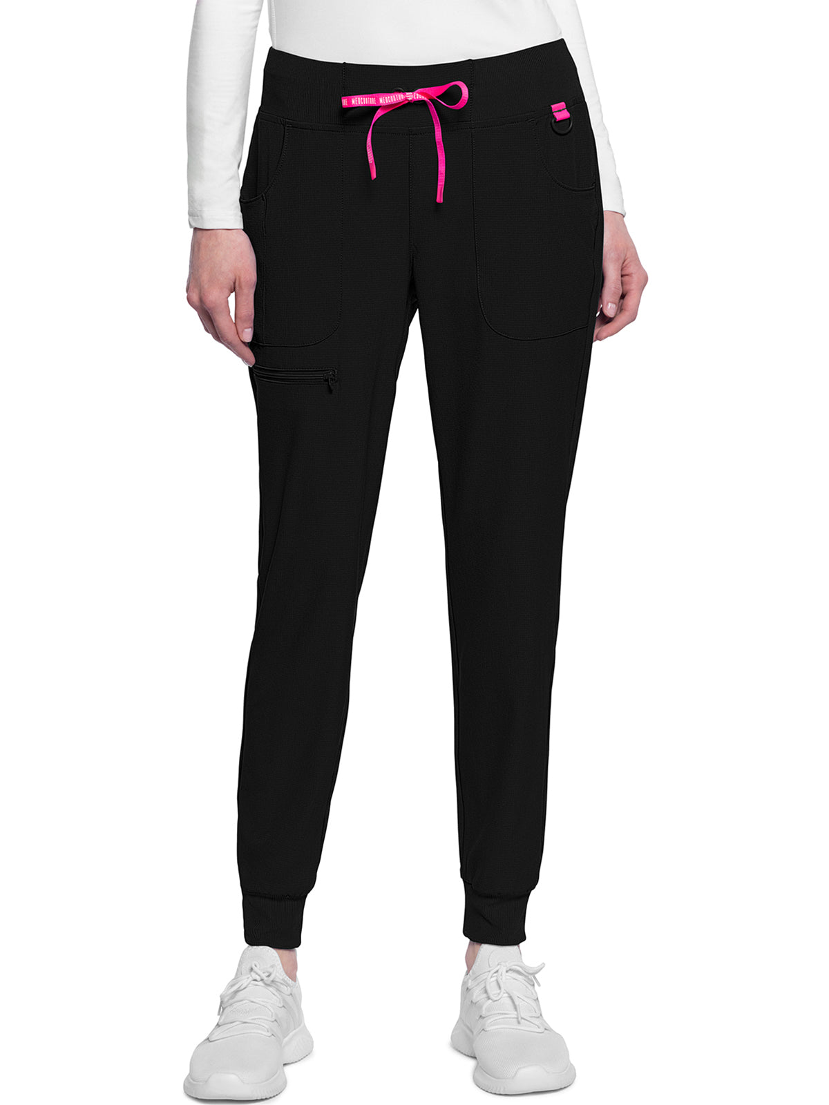 This Missy fit mid rise jogger features a rib-knit covered elastic reinforced waistband with signature color logo drawstring. There is a d-ring at the waistband and a locker loop at the center back waist. There are five pockets for organized storage: two front pockets (right with pen/instrument slot), one zipper cargo pocket, and two back patch pockets. Dyed-to-match rib-knit cuffs complete this jogger pant. Tapered jogger leg, 8 5/8" leg opening. Inseam: 29"