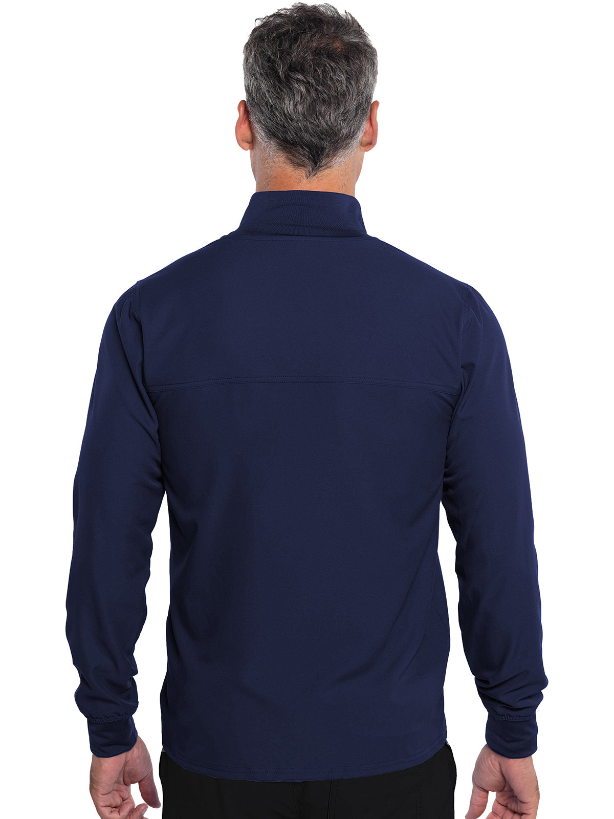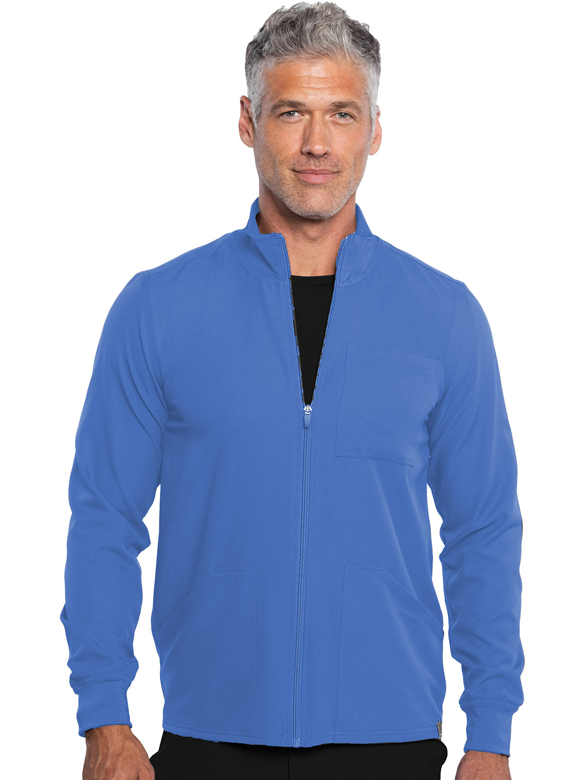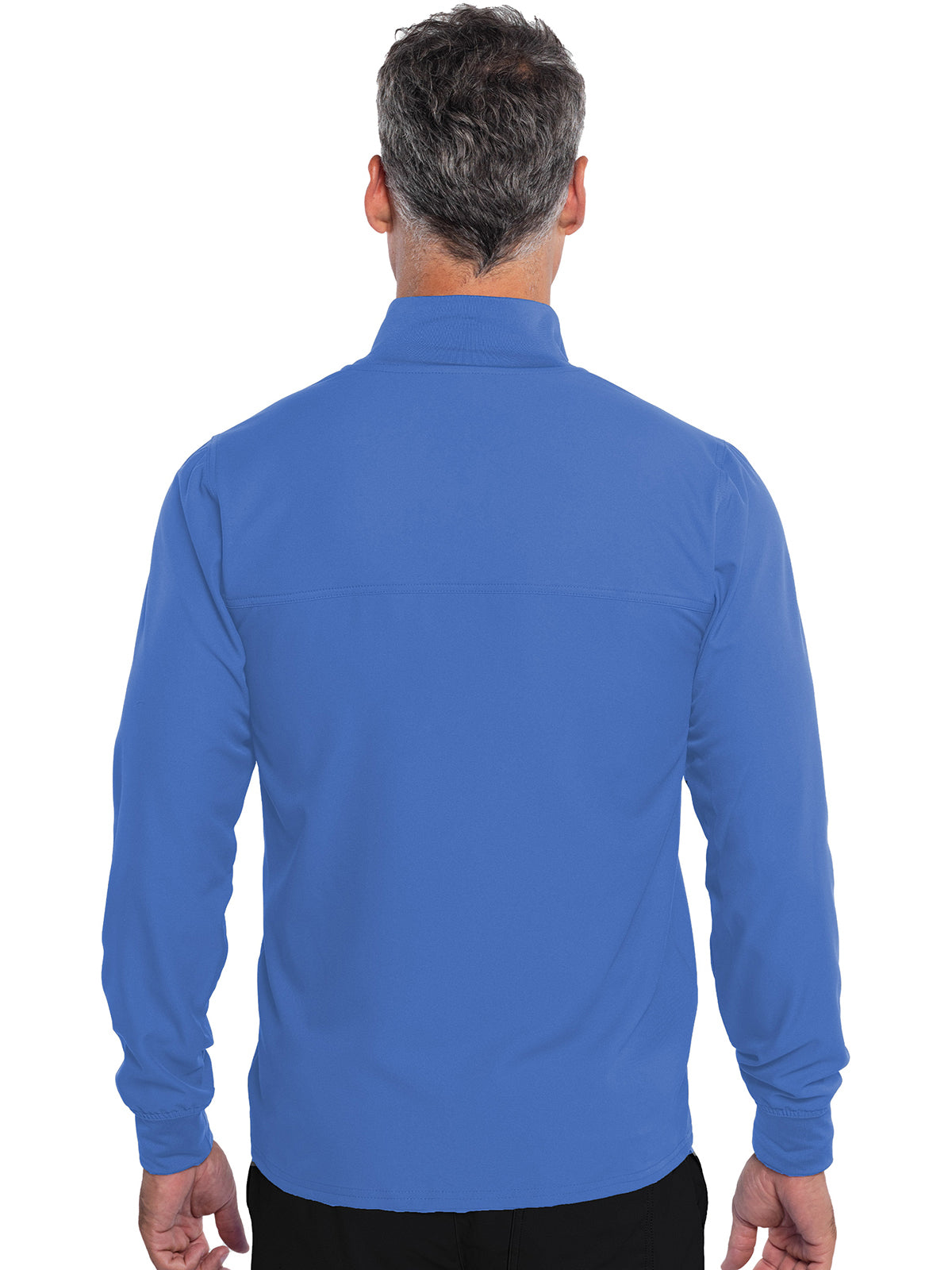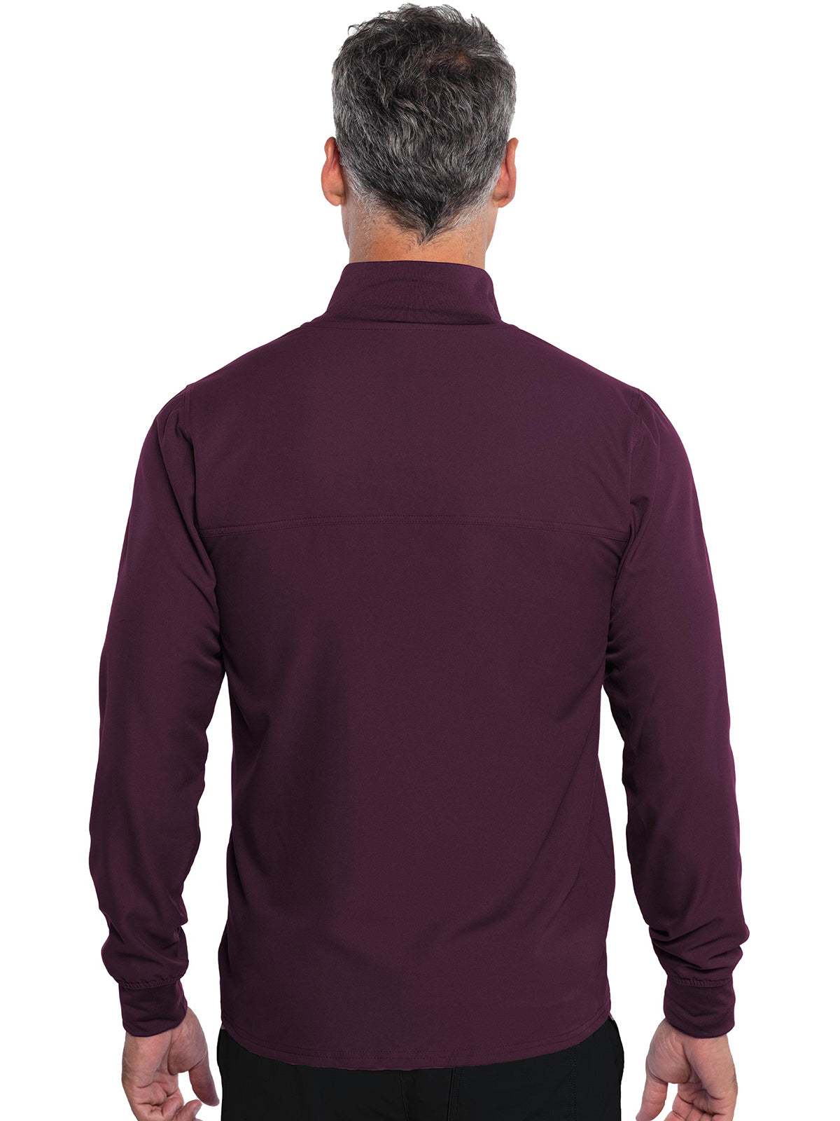 This Men¿s fit zip front jacket features a jersey knit stand-up collar and cuffs. There are three pockets for storage: one chest patch pocket and two slanted patch pockets. A back yoke completes this style. Center back length: 28 1/2"