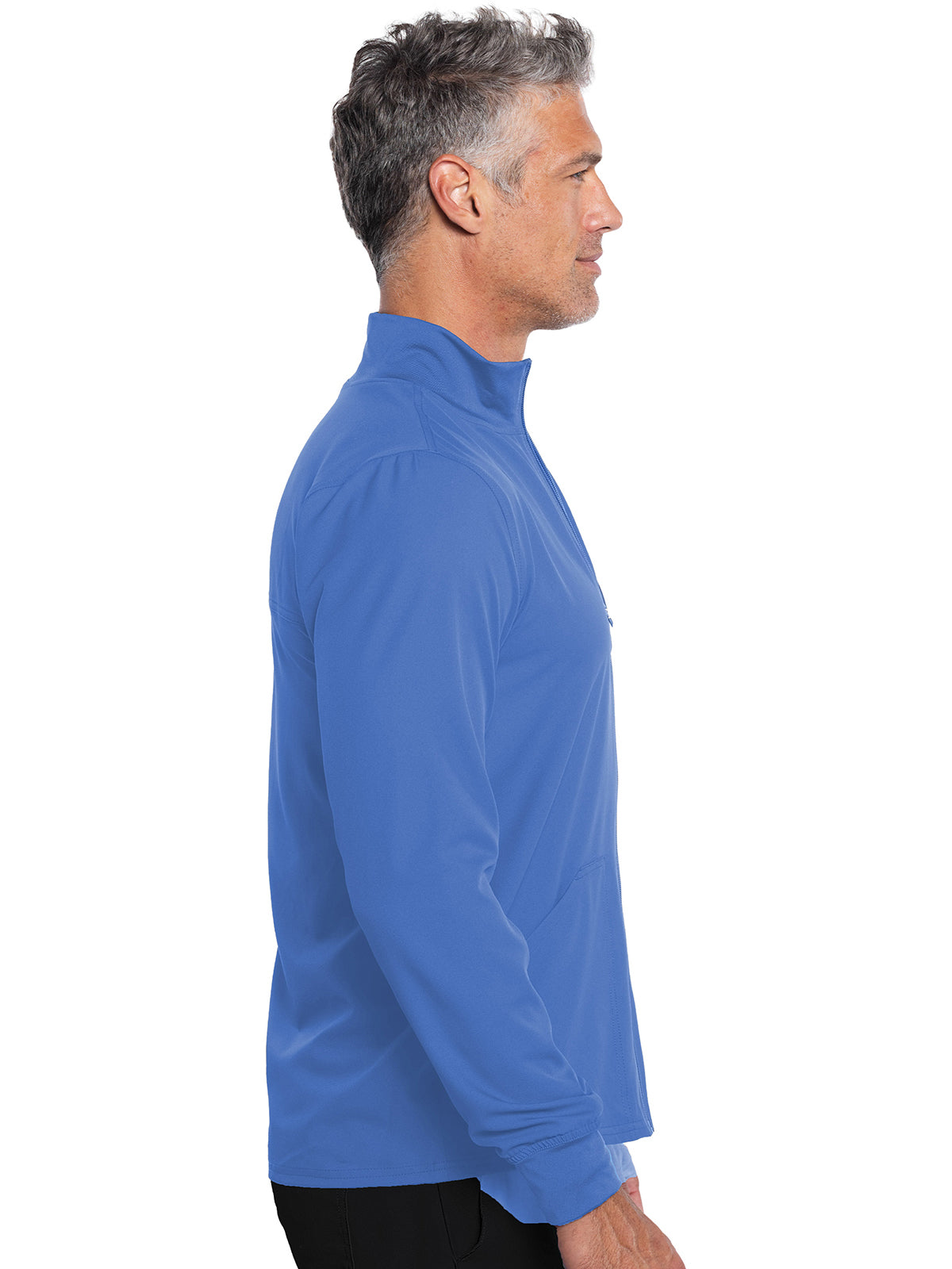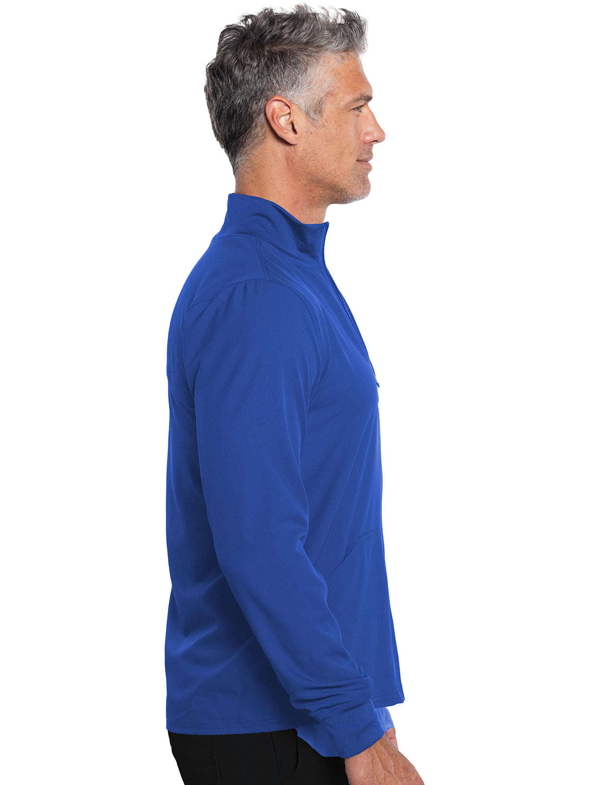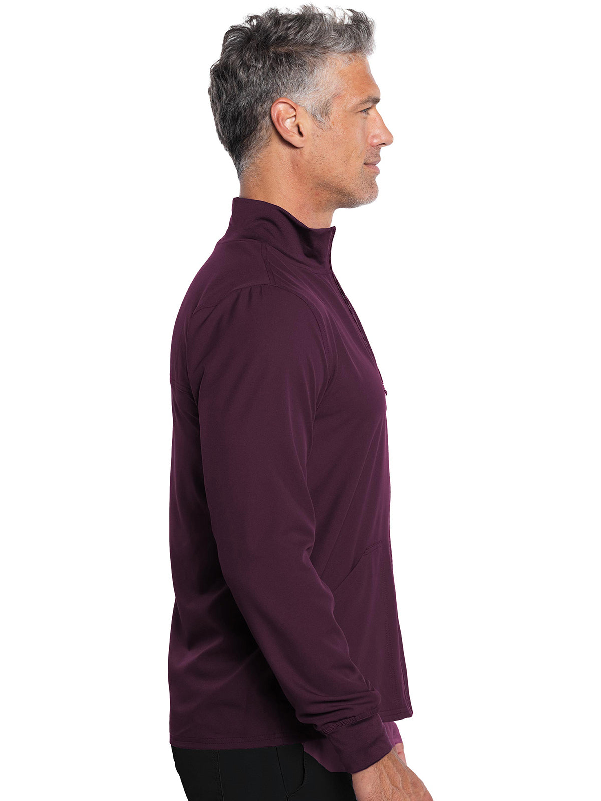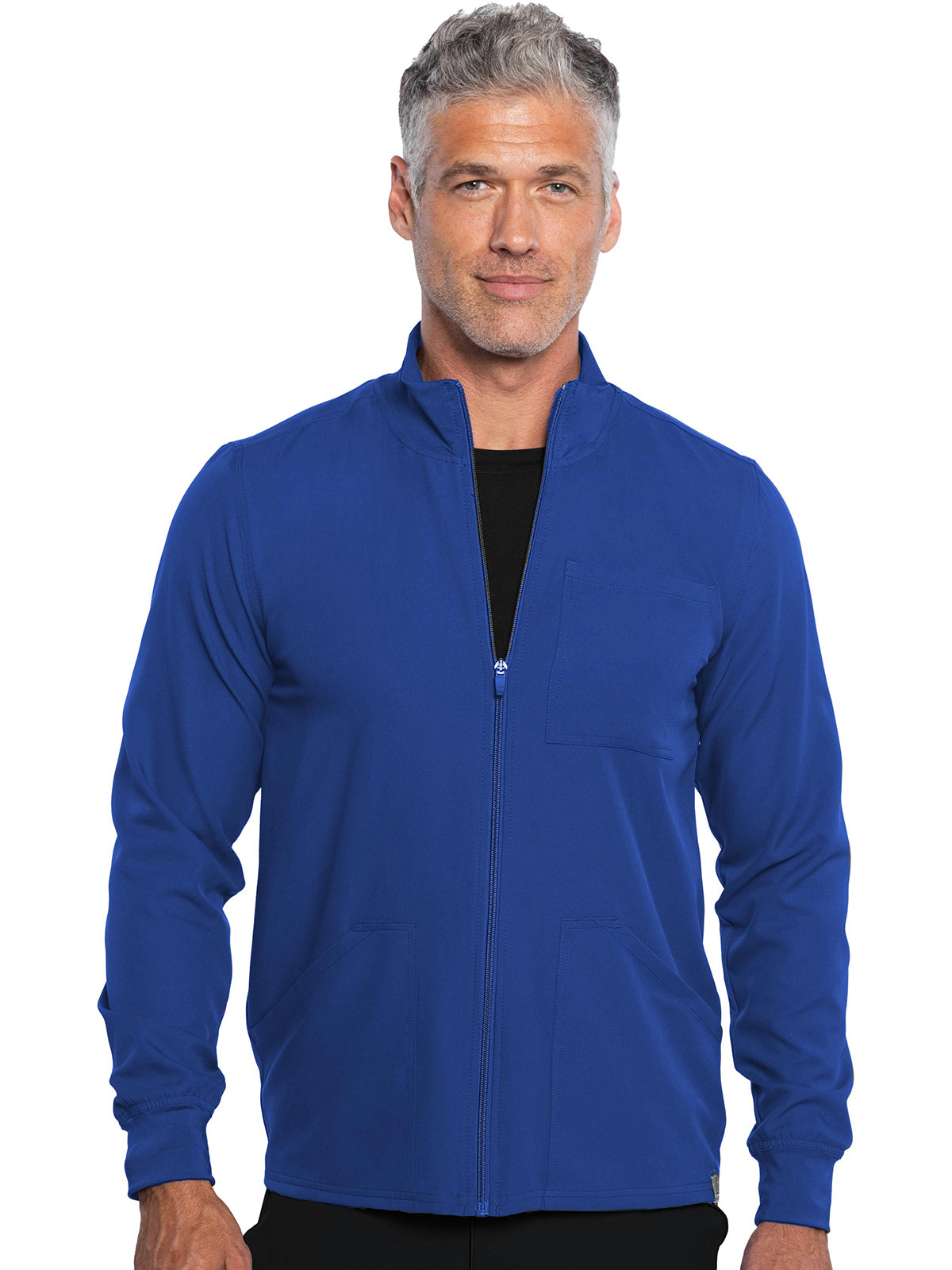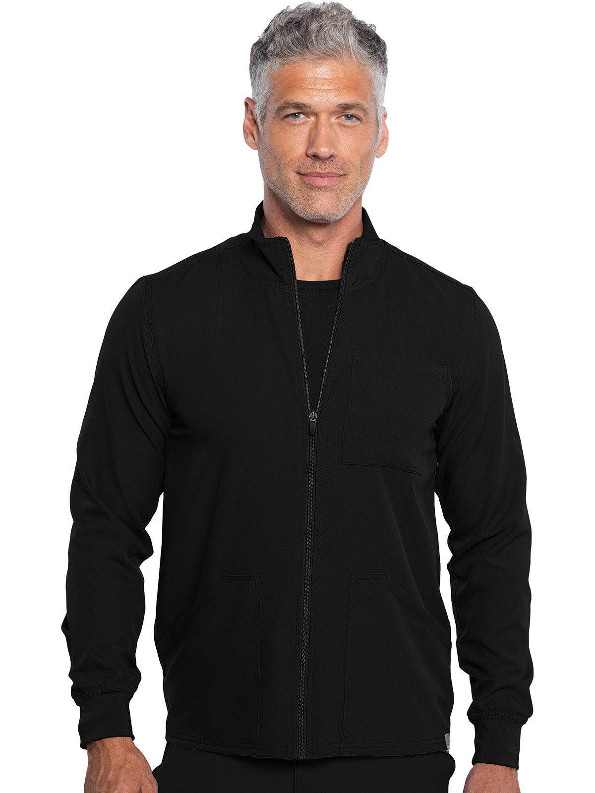 This Men¿s fit zip front jacket features a jersey knit stand-up collar and cuffs. There are three pockets for storage: one chest patch pocket and two slanted patch pockets. A back yoke completes this style. Center back length: 28 1/2"
