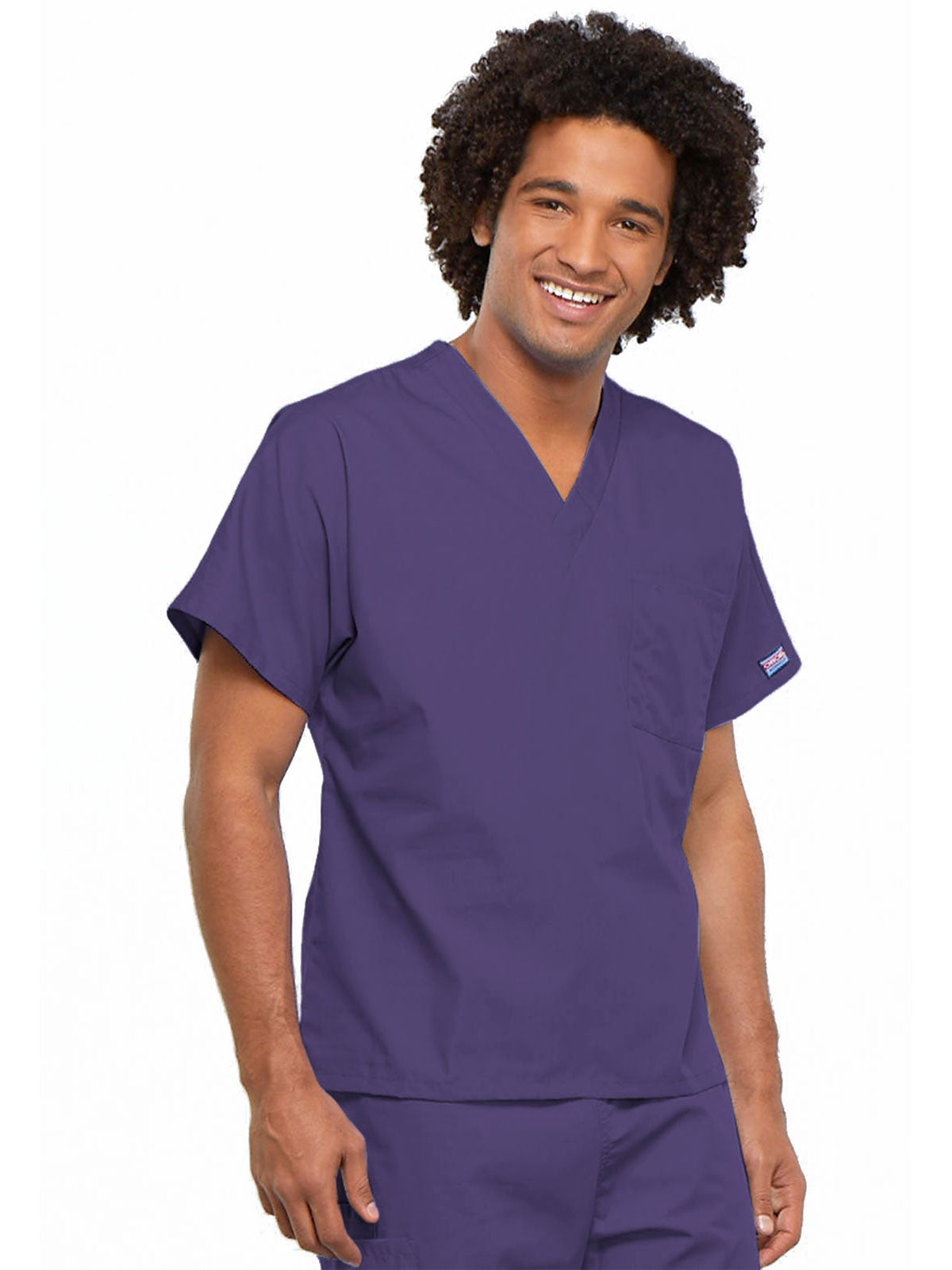 Unisex Fit, V-neck top features Dickies logo twill tape at the back neck, a front chest pocket with a bar-tacked pencil slot and side vents. This style looks great tucked in or untucked. Center back. Sizing Unisex fit Center back...