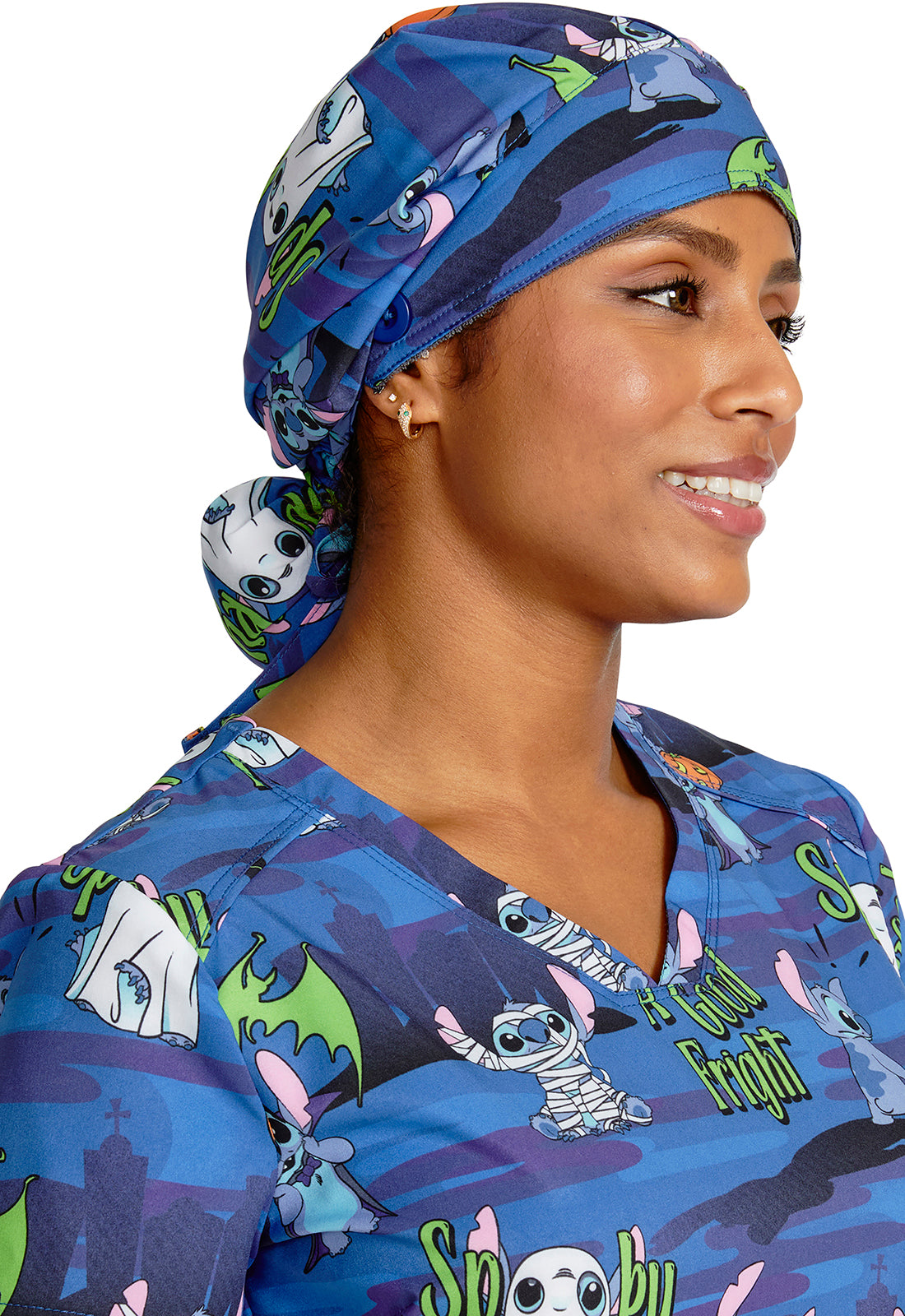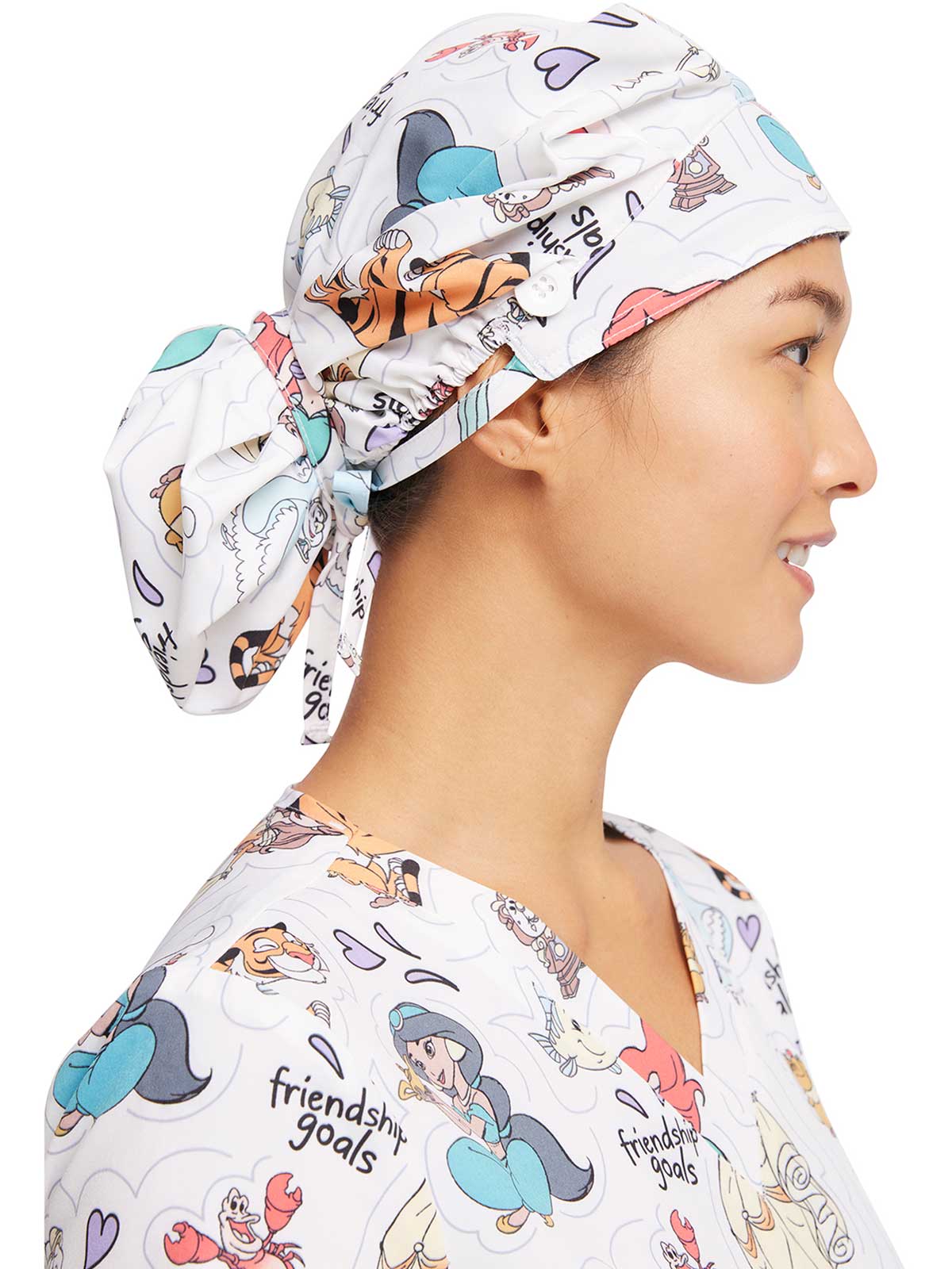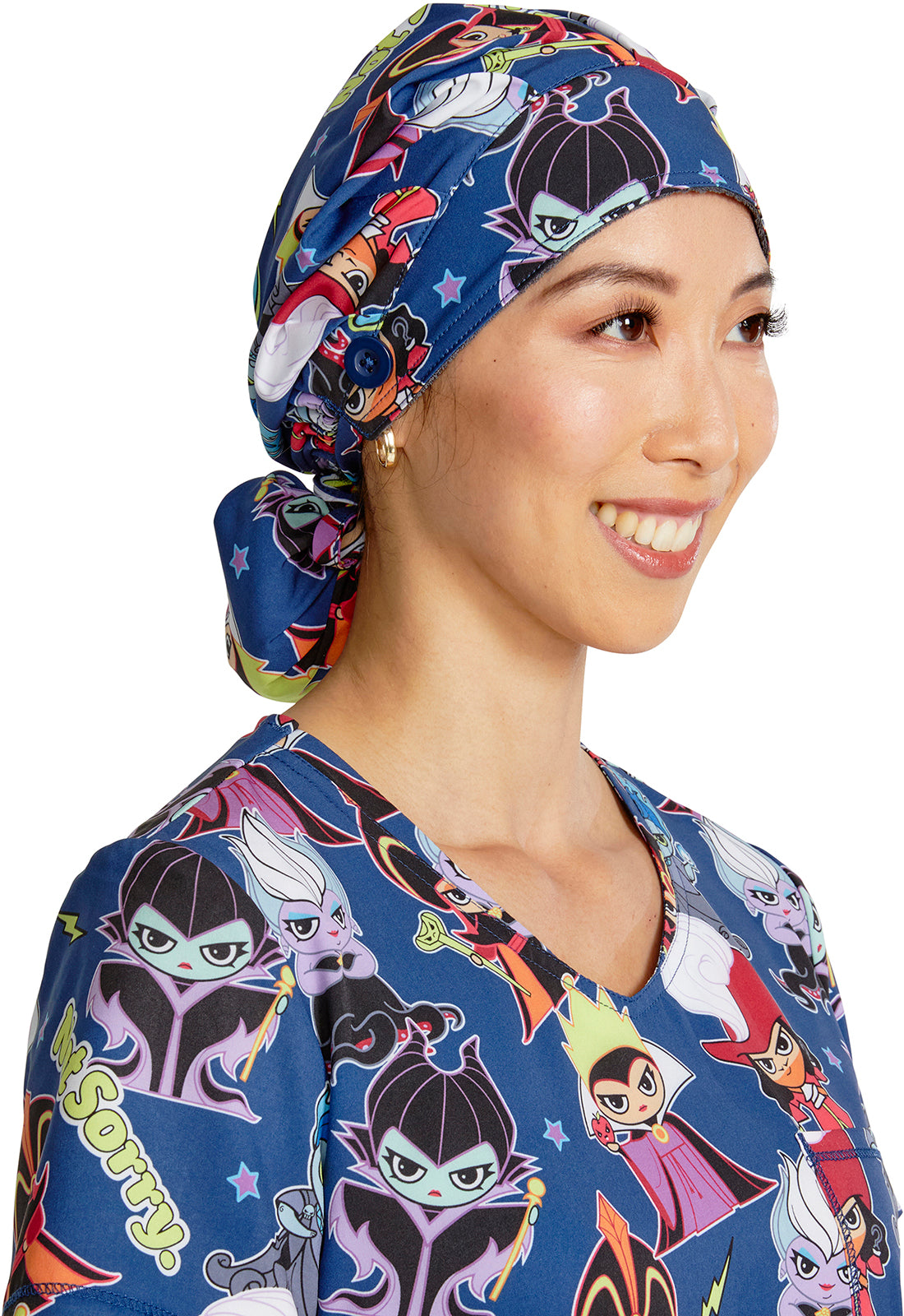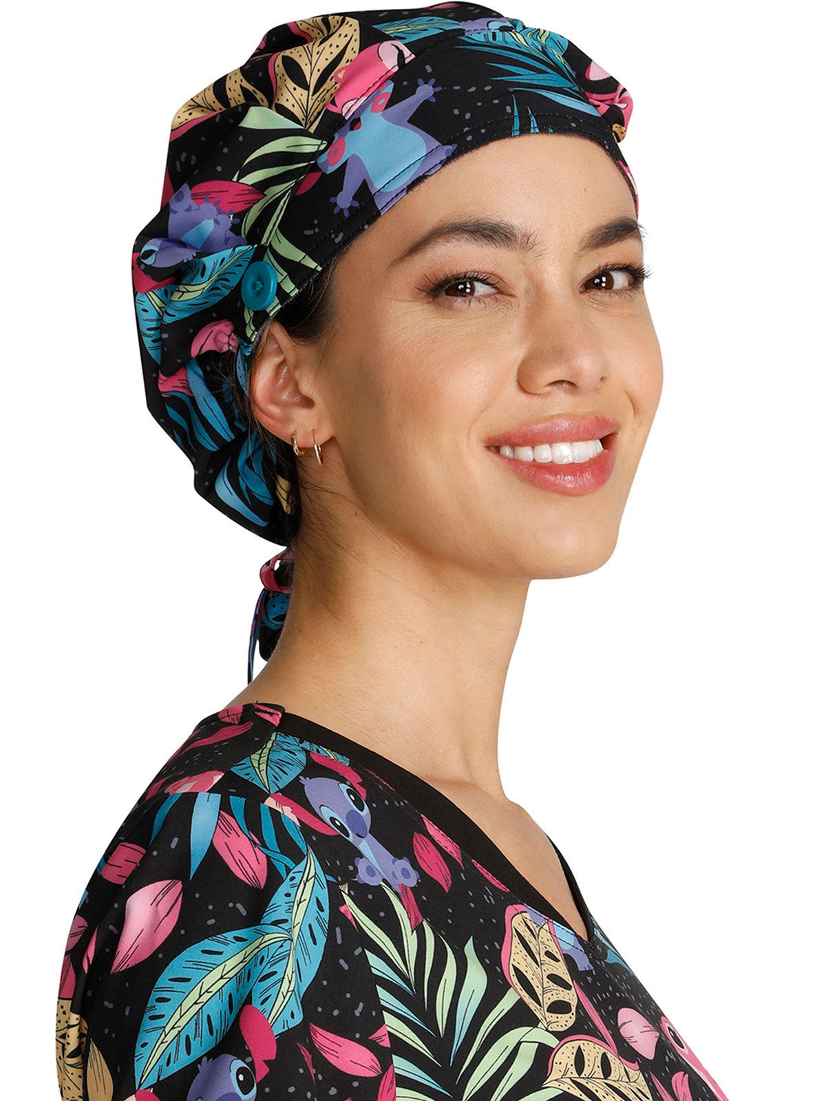 This roomy print bouffant scrubs hat features buttons by ears to comfortably hold a protective face mask in place. (Mask sold separately.) Hat also includes front pleats with enough fullness for complete hair and ear coverage and terry cloth sweatband...