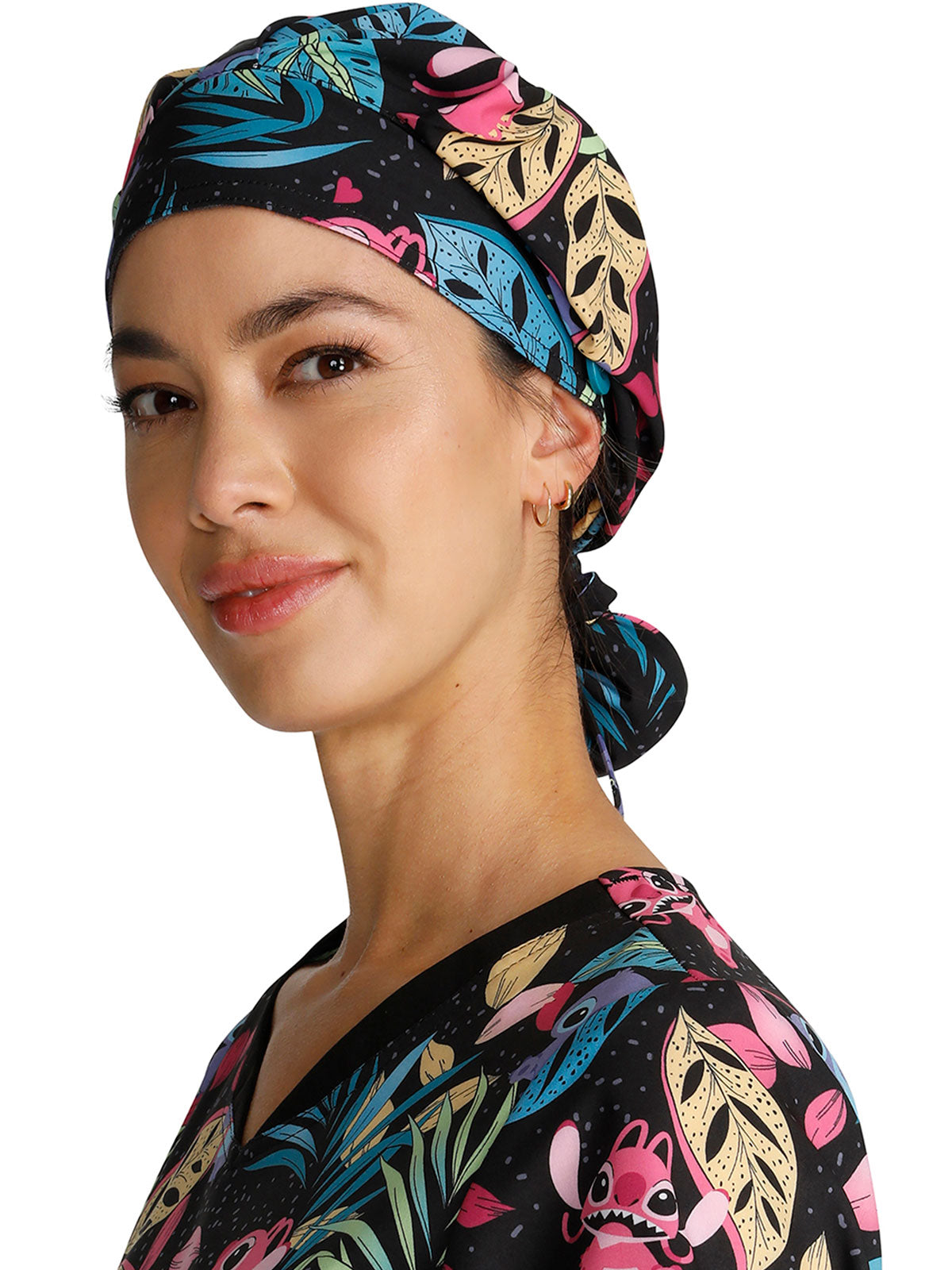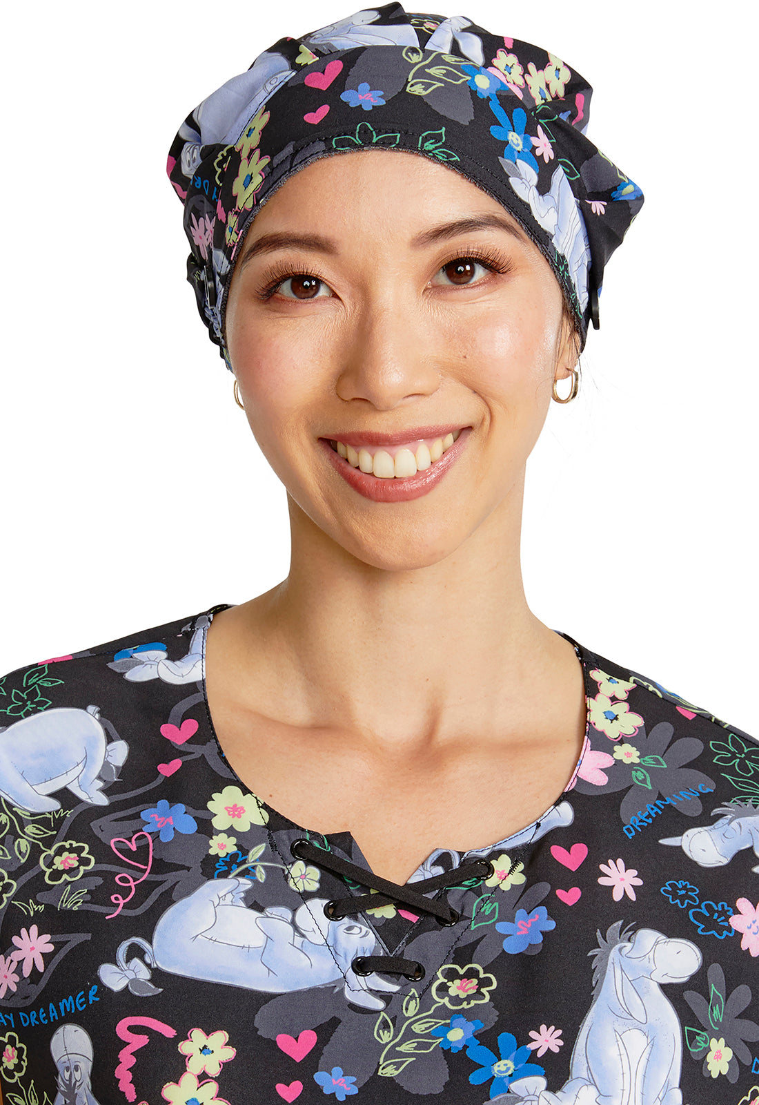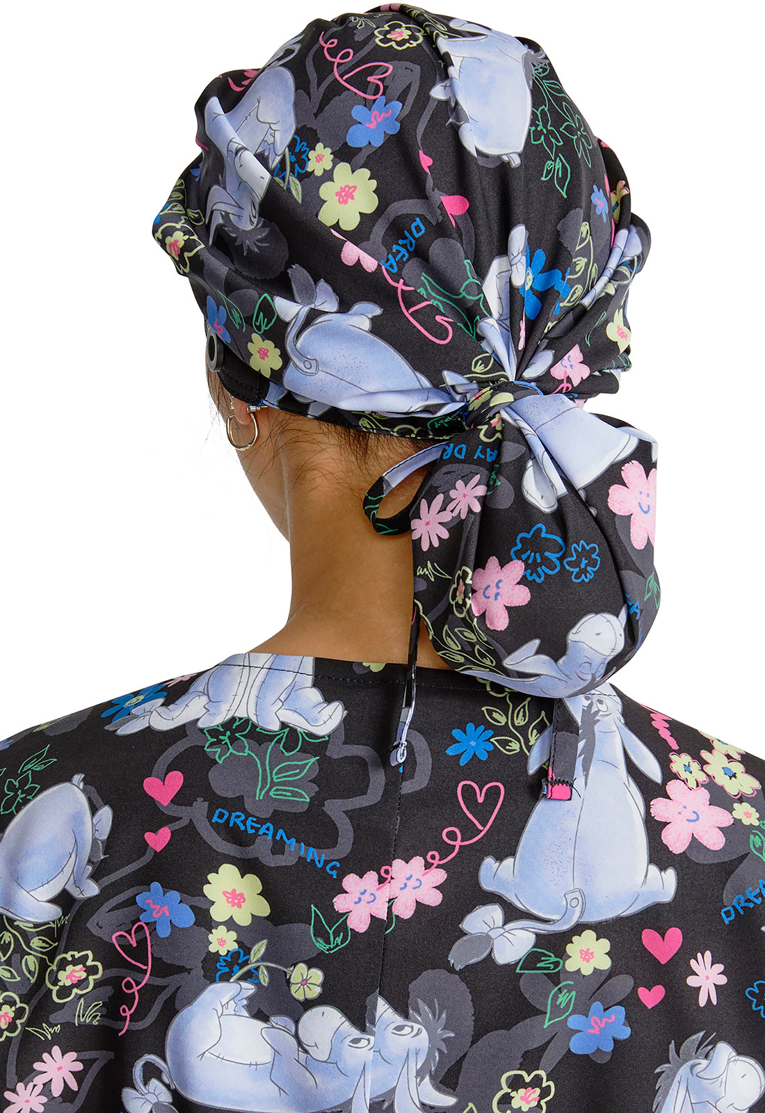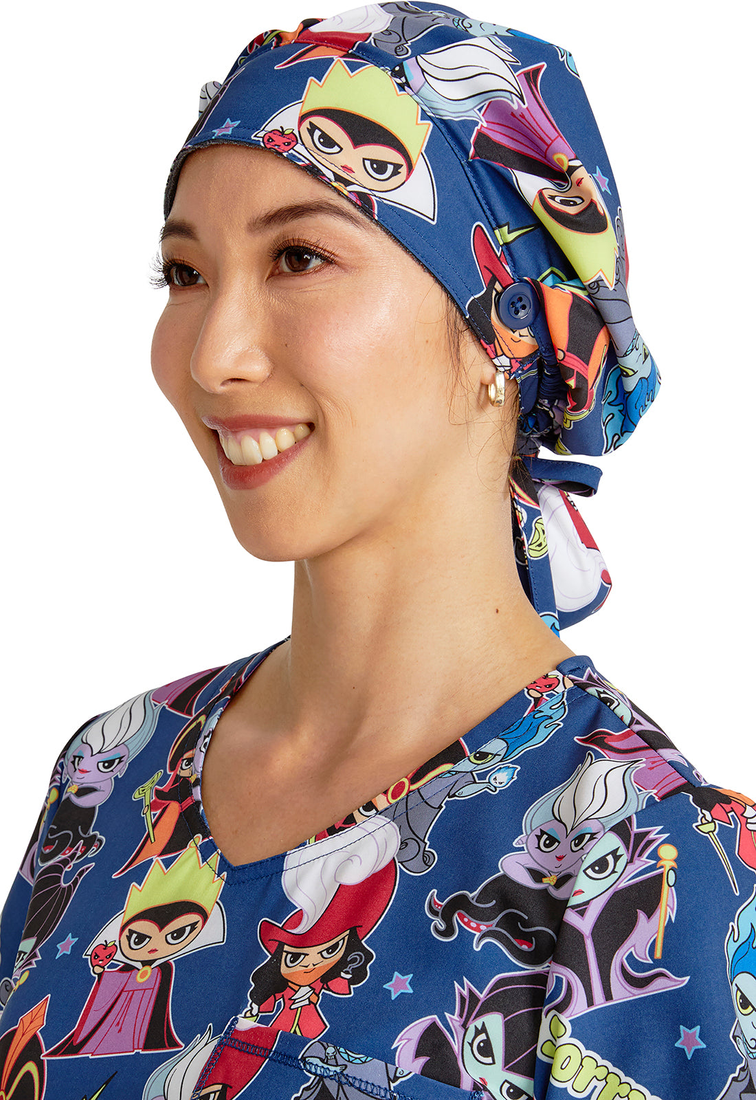 This roomy print bouffant scrubs hat features buttons by ears to comfortably hold a protective face mask in place. (Mask sold separately.) Hat also includes front pleats with enough fullness for complete hair and ear coverage and terry cloth sweatband...