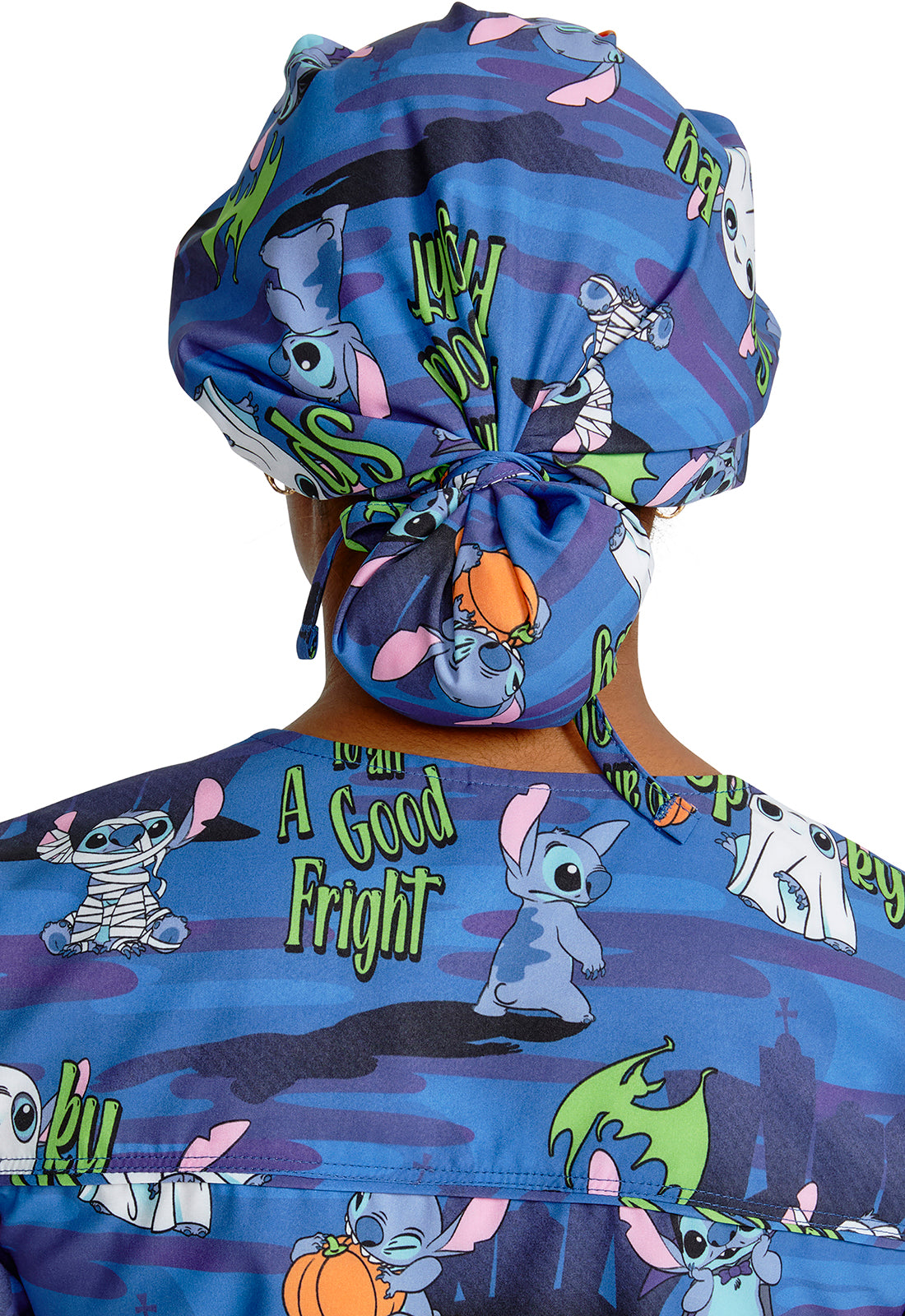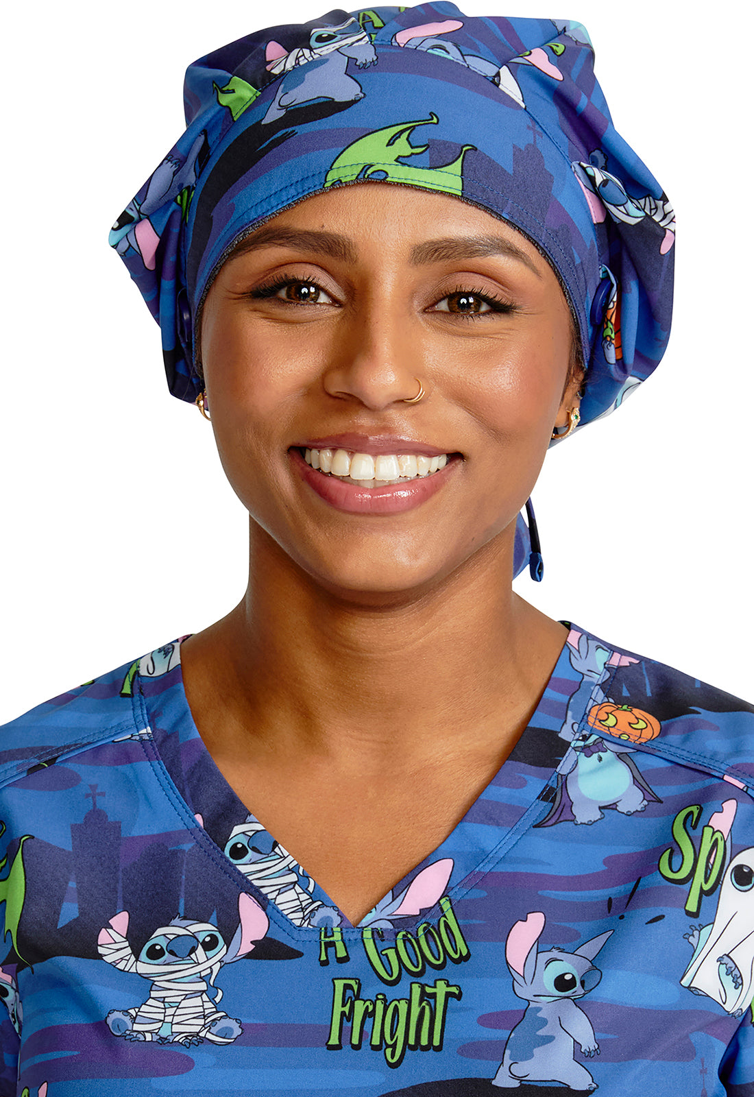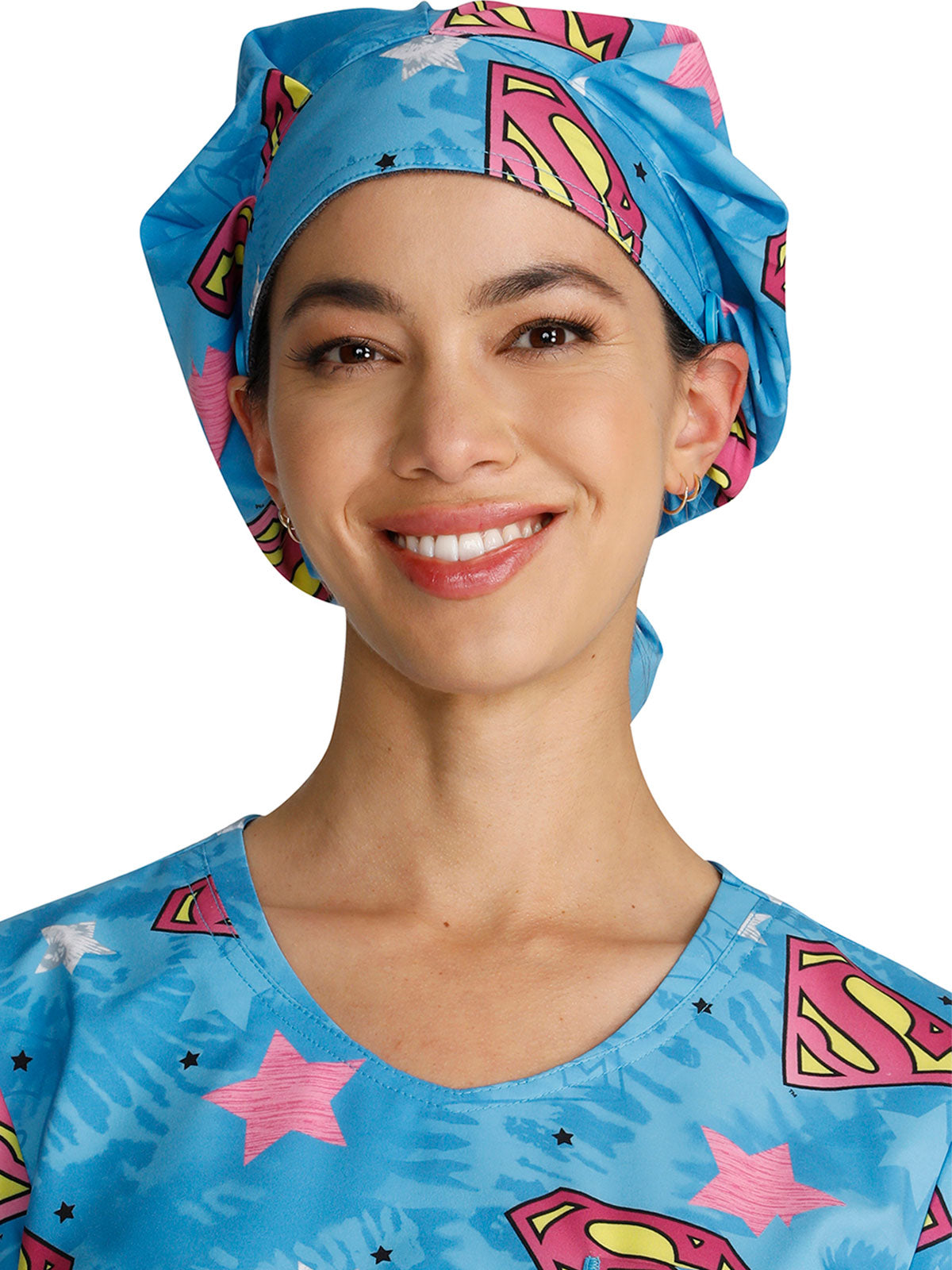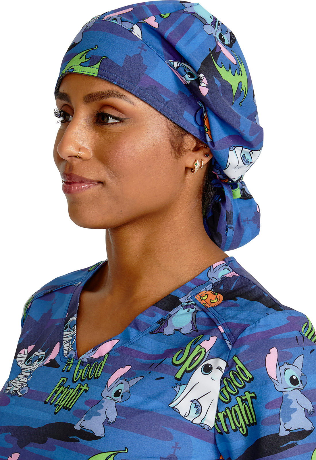 This roomy print bouffant scrubs hat features buttons by ears to comfortably hold a protective face mask in place. (Mask sold separately.) Hat also includes front pleats with enough fullness for complete hair and ear coverage and terry cloth sweatband...