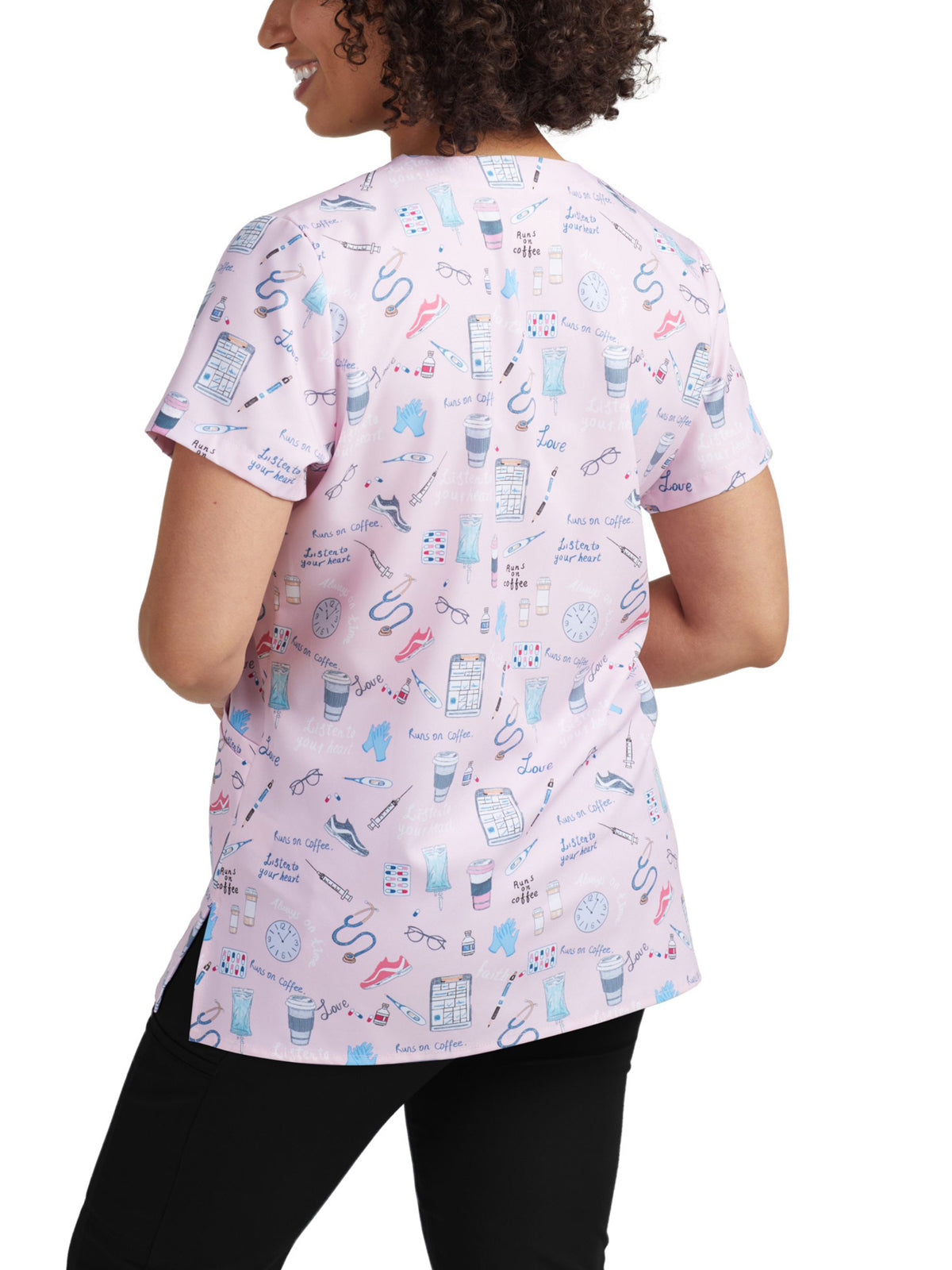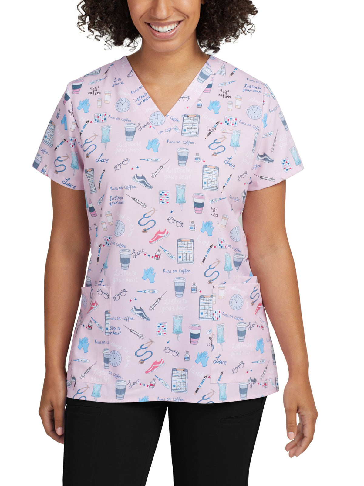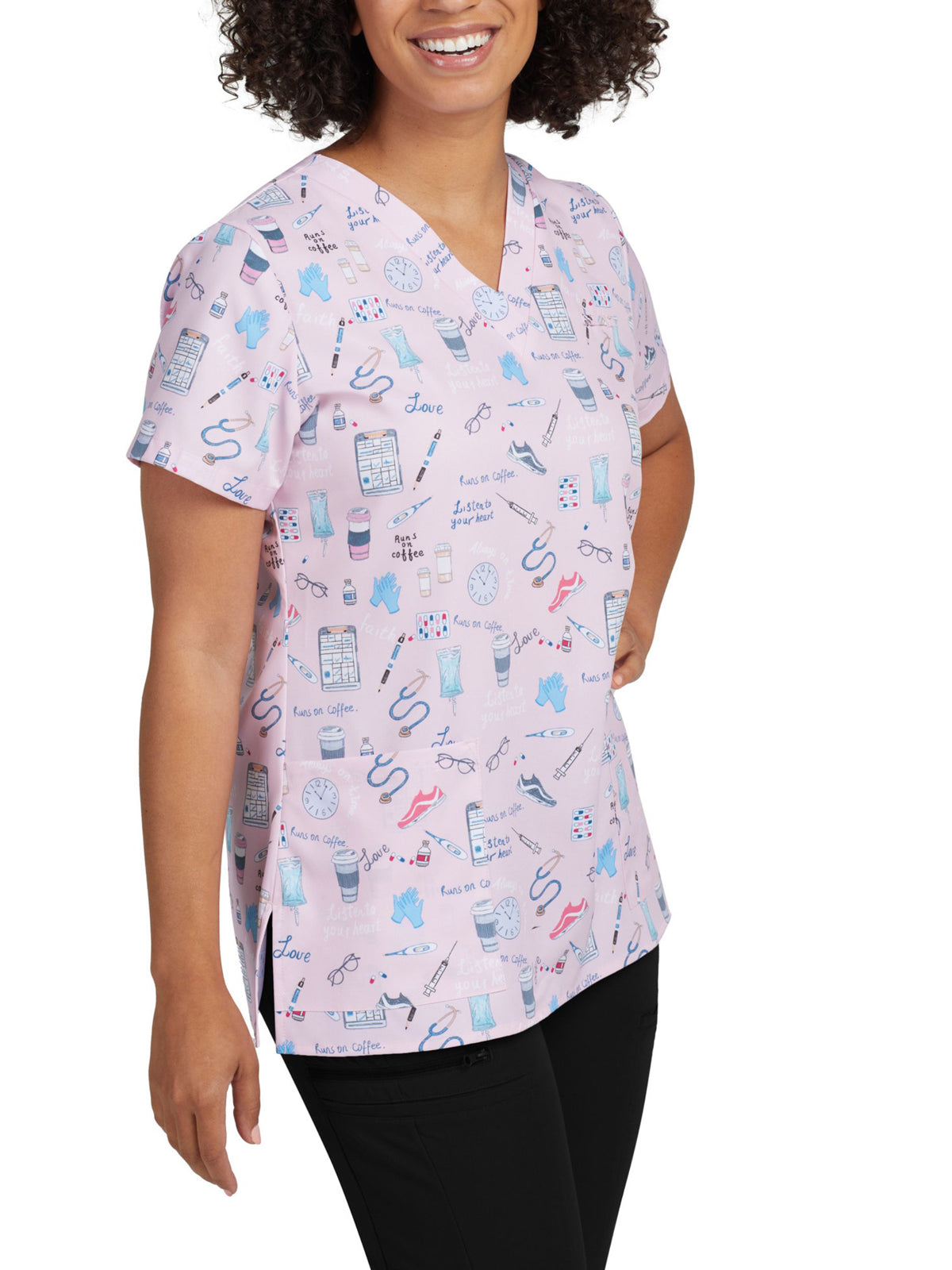 Our women's 3-pocket V-neck scrub top adds both comfort and fun to your work shift with breathable, 2-way stretch for mobility and a silky soft touch for all-day comfort. Created with a V-neck, side vents for extra ease of movement, and a contemporary Slim Fit that's contoured to conform to your body and complement your shape.