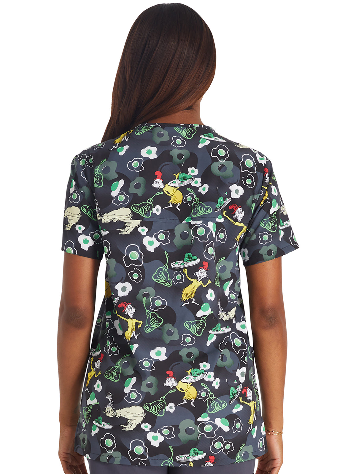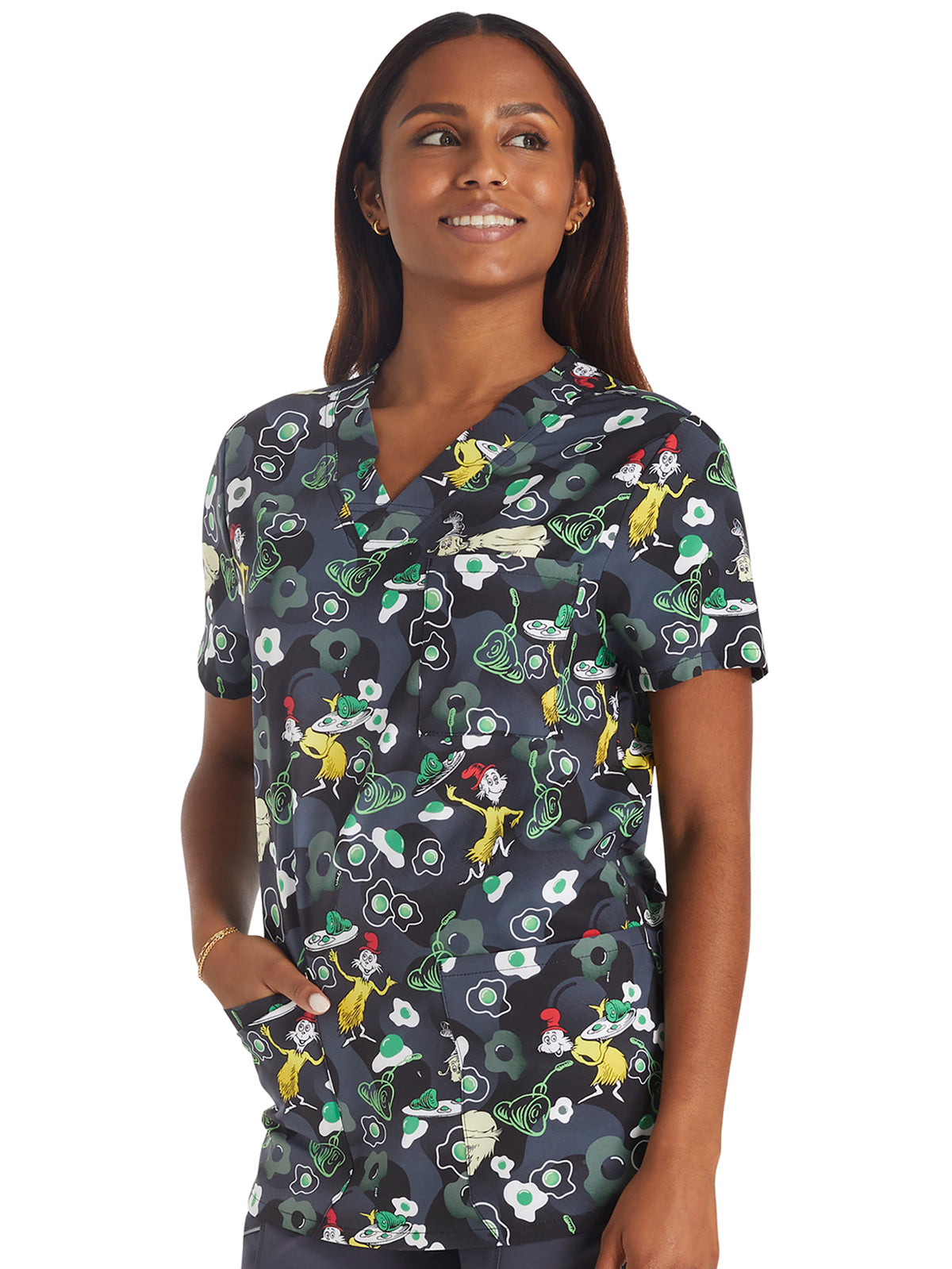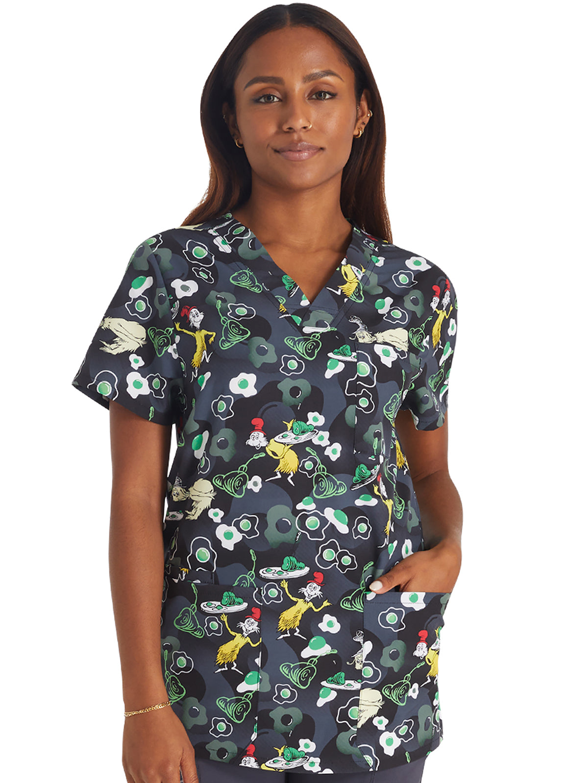 The "I Do So Like" scrub top is from Tooniforms by Cherokee. It has four handy pockets and a stretchy fit, so it's the perfect choice for adding a touch of playfulness to your uniform Center back length: 28".