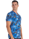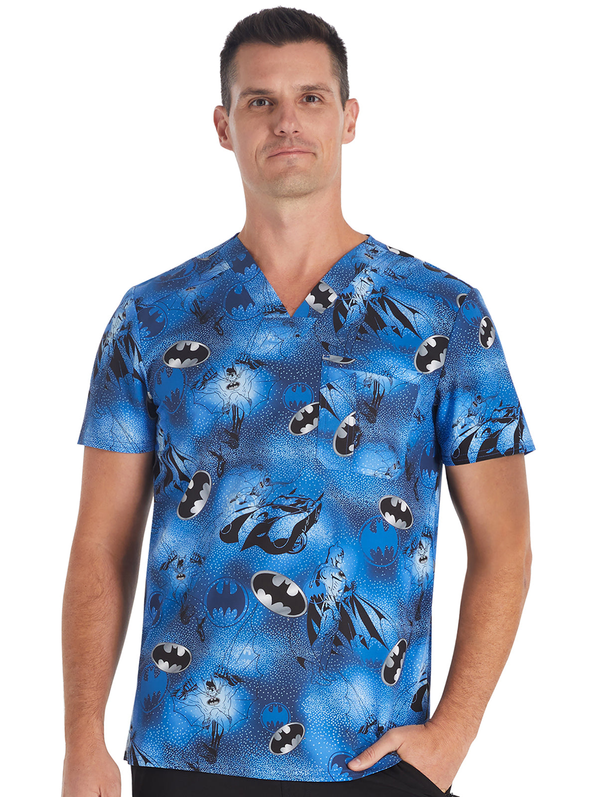 This modern classic unisex fit v-neck print top features front and back yoke seams, a chest pocket with a pen slot, and side vents. It has a center back length of 29".