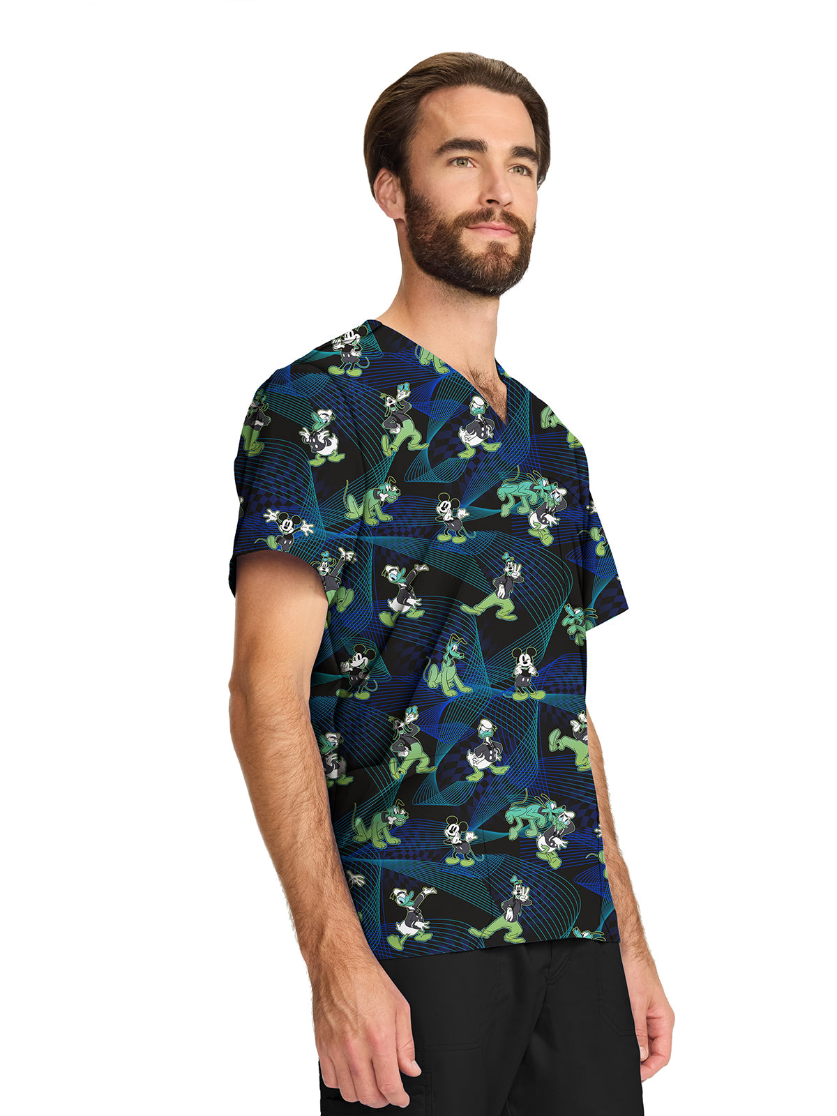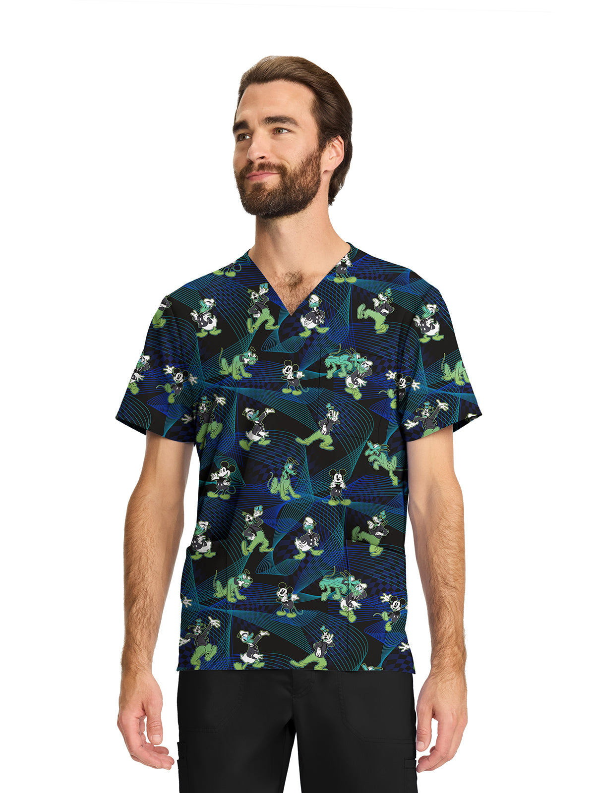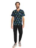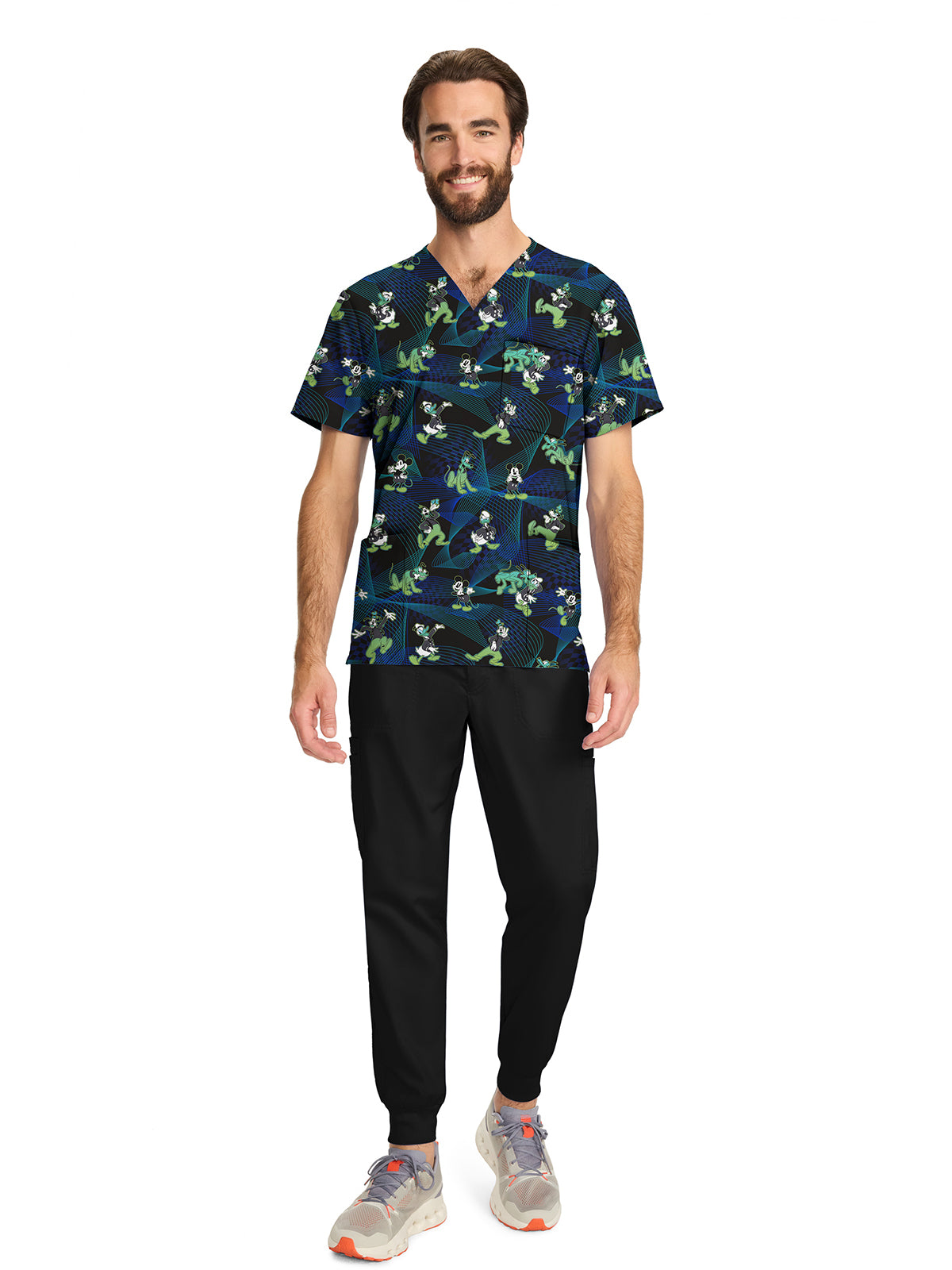 This Men's fit V-neck top has a back yoke seam and side vents. There are three pockets: one chest pocket with a pen slot and two front patch pockets. Center back length: 29"
