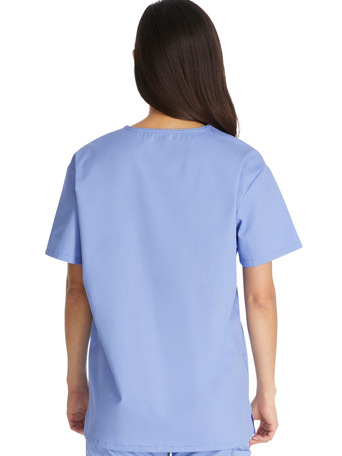 Unisex Fit, V-neck top features Dickies logo twill tape at the back neck, a front chest pocket with a bar-tacked pencil slot and side vents. This style looks great tucked in or untucked. Center back.