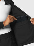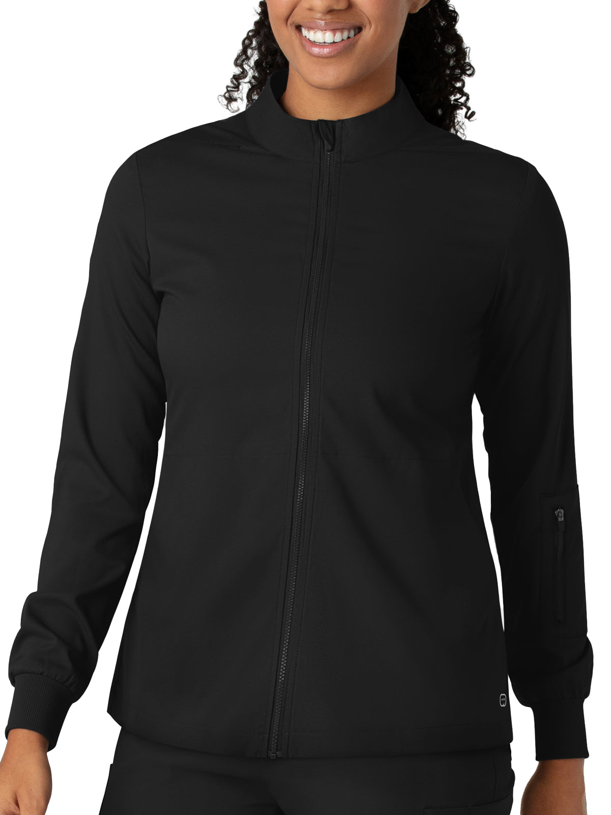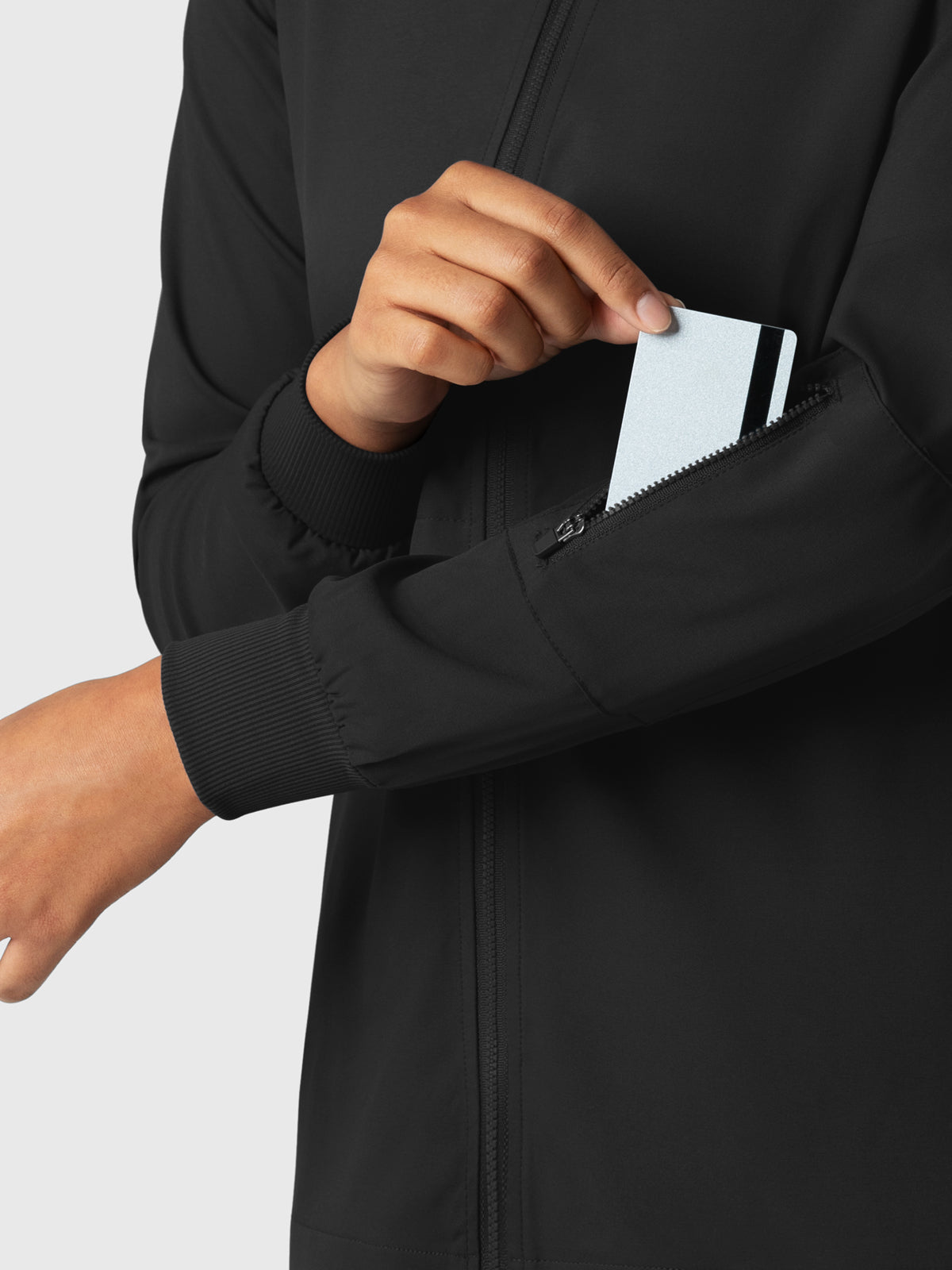 The offices and buildings you work in can be unpredictable when it comes to temperature, which is where this women's warm-up jacket comes in. Layer it over your scrub top anytime you need additional comfort to stay warm, focused and feeling good. It also delivers an extra place to store tools and essentials while your fast-paced shift moves along. Two front pockets let you warm your hands or keep must-haves by your side, while one sleeve card pocket with a zipper secures smaller items. Hold your tablet in a generous pocket on the inside, designed to provide hands-free mobility as you're editing patient charts or preparing for appointments. The full-zip front is all about versatility, giving you options when temperatures fluctuate from room to room. Ribbed cuffs draw the silhouette in for a modern profile that stays cozy. Because when you're comfortable, you're able to do your best work.