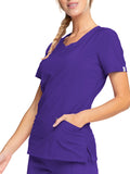 A Contemporary fit round neck top with a rib-knit inset at the front neckband also features shoulder yokes, a bungee ID badge loop on the right shoulder, front and back princess seams, two patch pockets, one interior pocket, and side vents. Stretch rib-knit at the center back panel gives this top its slimming shape and allows for extra movement and comfort. Coverstitch detail throughout. Center back length: 26". The comfortable stretch poplin fabric and super stretchy rib-knit is the perfect combo for healthcare professionals.