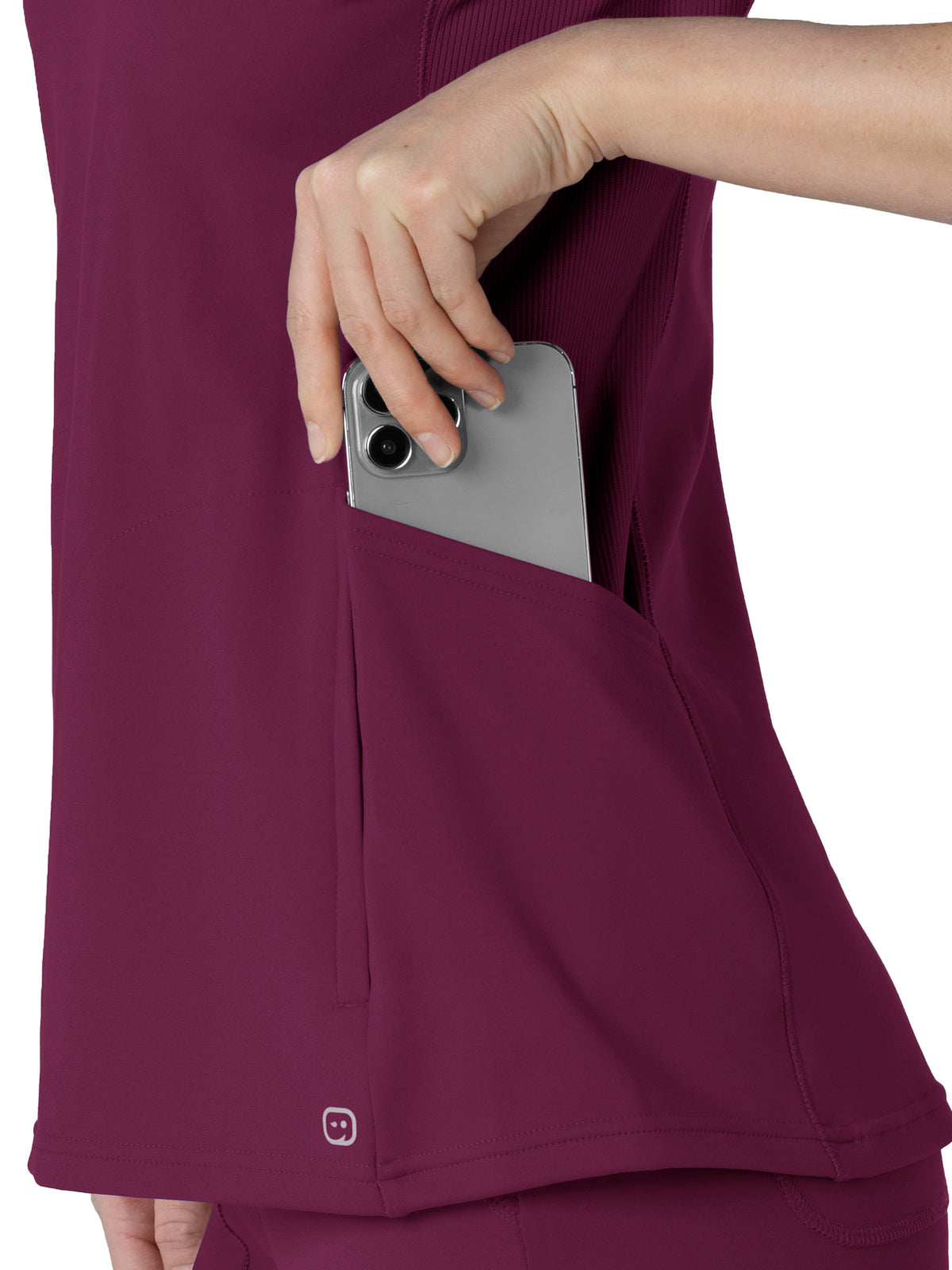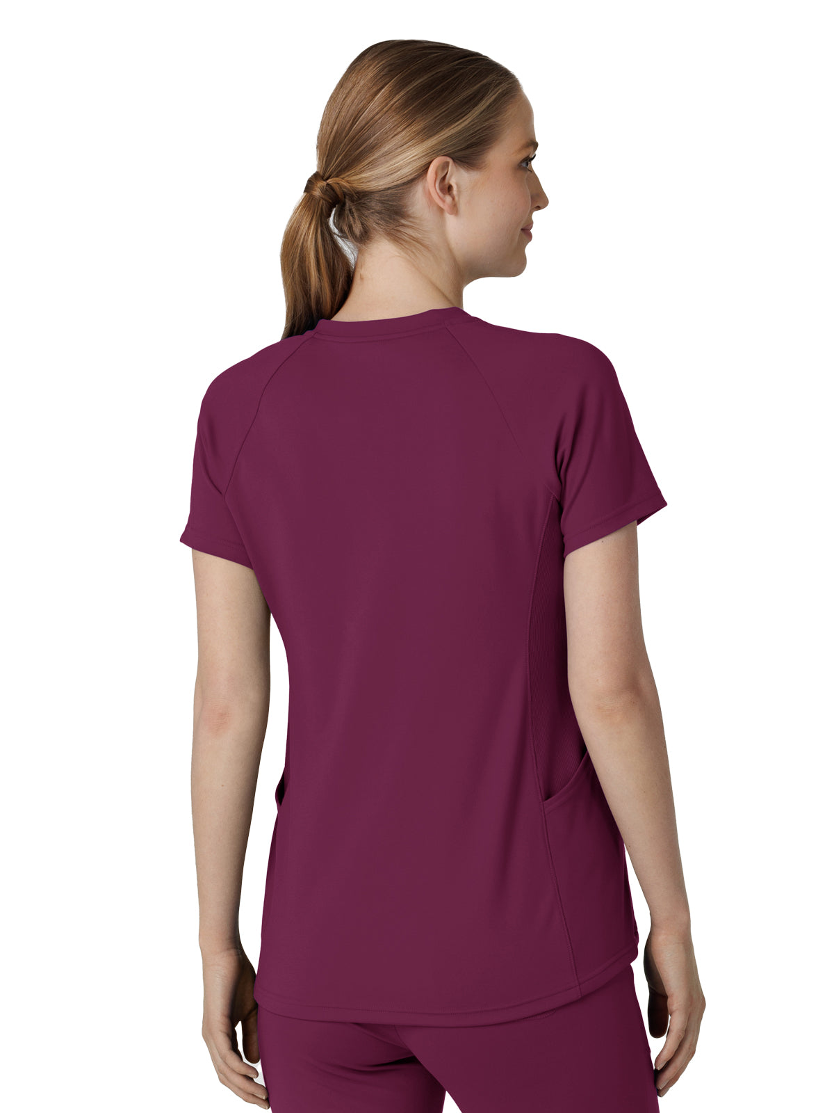 Knit raglan sleeves and comfortable details make this women's scrub top a perfect match for your busy shifts. It's built from soft and stretchy fabric that makes movement easy. Because lifting and leaning are part of the job, our Flex-n-Reach panels provide extra stretch where you need it most. A curved droptail hem gives you a flattering fit plus coverage that lets you travel confidently through your day. It pairs perfectly with slim-fit scrub pants, delivering a modern look that's polished and professional. Two front zip pockets and one side top-loading pocket hold all the tools and essentials you need for a successful day balancing your to-do list and unexpected tasks. Keep your badge at the ready thanks to a loop on one shoulder, then when you don't need it, it stays out of your way. This scrub top has a modern fit that skims your body without feeling too tight or too loose. It's part of our RENEW collection of eco-friendly scrubs.