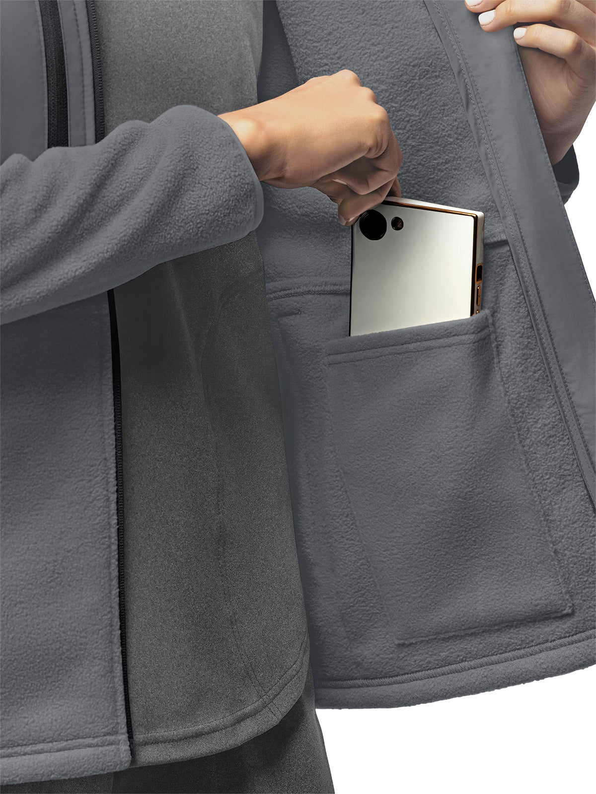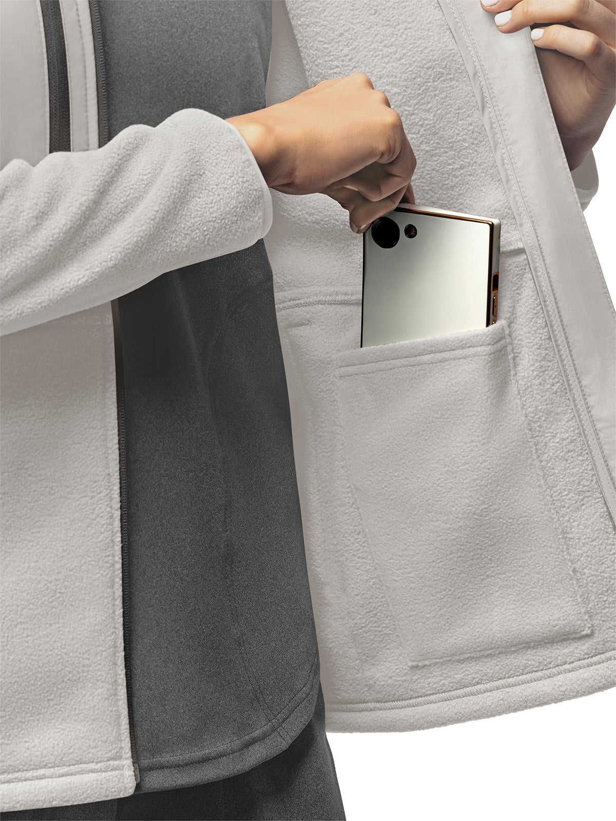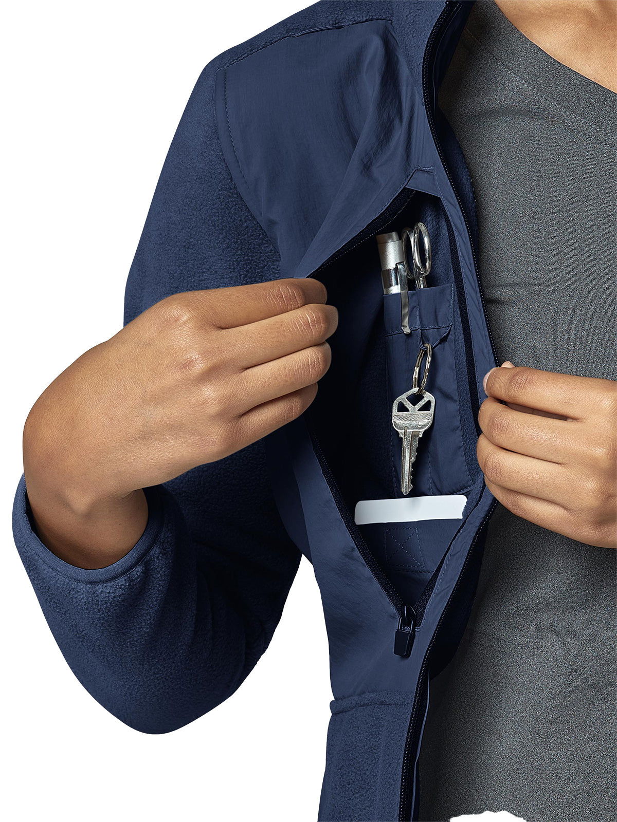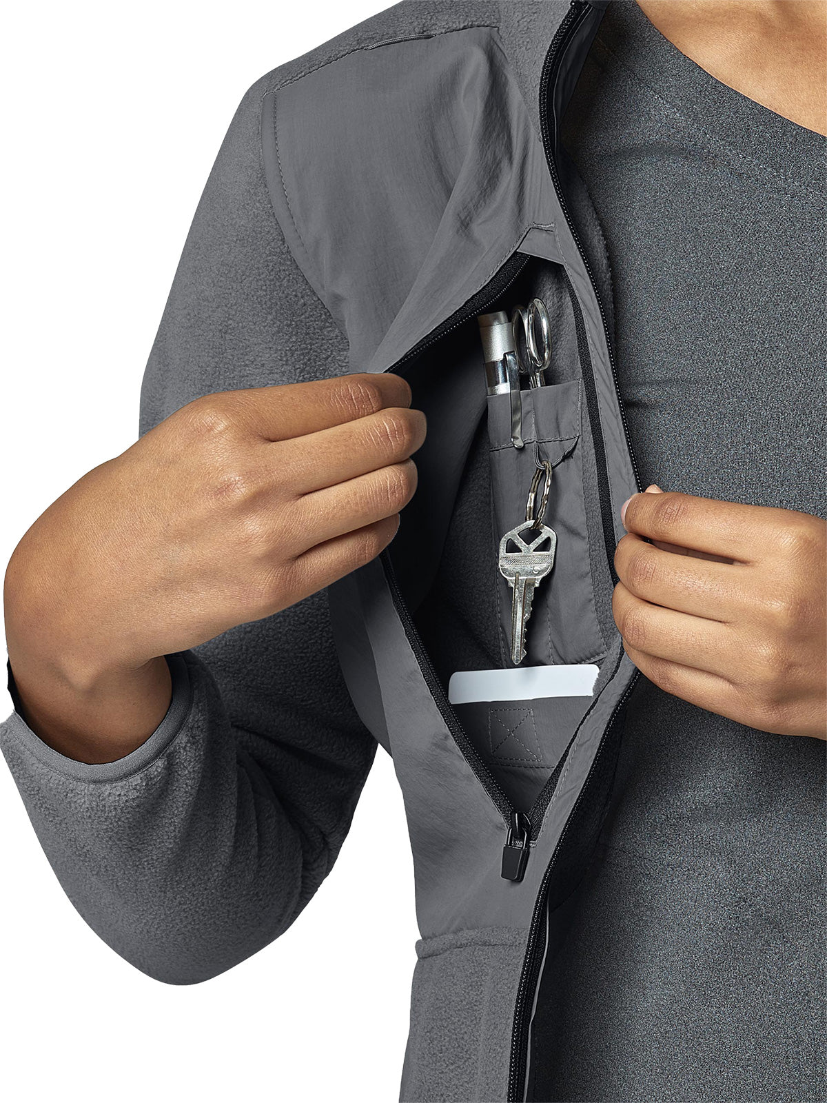 The Slate by WonderWink Women's Micro Fleece Zip Pocket Jacket is not your average fleece jacket. It's designed with secure pockets and slots to stash your keys, pens and cards, an inner pocket for your phone, and a badge loop, so it's truly functional. In ultra-soft, water-repellent microfleece, it's a refined layer that will elevate your work look.