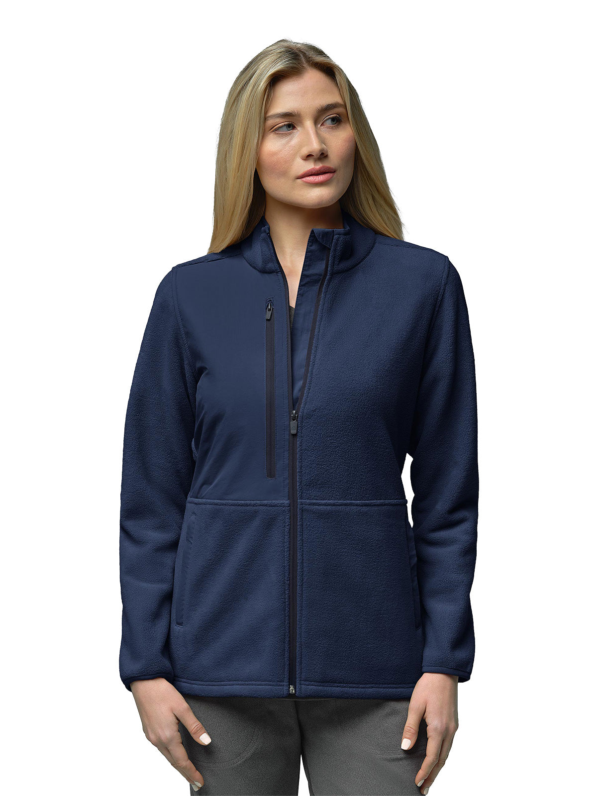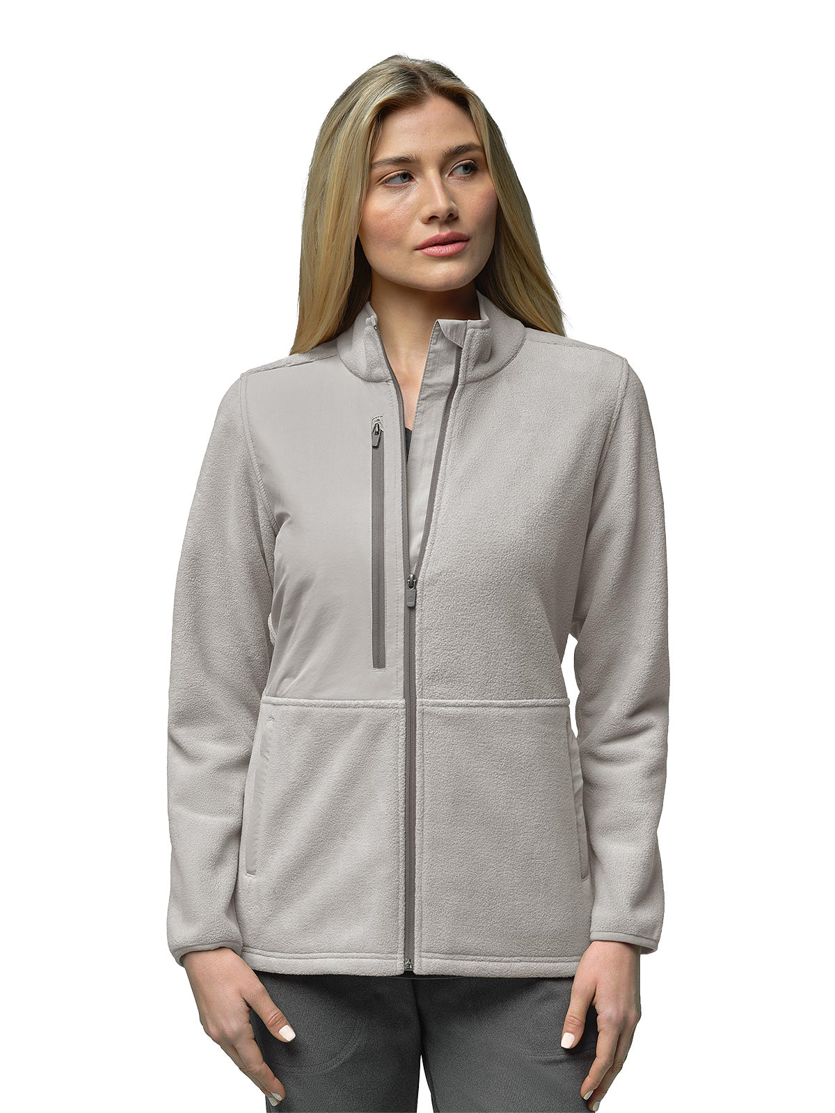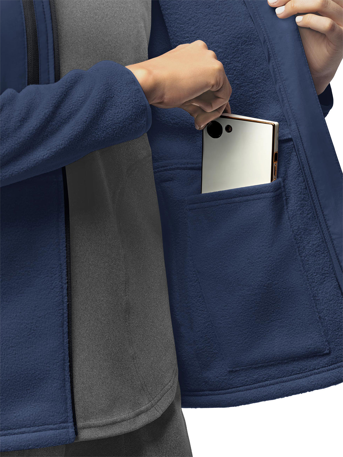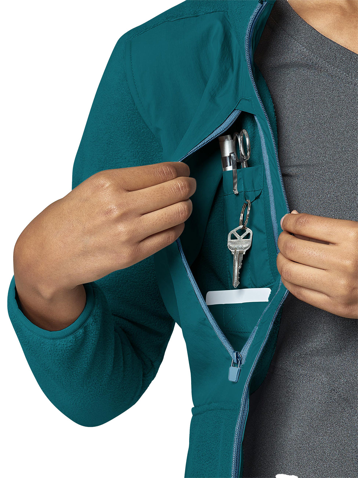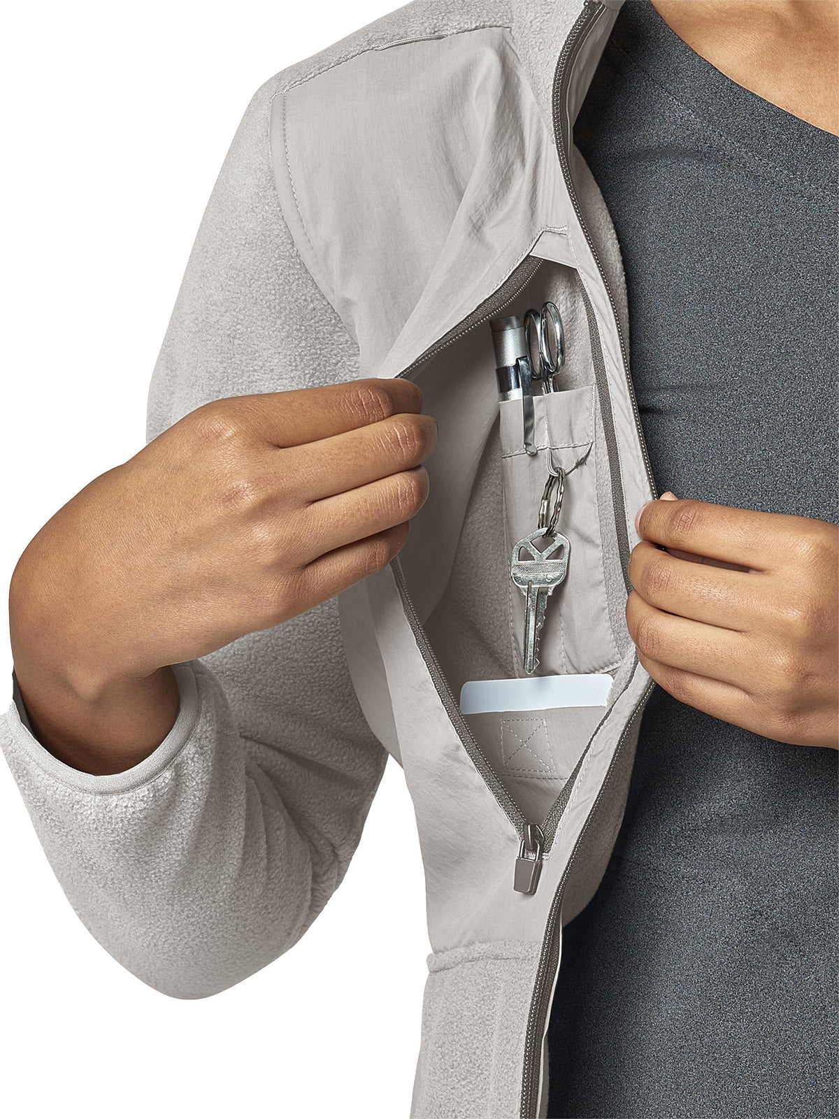 The Slate by WonderWink Women's Micro Fleece Zip Pocket Jacket is not your average fleece jacket. It's designed with secure pockets and slots to stash your keys, pens and cards, an inner pocket for your phone, and a badge loop, so it's truly functional. In ultra-soft, water-repellent microfleece, it's a refined layer that will elevate your work look.