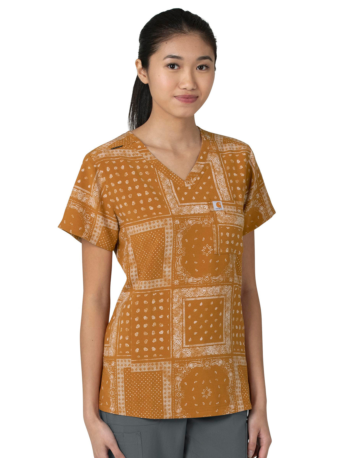 Elevate your professional style with the CROSS-FLEX by Carhartt Women's Tuck-In Fern Stencil Print Scrub Top. Ideal for tucking into your favorite scrub pants, this flattering scrub top is breathable, durable, functional, and oh so comfortable.