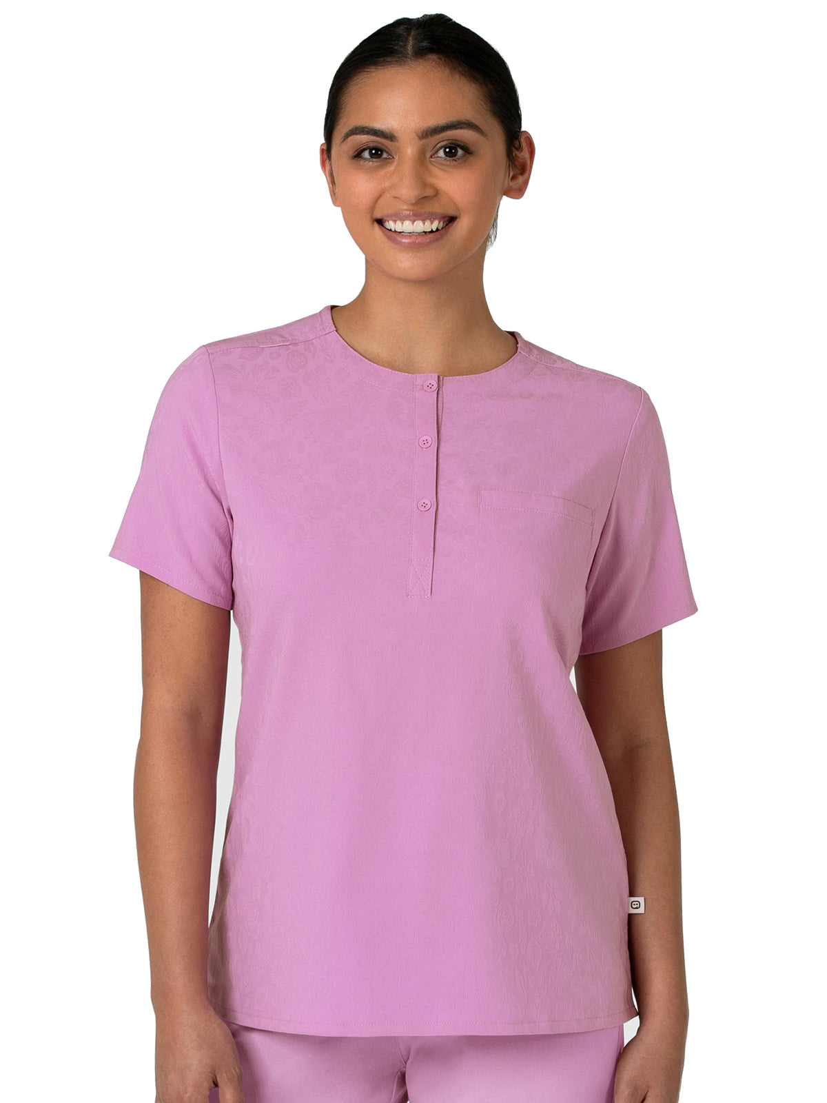 With slimming back fish eye darts and a slightly curved hi-low hem the Wink Women’s Round Neck Tuck-In Top gives you the shaping that you love with extra length in the back for more coverage. This scrub top has a conservative Mandarin style collar that sits close to the neck with grosgrain lower placket details and three dyed to match buttons. This beautiful scrub top isn’t weighed down with pockets and provides one welt chest pocket with a hidden zipper. Made with stretchy fabric giving you the fit and comfort you desire, this scrub top will become a favorite top in your medical scrubs uniform.