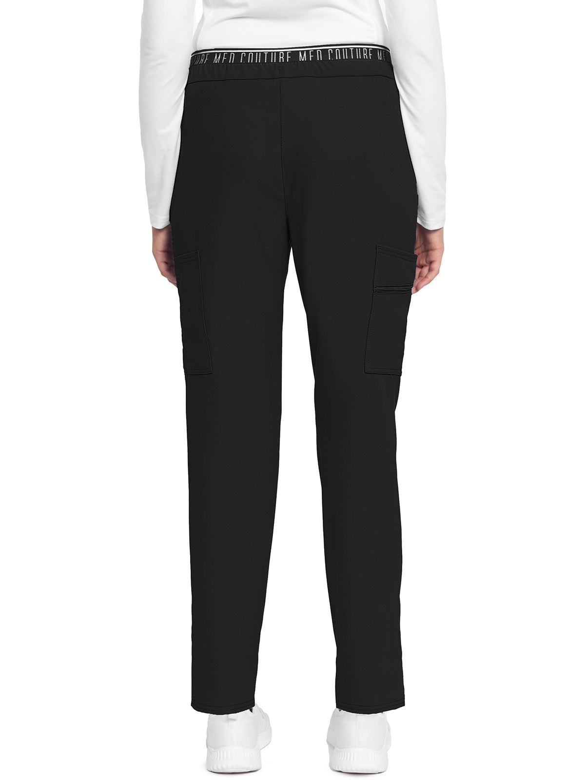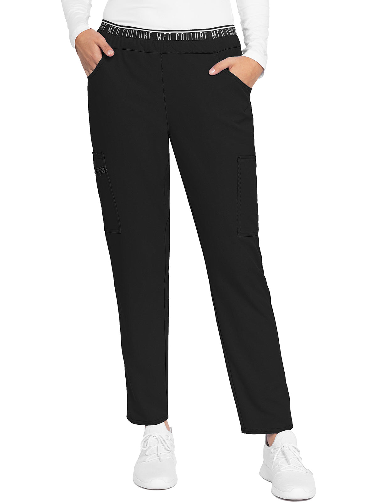 This Missy fit mid rise pull-on ankle pant is designed to skim the ankle bone. It features a peek-a-boo logo elastic waistband with an interior drawstring for style, security, and an adjustable fit. There are five pockets for organized storage: two front scoop pockets, one cargo pocket on the wearer's left side, one double cargo pocket with pen slot and additional zipper pocket on the wearer's right side. Tapered leg, 12 1/2" opening. Inseam: 29 1/2"