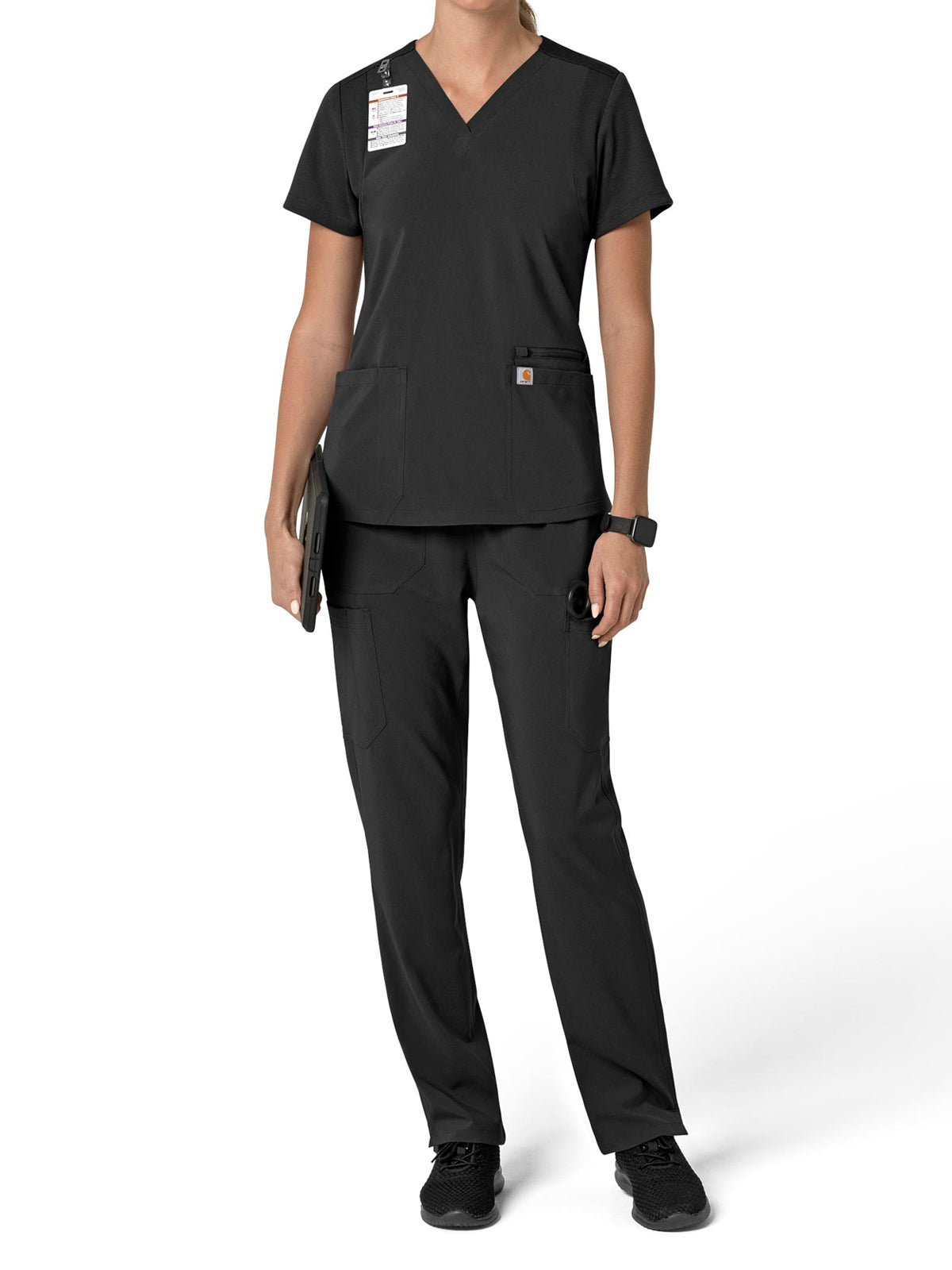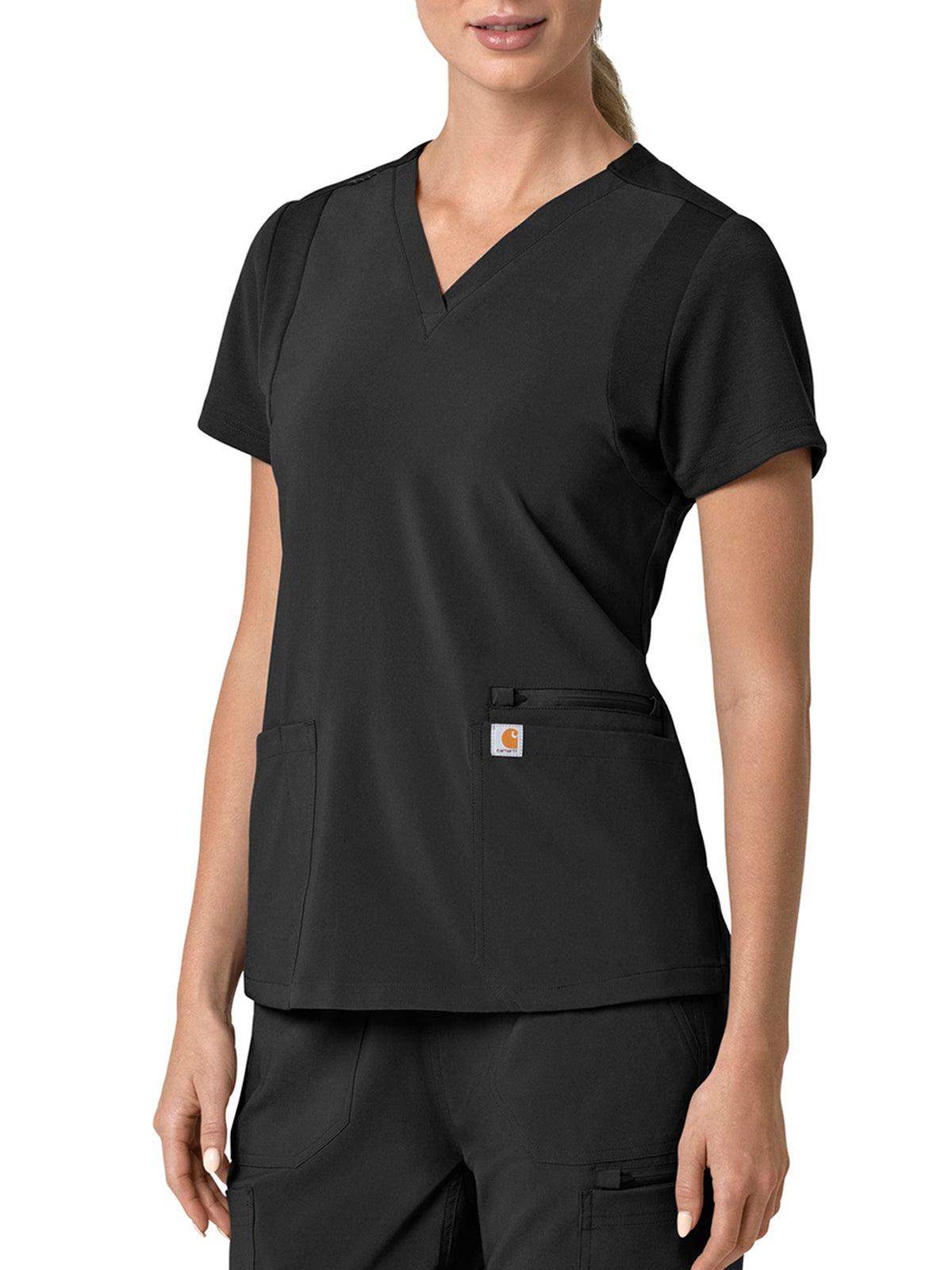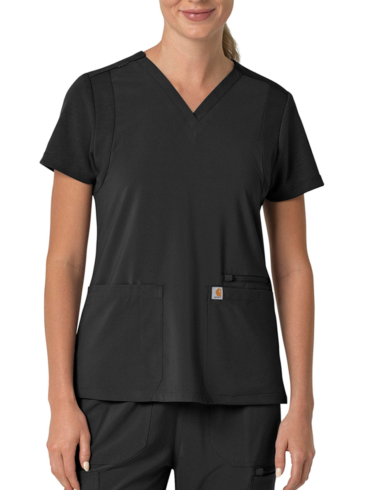 The Carhartt Women's Flex Panel V-Neck Scrub Top, constructed from durable, comfortable polyester material with Carhartt's signature Rugged Flex™ stretch technology. This scrub top ensures unrestricted movement, no matter the task. The rib-knit inserts at the shoulders and sleeves, along with the racerback detail, provide the freedom to move with ease, making your job more manageable. Not only do these scrubs keep you comfortable, but they also enhance your productivity.