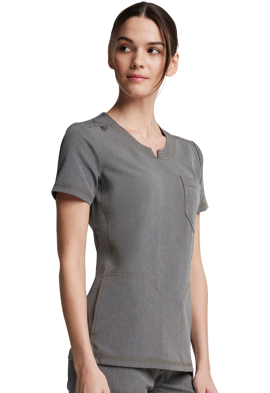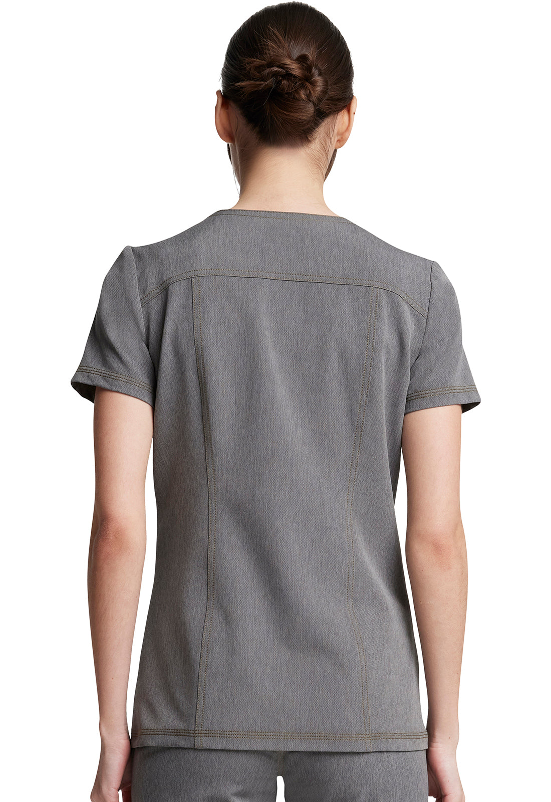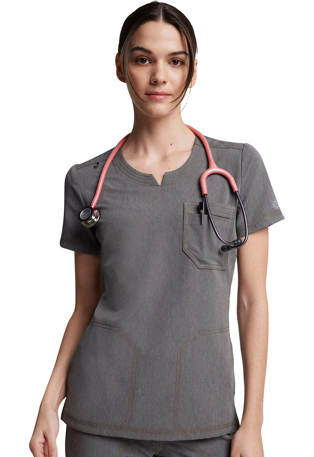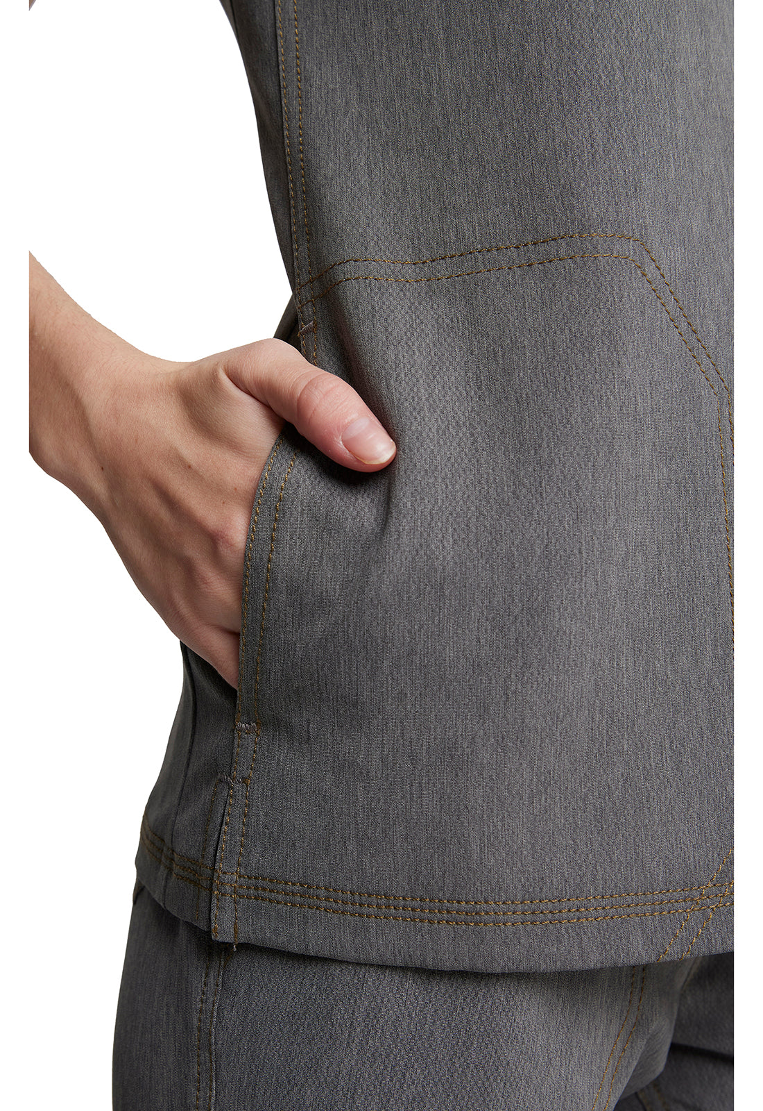 This Contemporary fit notched round neck top has contrast decorative multi-needle stitching throughout. Other features include front yoke seams, a bungee ID badge loop, front and back princess seams, and back yoke seam. There are four pockets: a double chest pocket and two side seam pockets. Front vents complete the look. Center back length: 26".