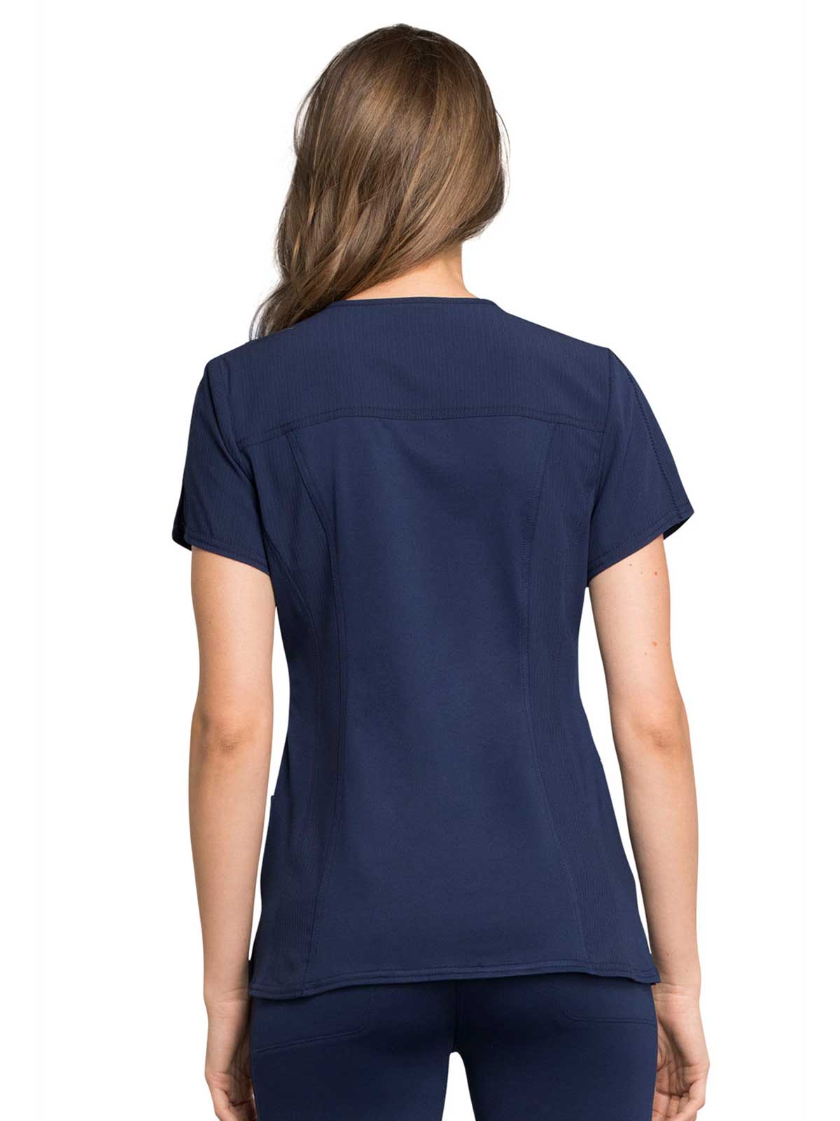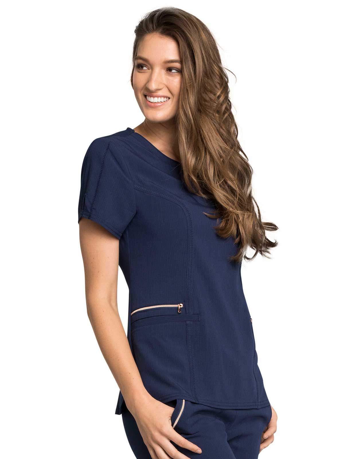 This sophisticated short sleeve top features rose-gold hardware, a curved V-neck, and princess seams at front and back for a slim fit. Knit piecing at the side and center back panels provide added comfort and flexibility. Additional design details include a decorative zig-zag coverstitch at the front seaming, two welt pockets at the waist, a secure zip pocket at the wearer's right, and side vents for ease of movement. Contemporary fit. Center back length: 26". This elegant, linear texture stretch fabric and comfortable jersey knit is a chic pairing for stylish healthcare workers looking to make a STATEMENT.