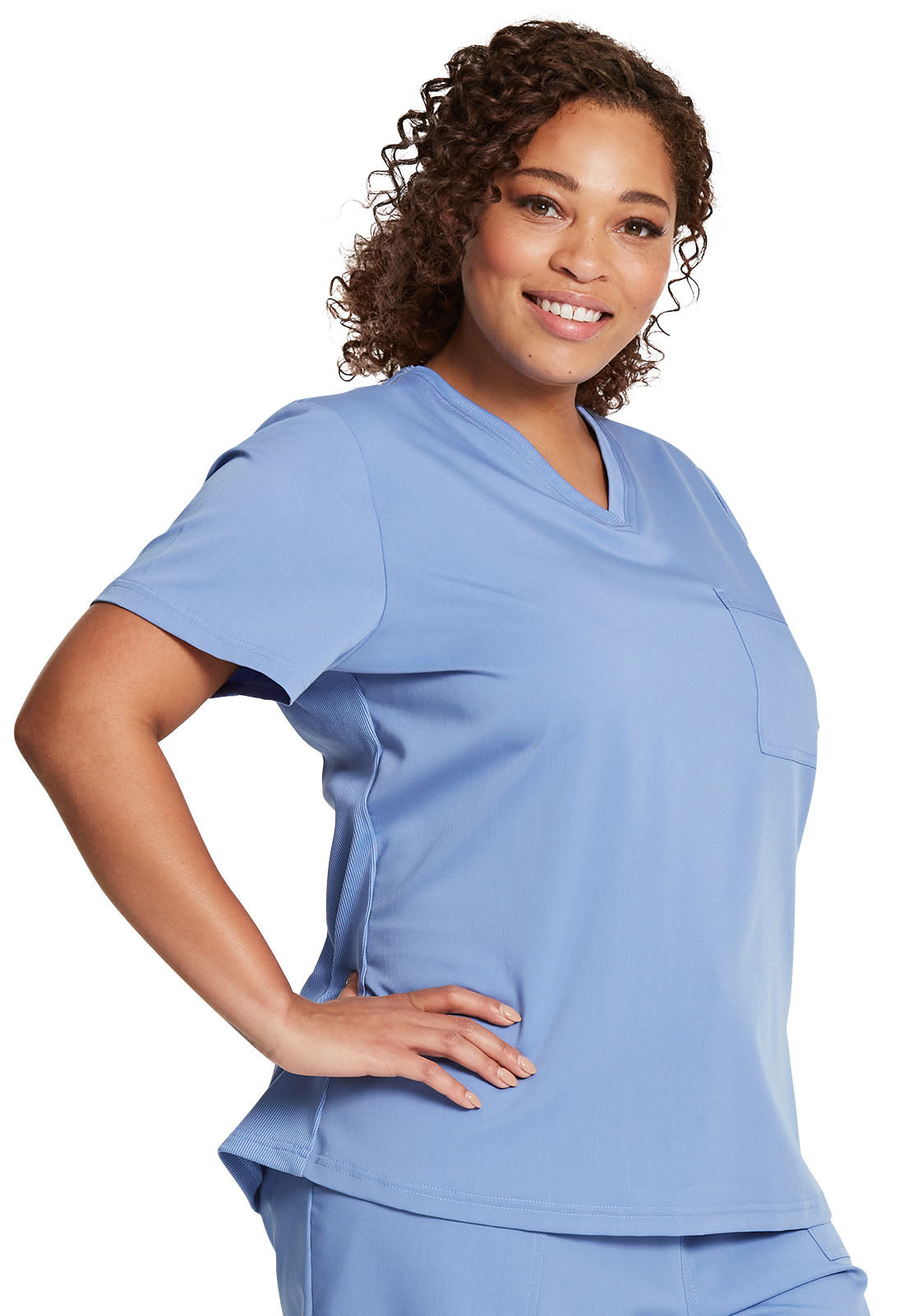 This Contemporary fit V-neck top has one chest pocket and a back yoke seam. There is rib knit at the neckband and back side panels for extra movement and comfort. A shirttail hem completes the look. This style looks great tucked in or untucked. Center back length: 26"