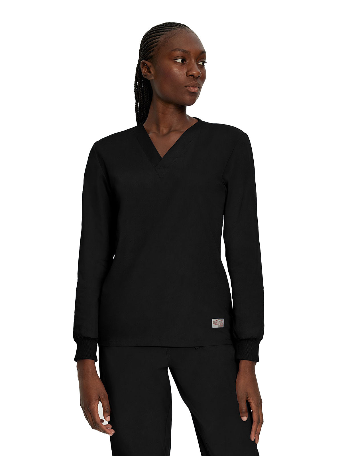 This classic fit, no-pocket scrub top has a flattering crossover neck band and woven label at the left sleeve for a clean, professional look.
