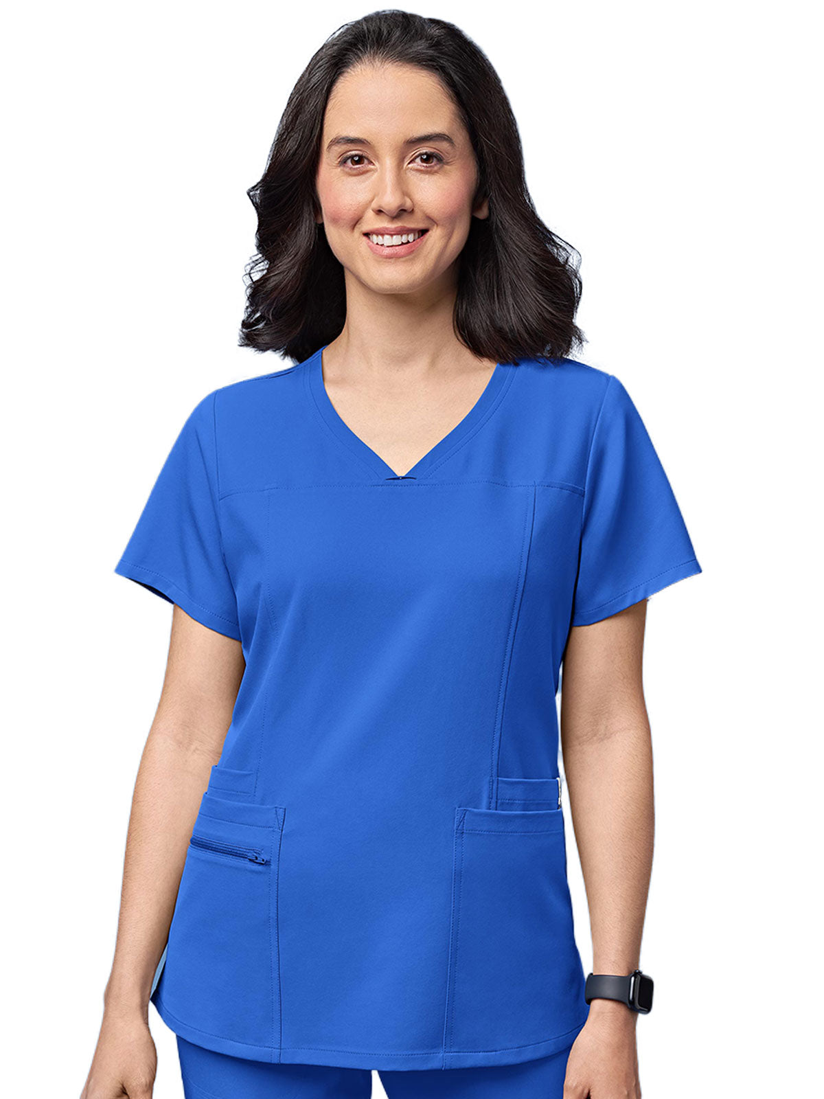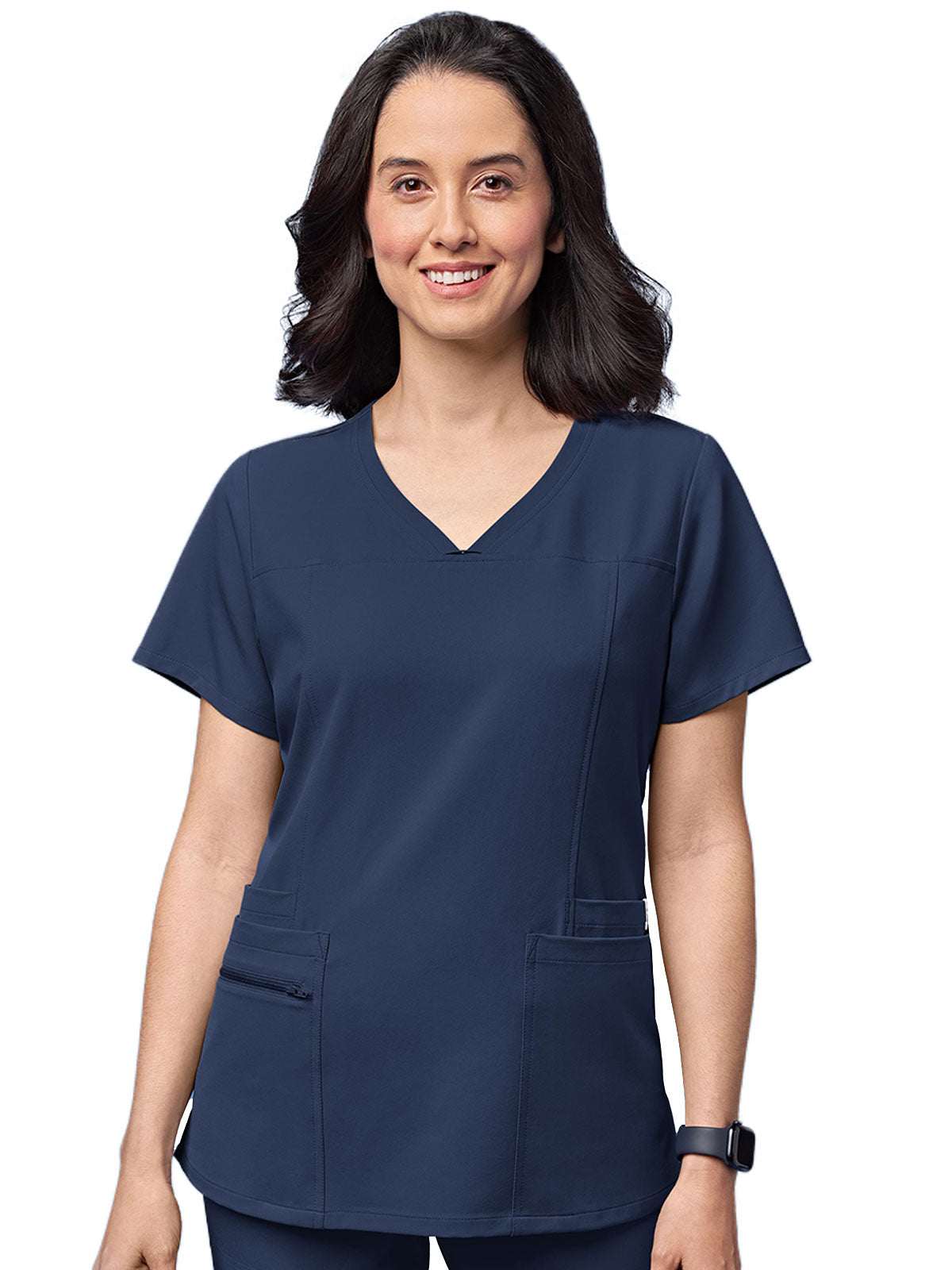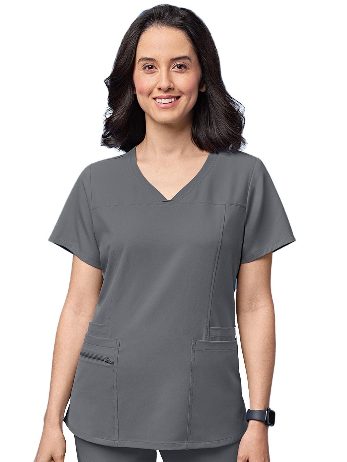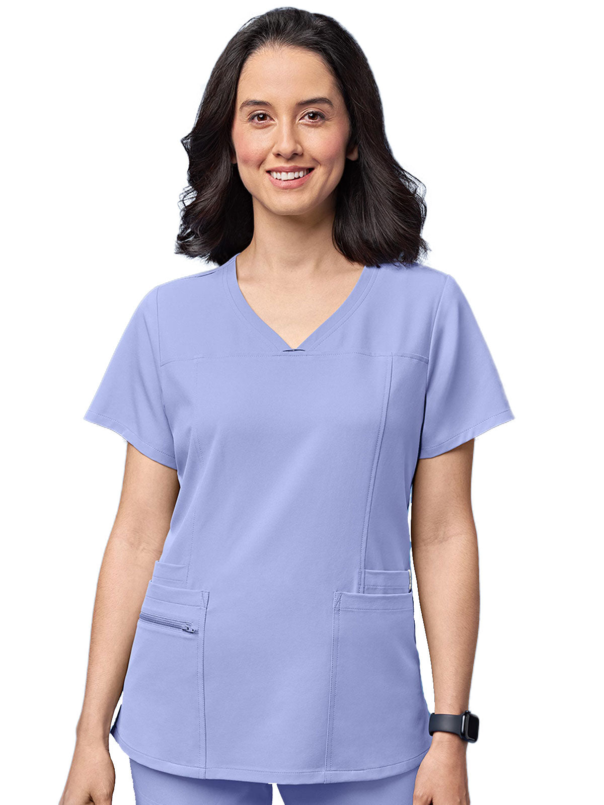 A fashionable update to a uniform favorite, this Med Couture Missy fit v-neck top features a stylized neckline with a dyed-to-match rib-knit inset. There is also a bungee ID badge loop at the neckline on the wearer's left side. Four...