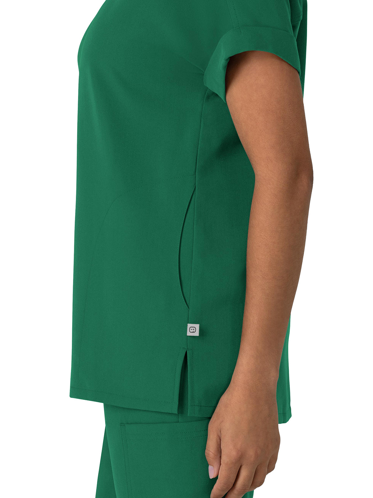 The Wink NOVA collection, it's made with recycled materials, so it treads a little more lightly on the environment than conventional scrubs. In addition to being an Earth-friendly choice, the top is casual and easy to move in, so it checks all the boxes to get you through your shift in comfort. Its modern fit skims the body for a fit that's not too tight and not too loose. The soft, stretchy fabric lets you turn patients, run codes, and adjust wheelchairs. Plus, it's lightweight and breathable, so you stay cool even on tough shifts when the pressure's intense. Drop shoulders give it a relaxed feel, and side vents add extra flexibility. Attach your badge to a loop at the shoulder, and stash your phone, tablet, and supplies in the side pockets.