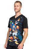 This Unisex fit v-neck print top features twill tape at the neckline, two front patch pockets, a back yoke seam, and side vents. Center back length: 28"