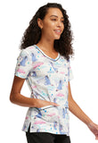 This Unisex fit v-neck print top features twill tape at the neckline, two front patch pockets, a back yoke seam, and side vents. Center back length: 28"