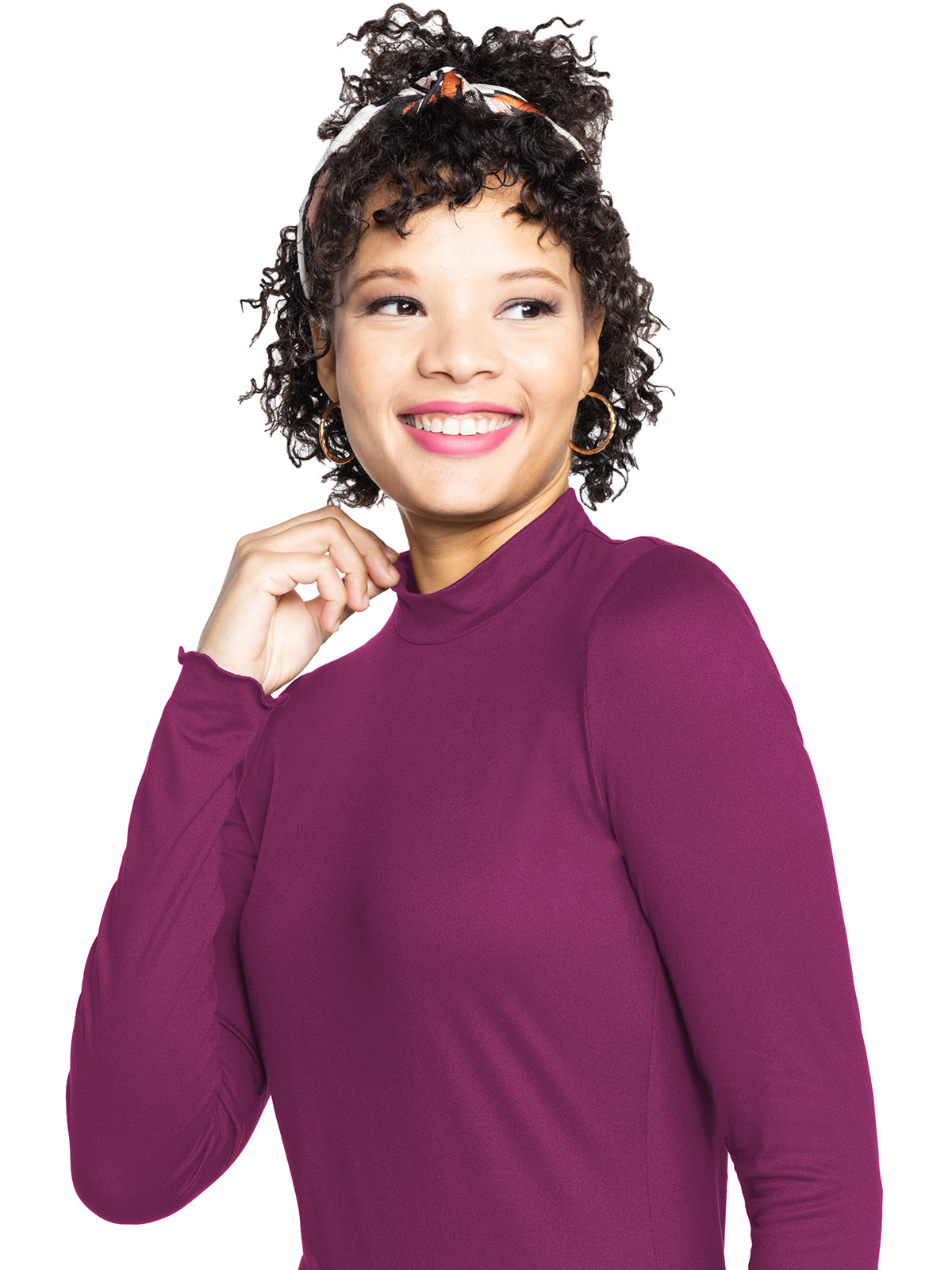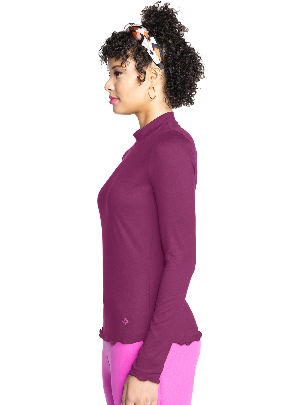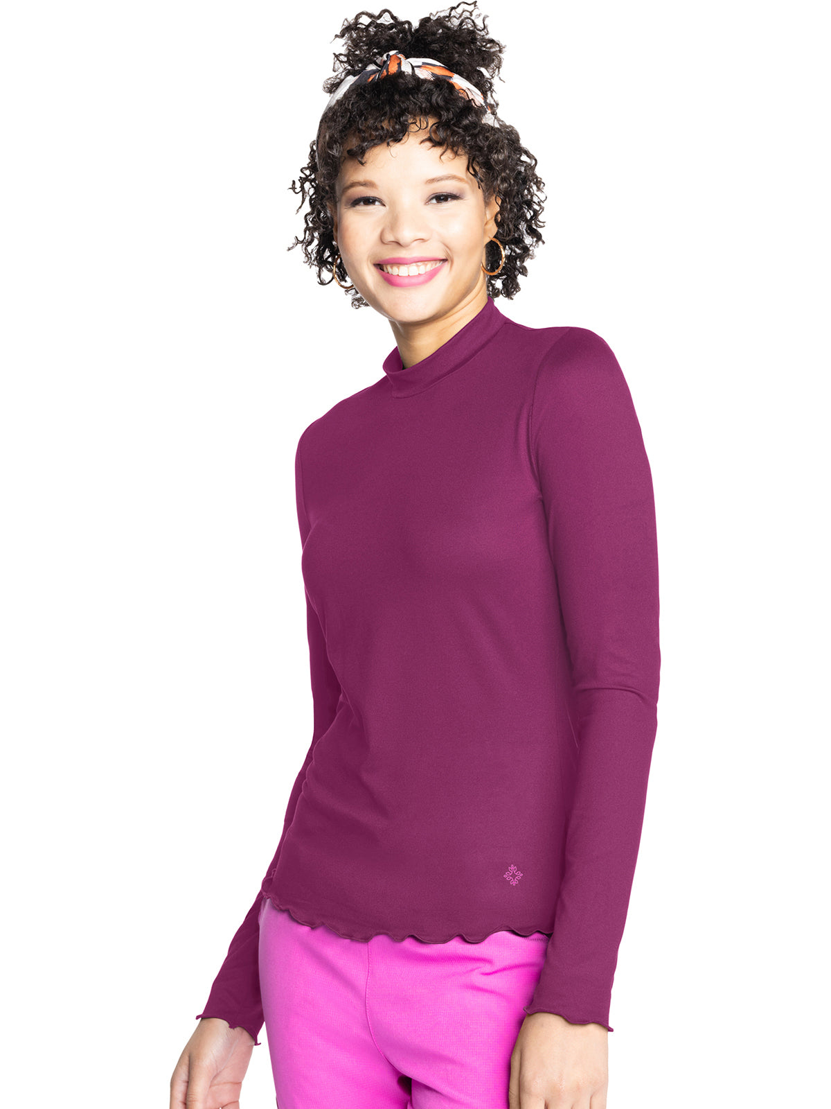 Playful lettuce edging and a contemporary silhouette add modern touches to a classic layering piece. Mock neck and long sleeves are ideal for cool temps. A curved hem finishes this fashionable knit tee. Missy fit. Center back length: 25"