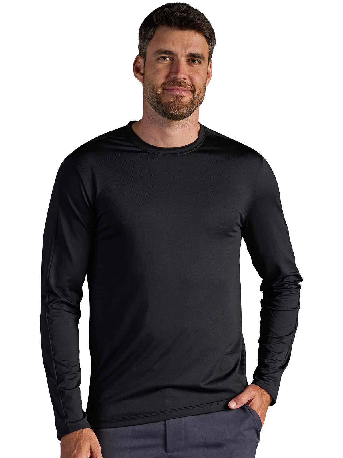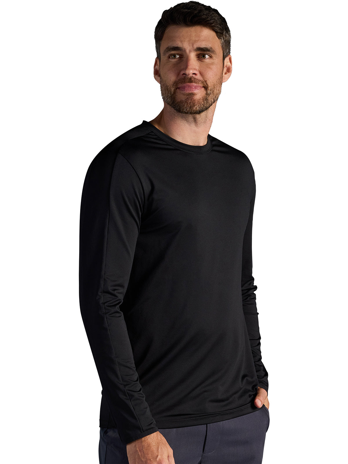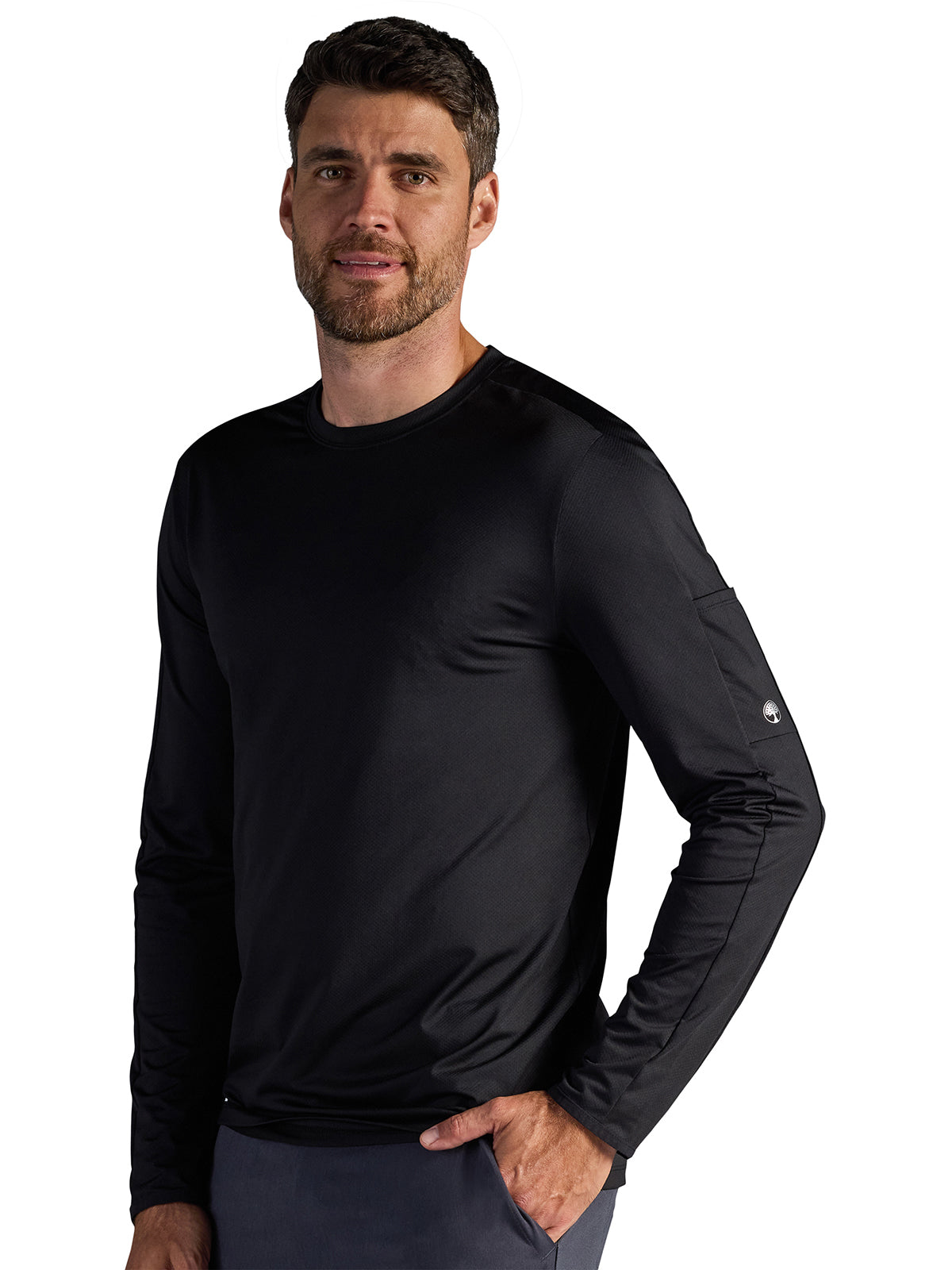 With work-to-weekend approved styling, the Healing Hands x Dr. Kwane Men's Vaughn long sleeve tee shirt is sure to please. The pique knit performance tee has a crew neck, one pocket on the wearer's upper left sleeve, and racer-style sleeve panels. The long sleeves are finished with elasticized cuffs which stay in place when pushed up (great for frequent hand washing). Modern fit. Center back length: 29"