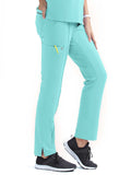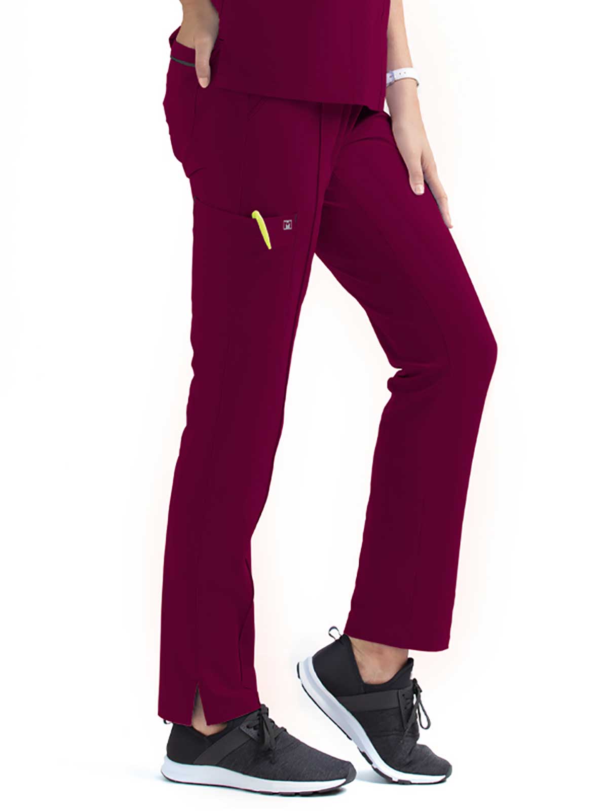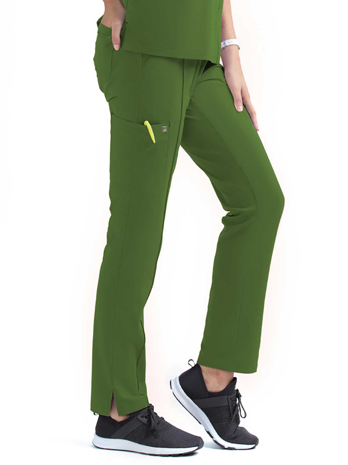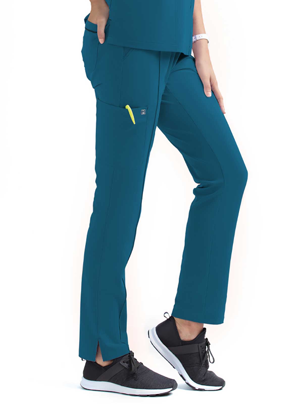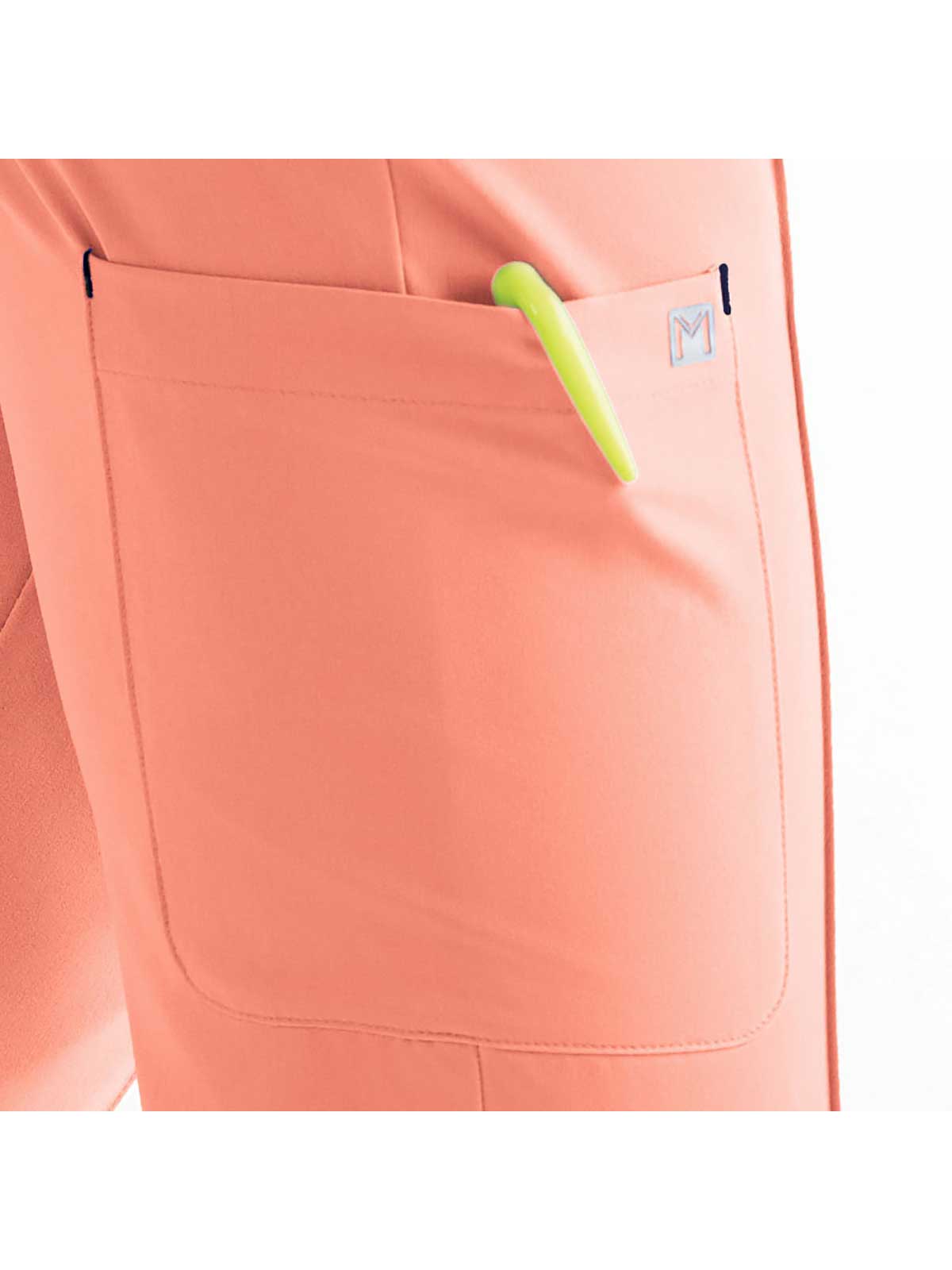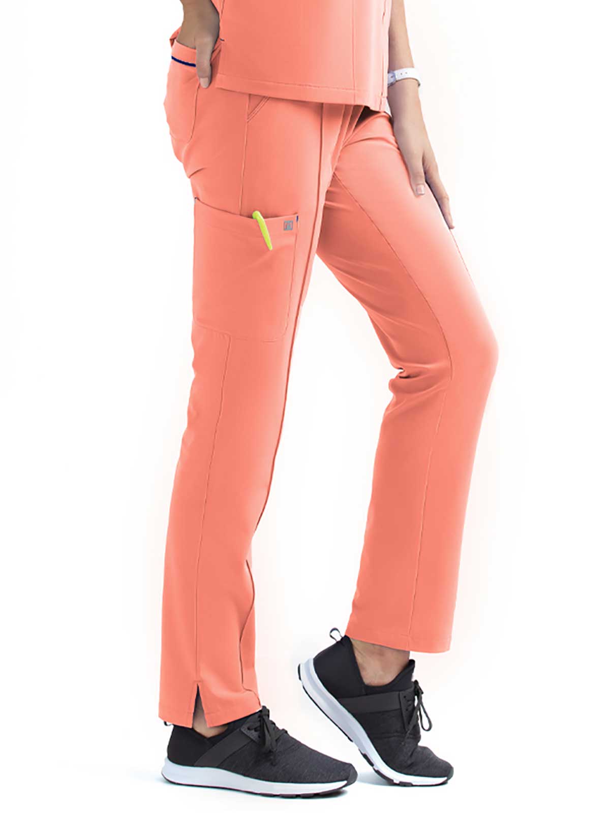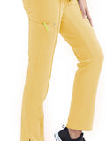 "*Women's full elastic waistband pants with tapered leg *Self fabric dyed-to-match inner drawstring *Two slant pockets *One cargo patch pocket *Two back patch pockets with contrast piping *Front vertical seams for added style and shape *Decorative contrast/DTM stitches - Side slits"